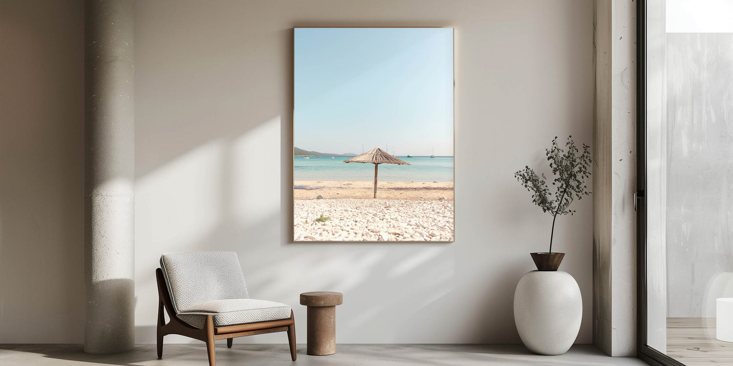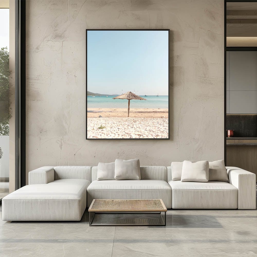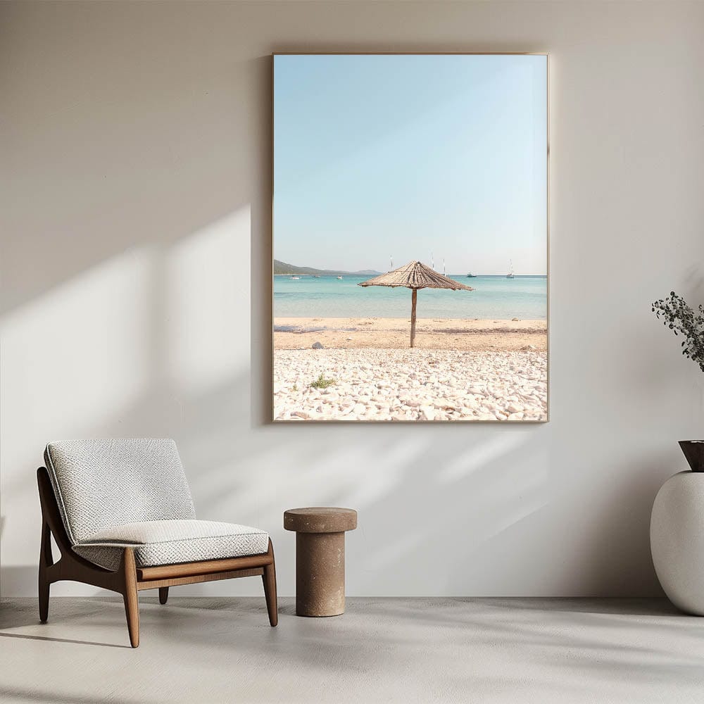 Capture the essence of a serene summer day with this tranquil beach wall art. Featuring a solitary umbrella on a pristine shore with calm turquoise waters and soft skies, this artwork evokes a sense of relaxation and simplicity. Its subtle beige and blue tones make it a perfect piece for vacation-inspired or seasonal home decor, offering a peaceful coastal vibe.