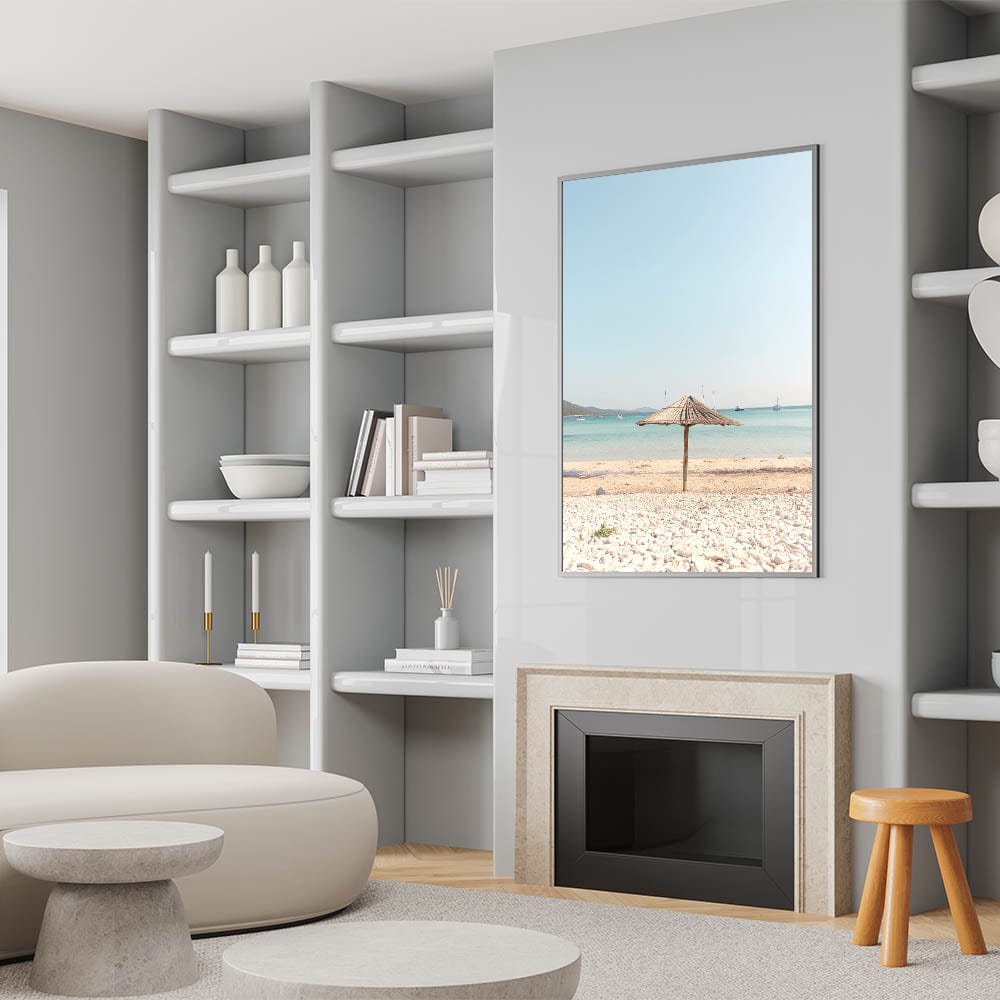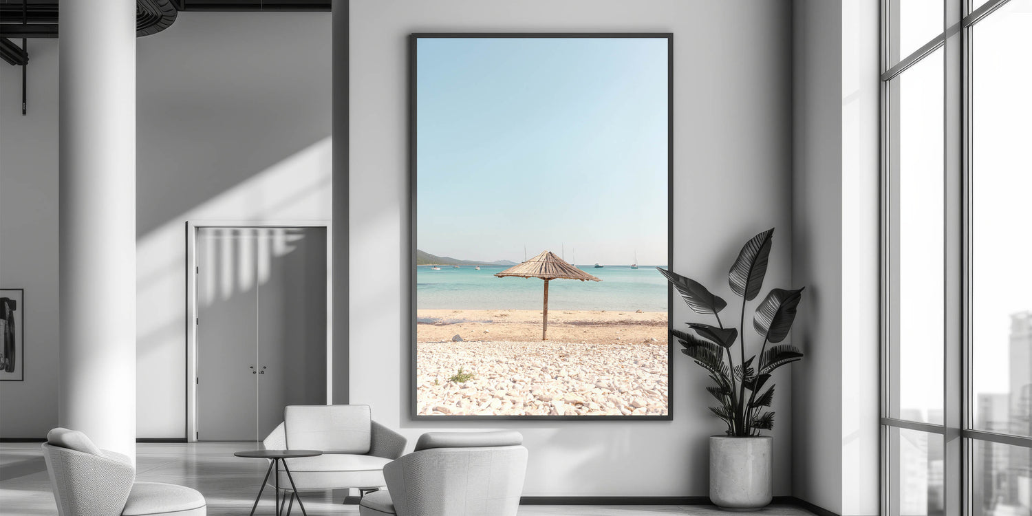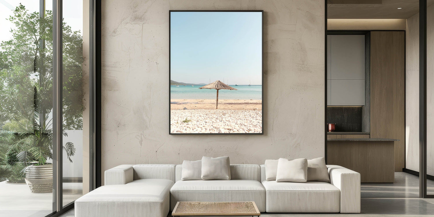 Capture the essence of a serene summer day with this tranquil beach wall art. Featuring a solitary umbrella on a pristine shore with calm turquoise waters and soft skies, this artwork evokes a sense of relaxation and simplicity. Its subtle beige and blue tones make it a perfect piece for vacation-inspired or seasonal home decor, offering a peaceful coastal vibe.