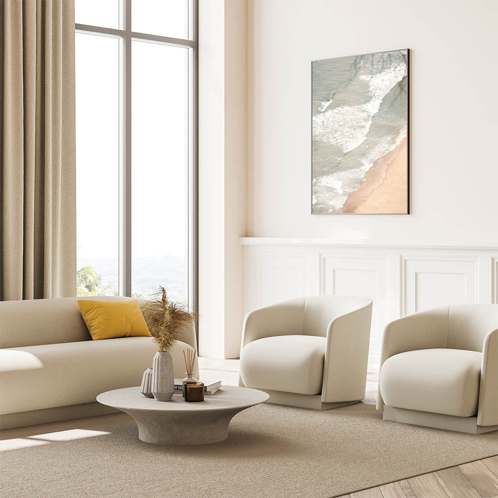 Experience the peaceful beauty of the coast with this stunning summer wall art featuring soft ocean waves gently washing onto a smooth sandy shore. The muted beige and gray-blue tones create a relaxing, minimalist aesthetic, making this summer canvas art a perfect addition to beach-inspired, modern, and nature-focused interiors. Whether displayed in a living room, bedroom, or office, this artwork brings a sense of serenity and calmness to your space.