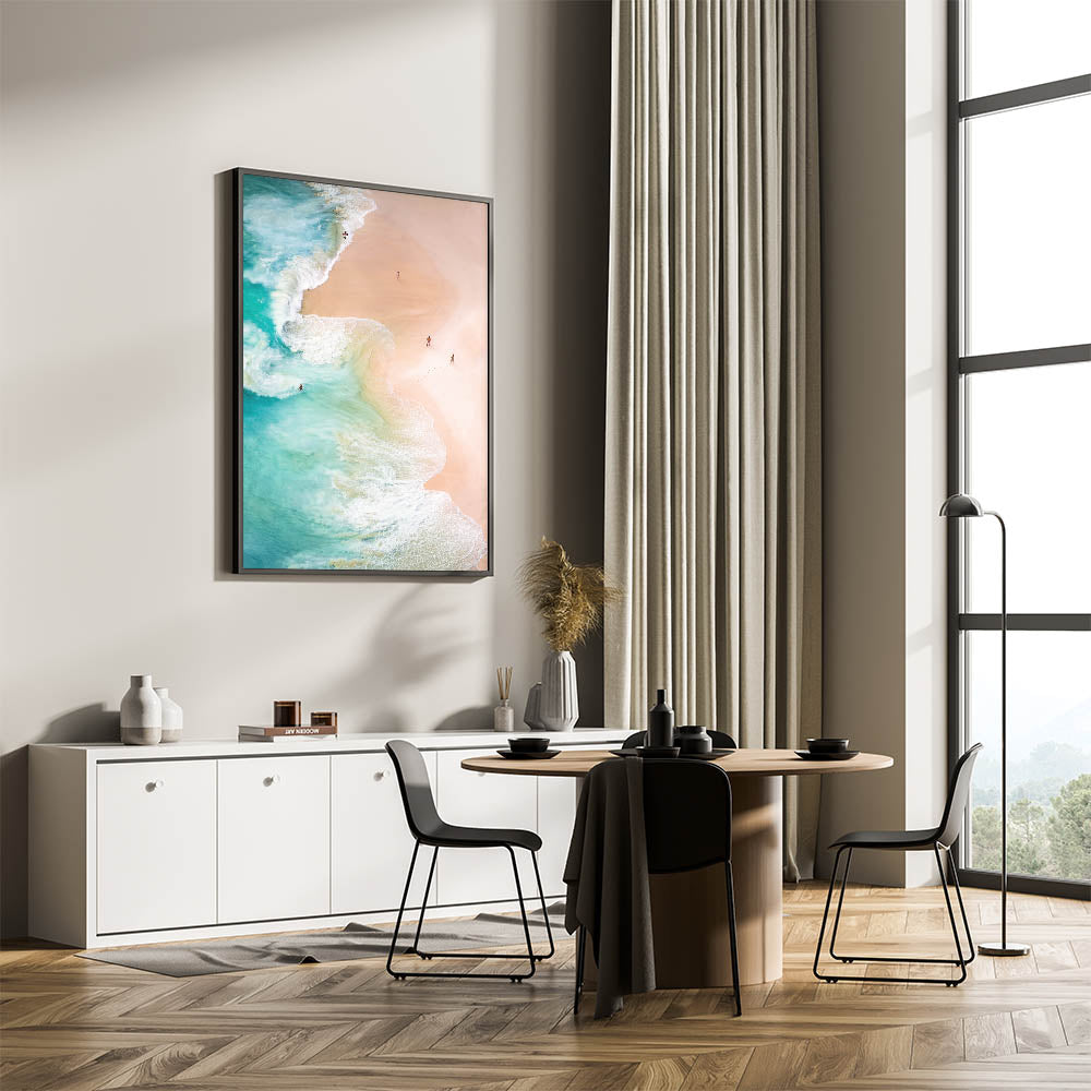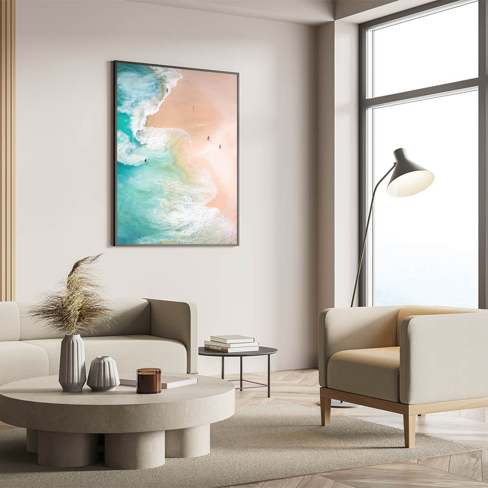 Experience the breathtaking beauty of a tropical paradise with this tropical wall art, capturing an aerial view of waves gently washing onto a golden sandy beach. The soft pastel tones of the sand contrast beautifully with the vibrant turquoise waters, creating a refreshing and relaxing atmosphere. This summer canvas art is perfect for anyone who loves the ocean, making it a great addition to beach homes, modern interiors, and coastal-themed decor.