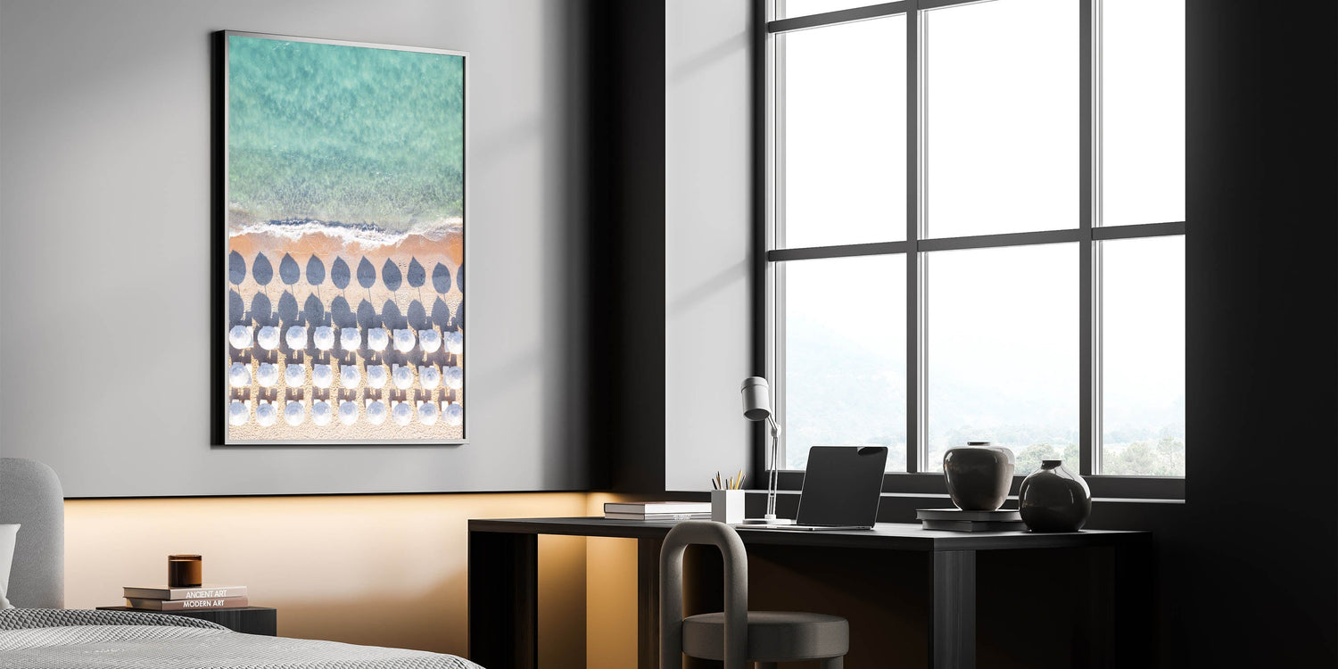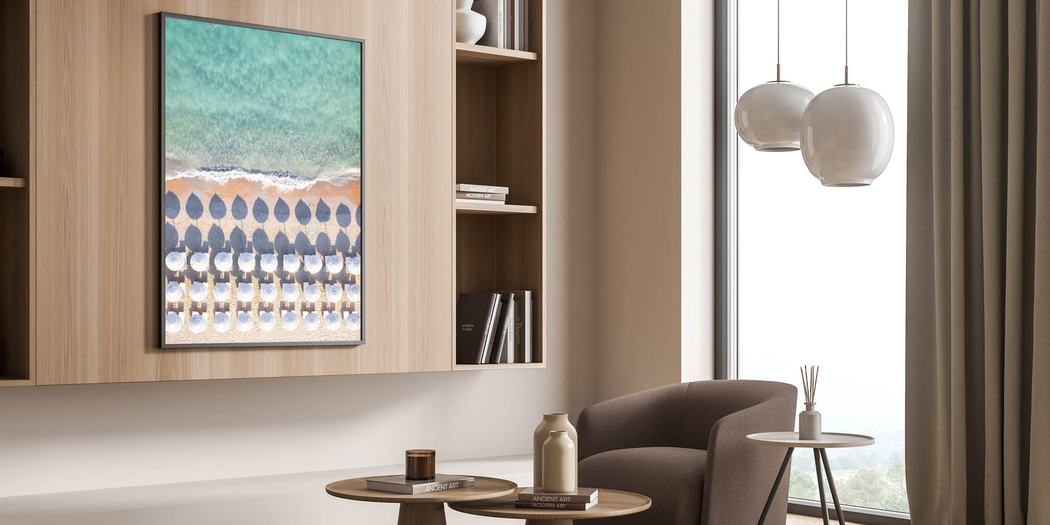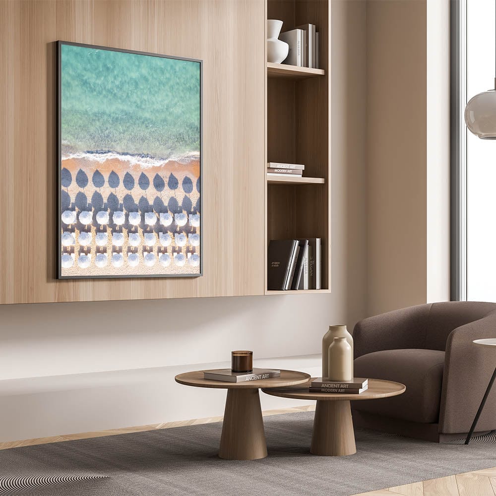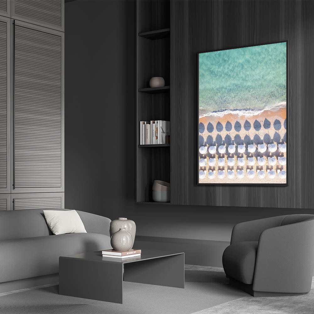 Bring the captivating beauty of a sunlit beach into your space with this stunning Tropical Wall Art featuring an aerial view of neat rows of umbrellas casting soft shadows on golden sands. The turquoise waves gently kiss the shore, creating a harmonious blend of colors and textures that evoke the serene charm of summer days. Perfect for enhancing your seasonal home decor or coastal-themed interiors, this artwork adds elegance and tranquility to any room.