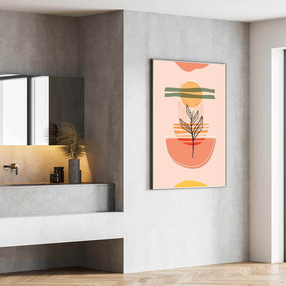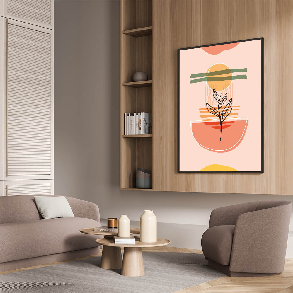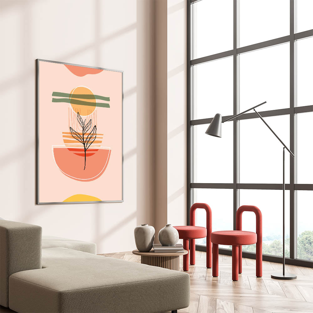 This stunning abstract bohemian wall art features a combination of earthy tones and natural elements, making it the perfect addition to your boho chic or modern interior. The artwork showcases an elegant plant silhouette, paired with warm hues of yellow, orange, and peach, symbolizing the harmony between nature and artistic expression. The sun-inspired design brings warmth and positivity, ideal for creating a peaceful and welcoming atmosphere in any room.