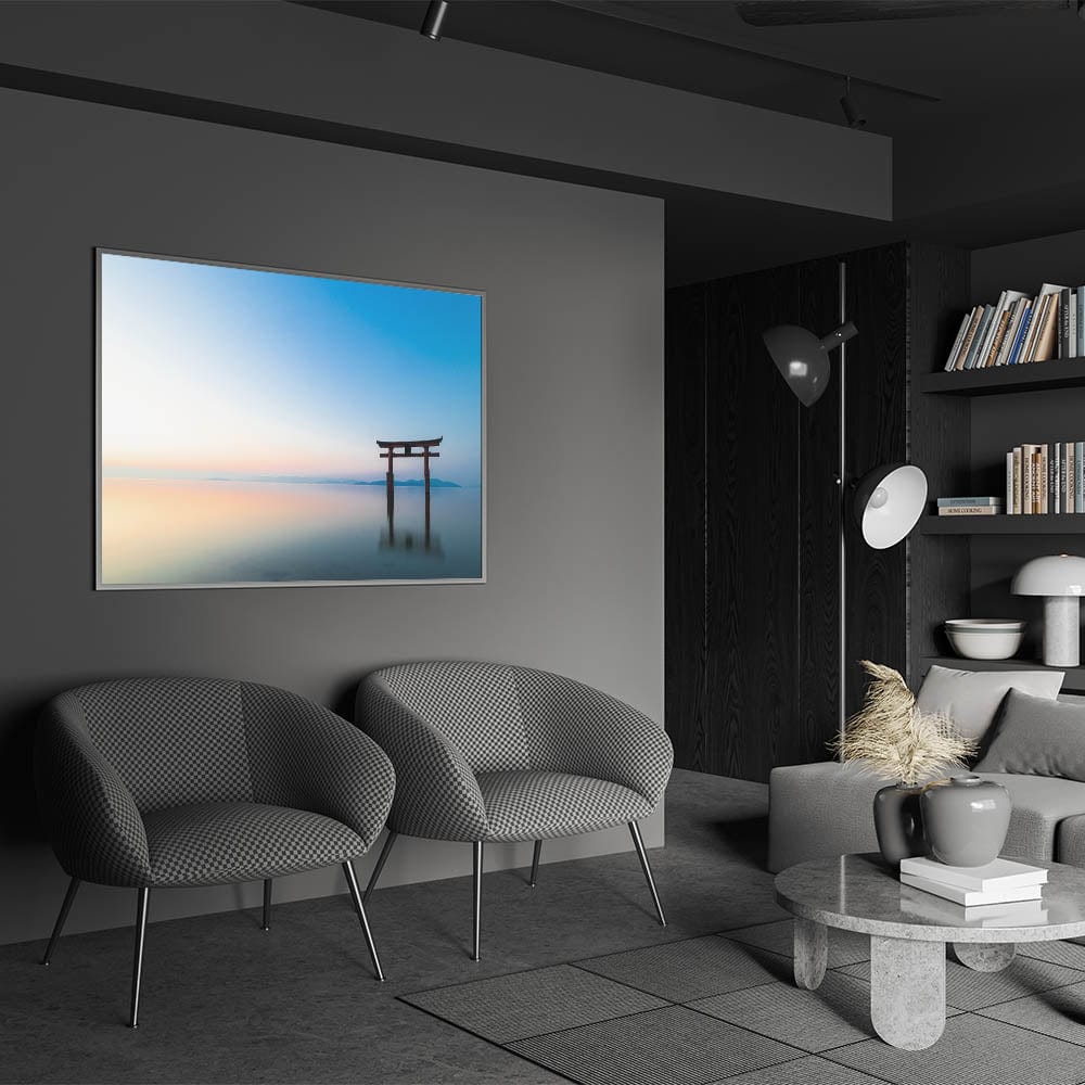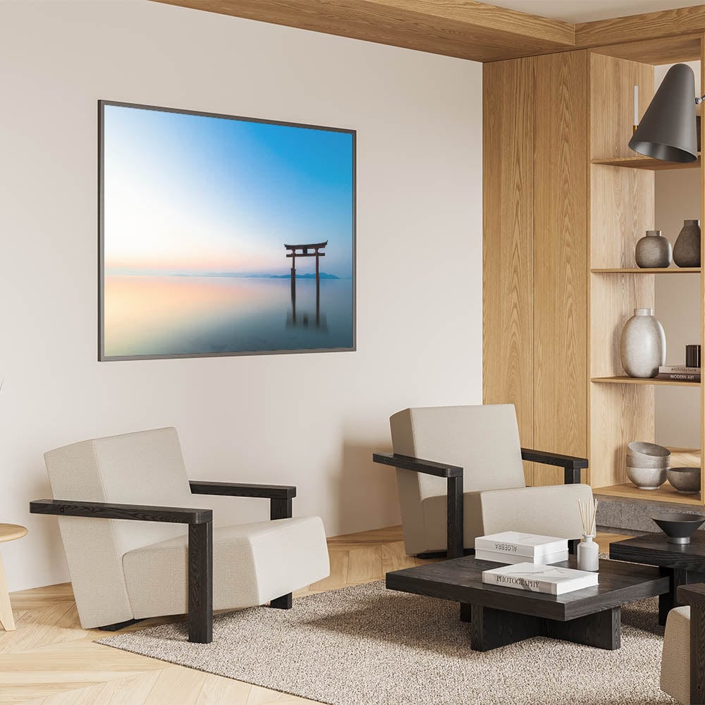 Invite stillness and symbolism into your space with this Abstract Minimalist Landscape Painting featuring a torii gate standing peacefully in mirrored water. Set against a soft gradient sky in tones of blue and peach, this composition blends traditional beauty with minimalist serenity.