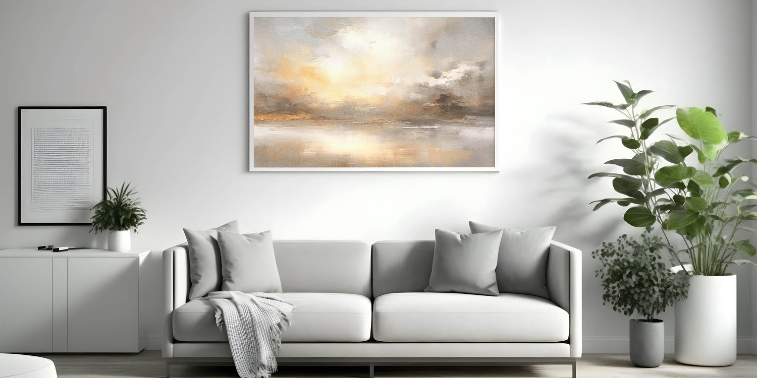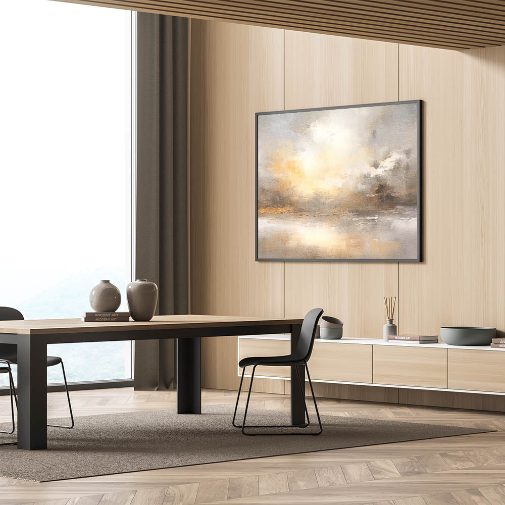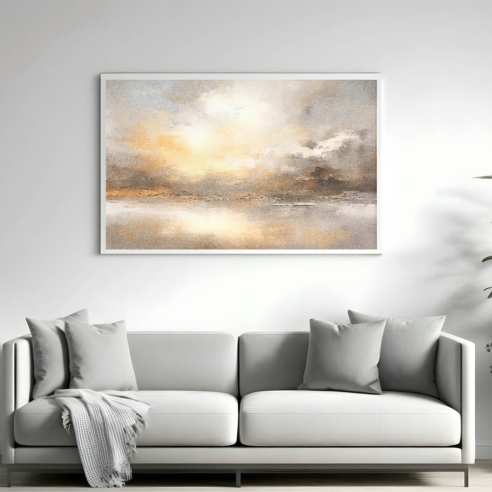 Infuse your space with the warmth and beauty of a golden sunset captured in this abstract landscape artwork. With soft blends of yellow, beige, and gray tones, this piece portrays a serene sky and subtle cloud formations, creating a mesmerizing, dreamlike scene. Ideal for adding warmth and elegance, this artwork complements a variety of decor styles, from modern to rustic.