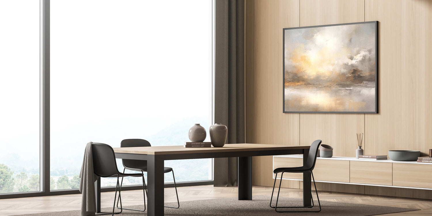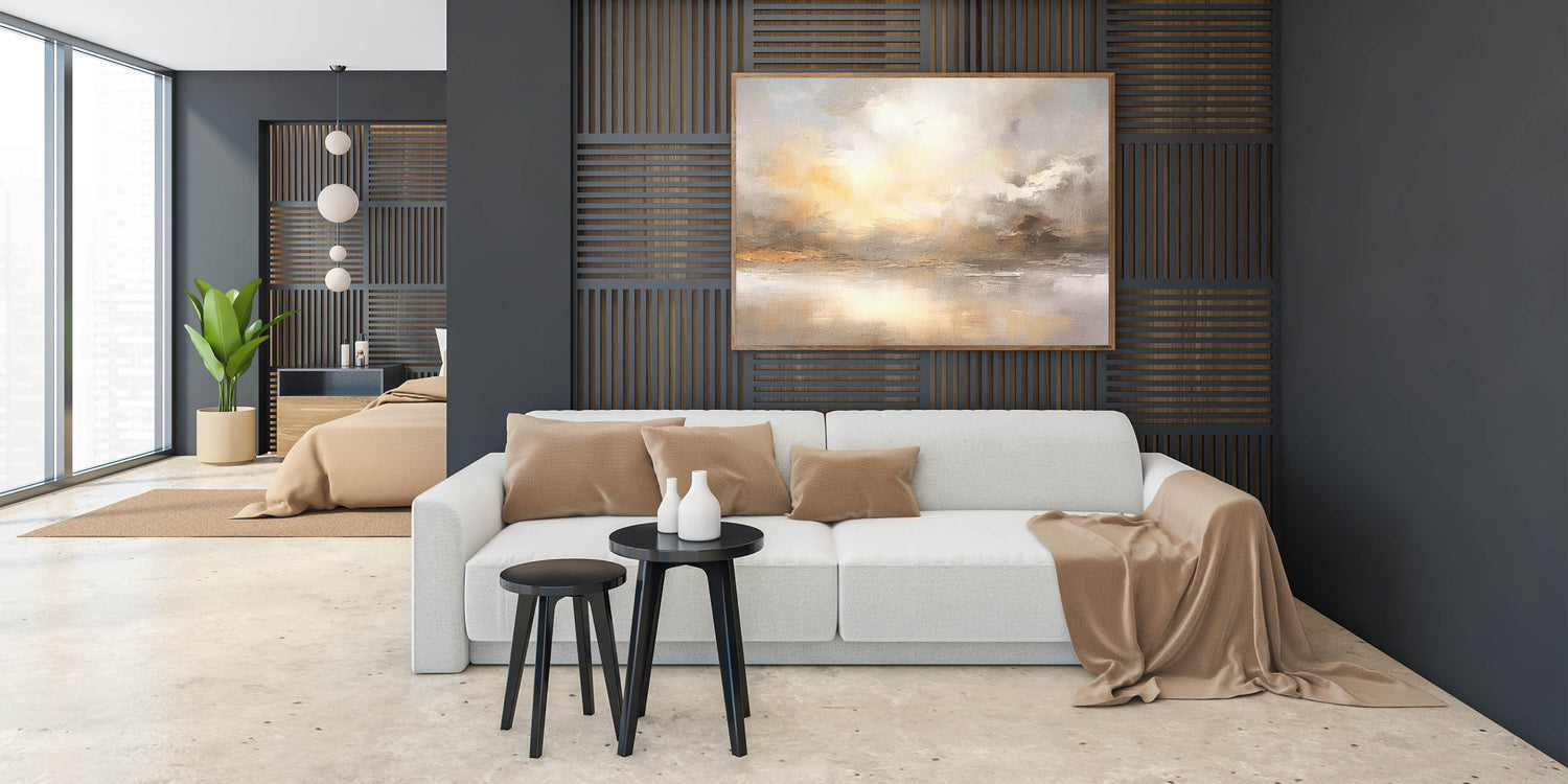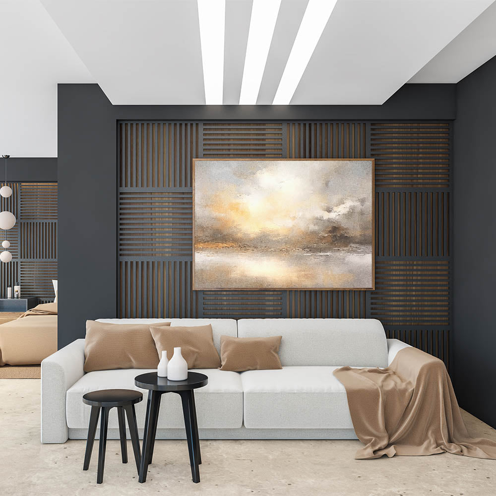 Infuse your space with the warmth and beauty of a golden sunset captured in this abstract landscape artwork. With soft blends of yellow, beige, and gray tones, this piece portrays a serene sky and subtle cloud formations, creating a mesmerizing, dreamlike scene. Ideal for adding warmth and elegance, this artwork complements a variety of decor styles, from modern to rustic.