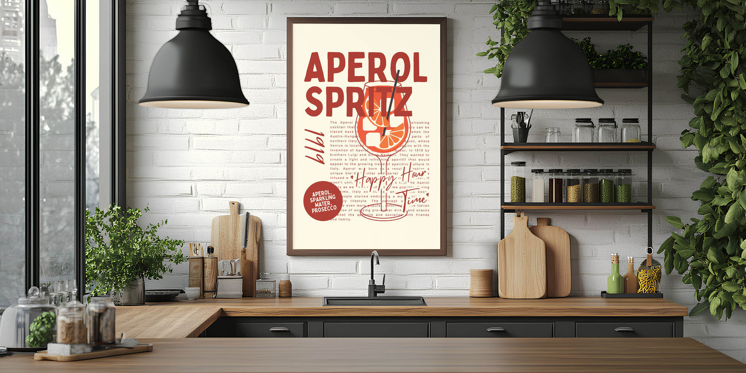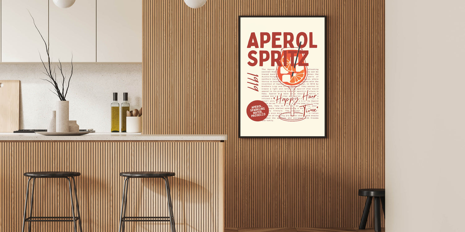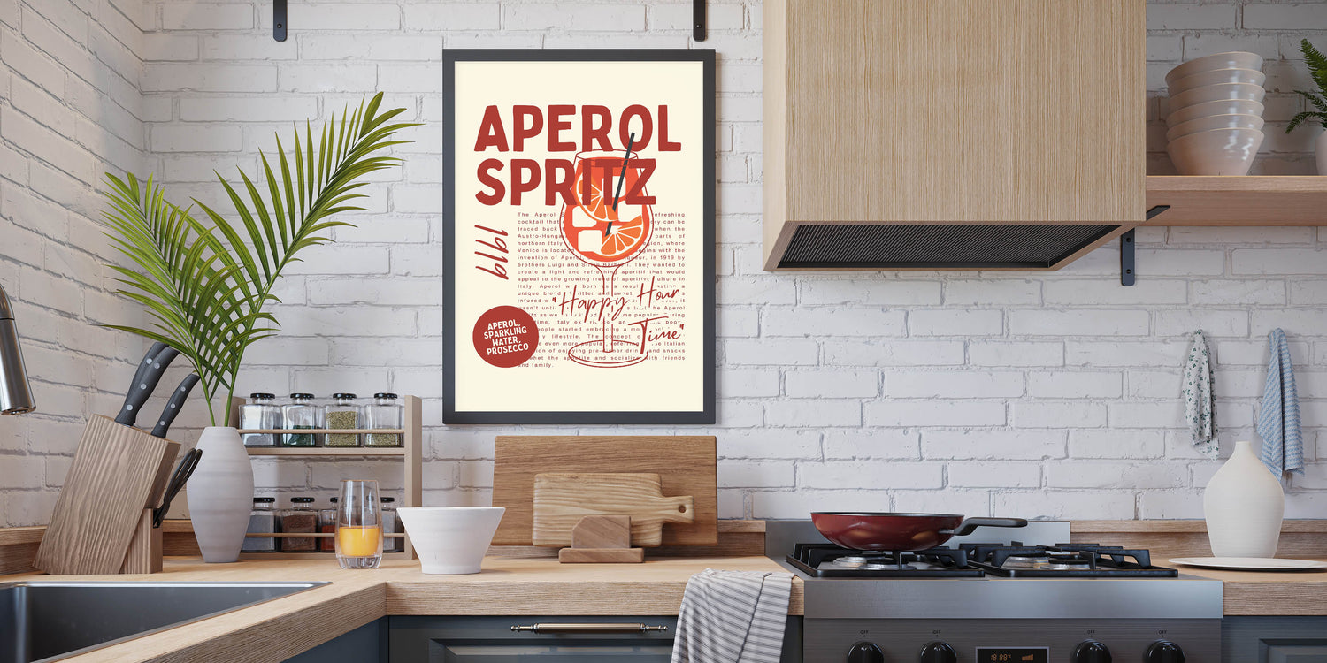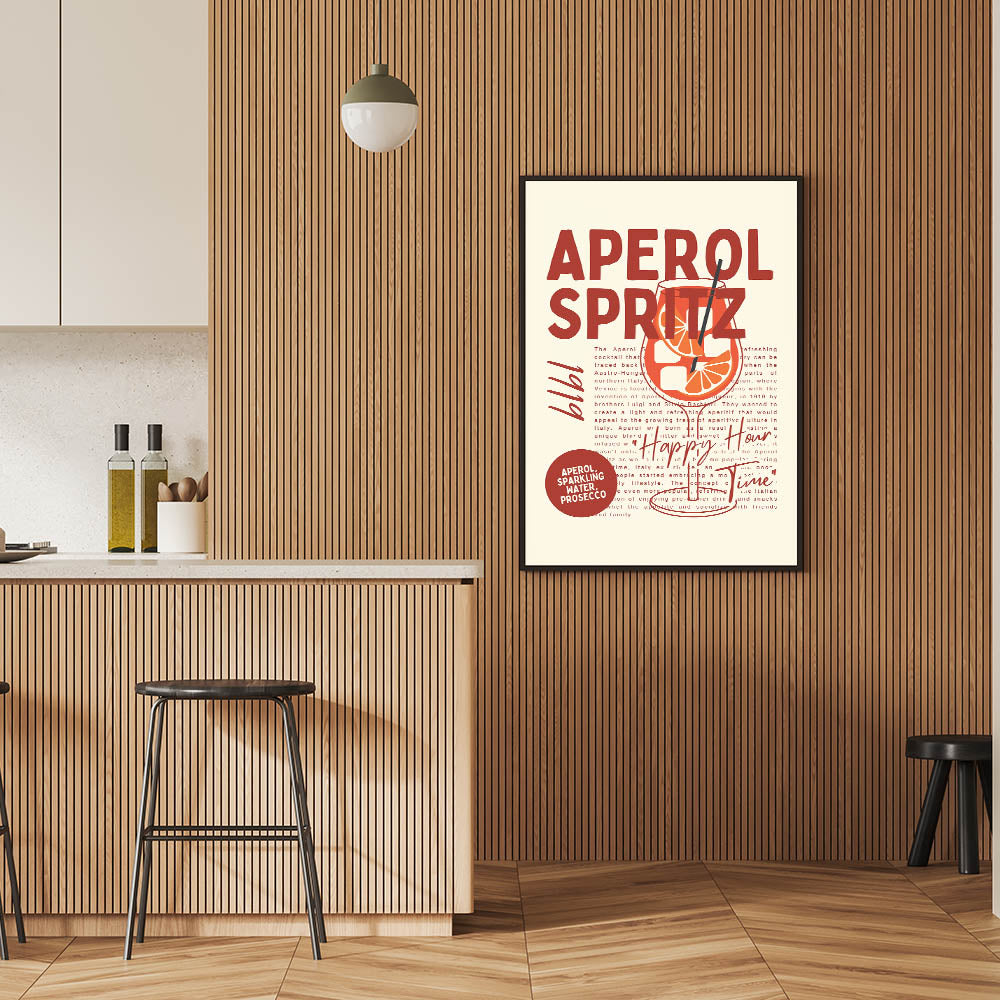 Brighten up your kitchen decor or home bar with this stylish Aperol Spritz cocktail wall art. Featuring a bold orange and beige color scheme, this beverage wall art captures the essence of a refreshing Aperol Spritz with citrus slices and bubbly prosecco. The combination of vibrant typography and a sleek cocktail illustration makes this bar decor piece a must-have for mixology lovers.