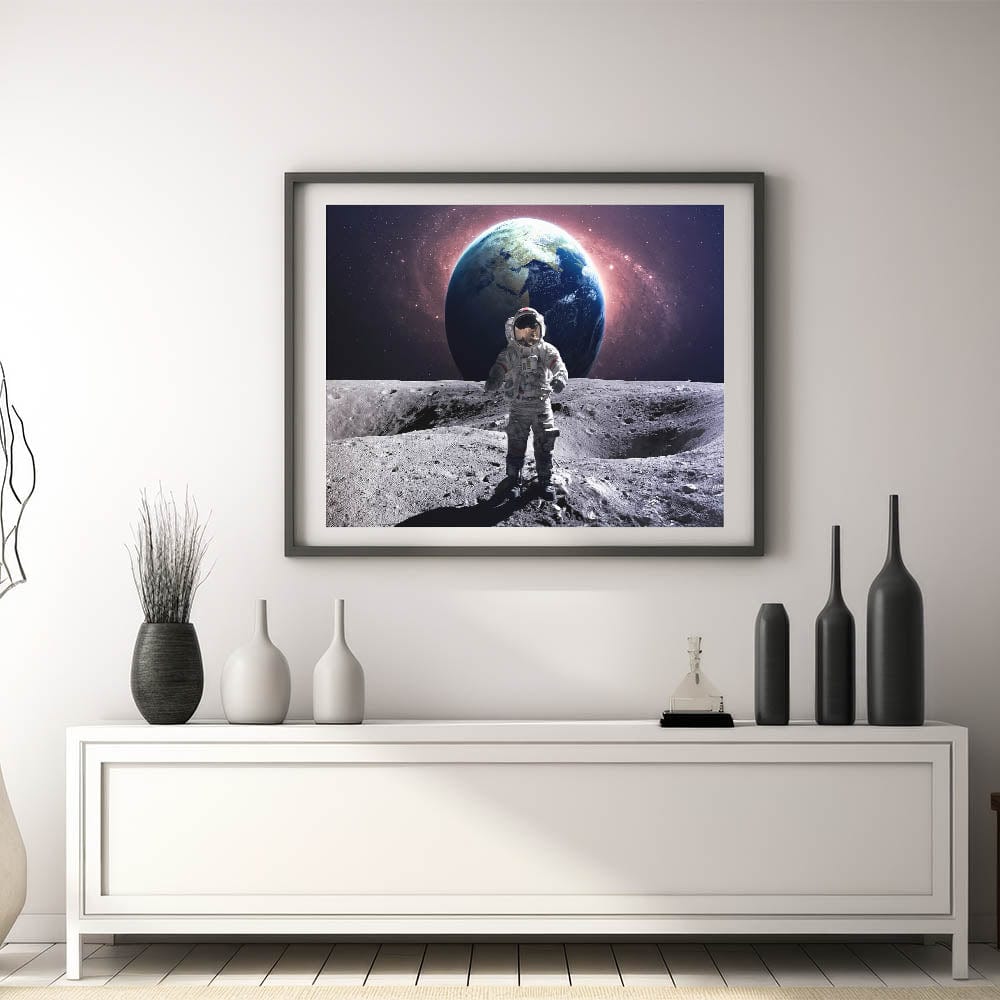 Bring the beauty and vastness of space into your home with this stunning astronaut wall art, featuring an astronaut on the lunar surface with a captivating view of Earth and a breathtaking galaxy backdrop. This high-quality astronaut artwork is the perfect addition to any space lover’s collection, combining cosmic wonder with an adventurous spirit. The sharp contrast between the lunar landscape and the vibrant universe creates a visual masterpiece.