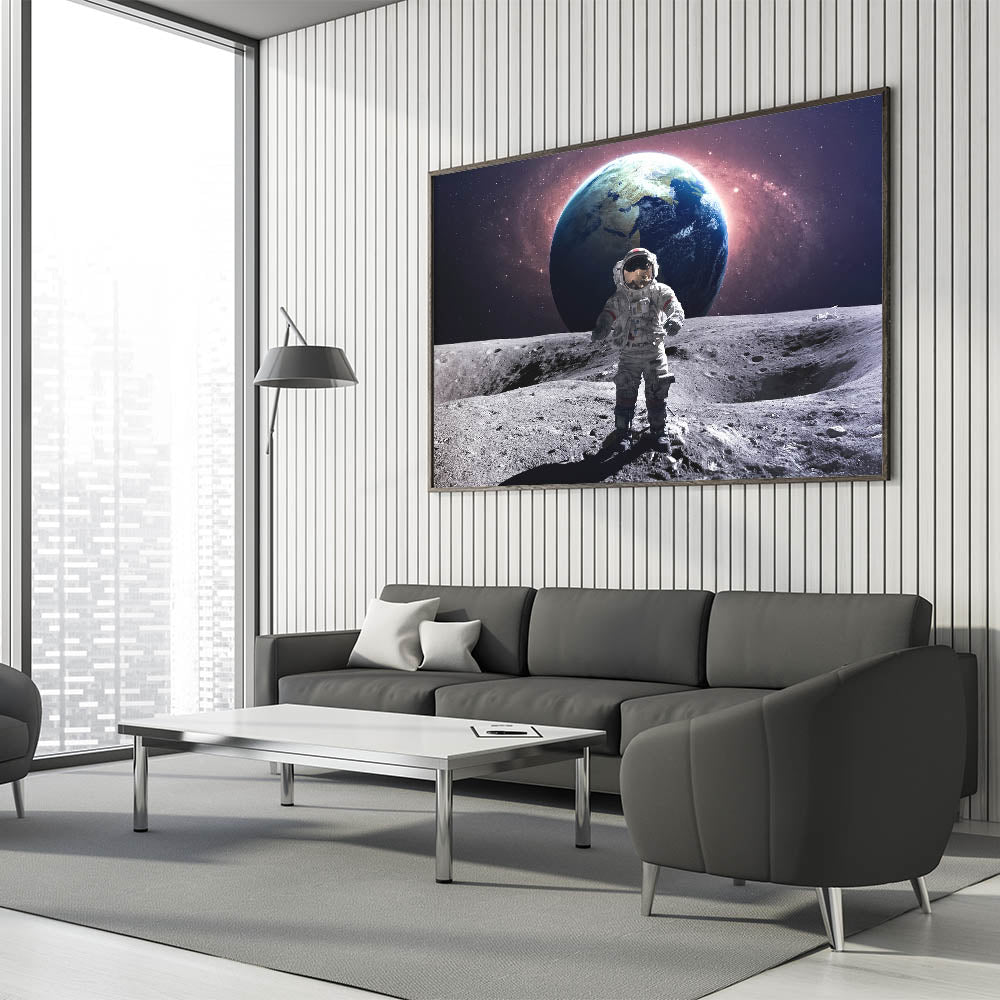 This unique astronaut canvas art allows you to experience the wonders of space exploration right in your home. The combination of the dark lunar tones with the vibrant Earth and galaxy makes this piece a true standout in any room, making it a must-have for those who are fascinated by the mysteries of the cosmos.