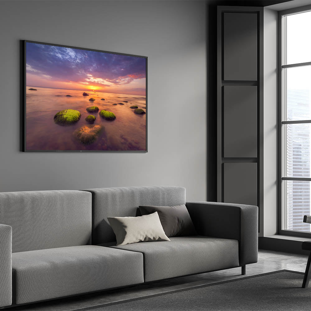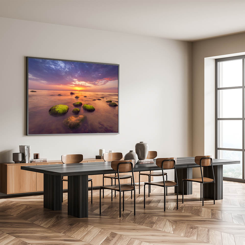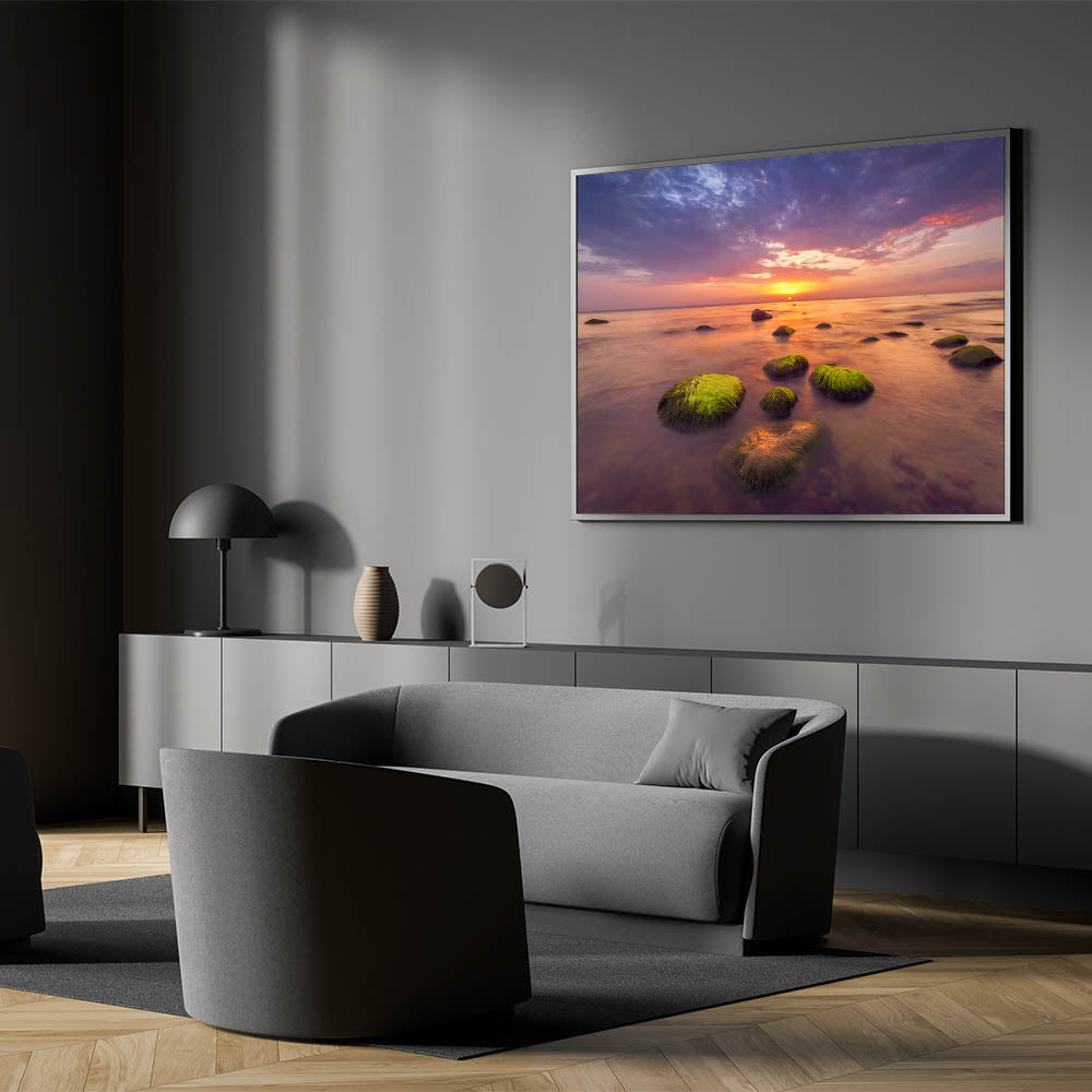 This breathtaking wall art captures the peaceful beauty of the Baltic Sea during a serene sunset. The vibrant colors of the sky reflect off the calm waters, with green moss-covered rocks adding a unique, natural touch to the foreground. This stunning piece of Lithuania wall art perfectly showcases the tranquility and beauty of the Baltic region, making it ideal for any space that seeks to evoke calmness and connection to nature.