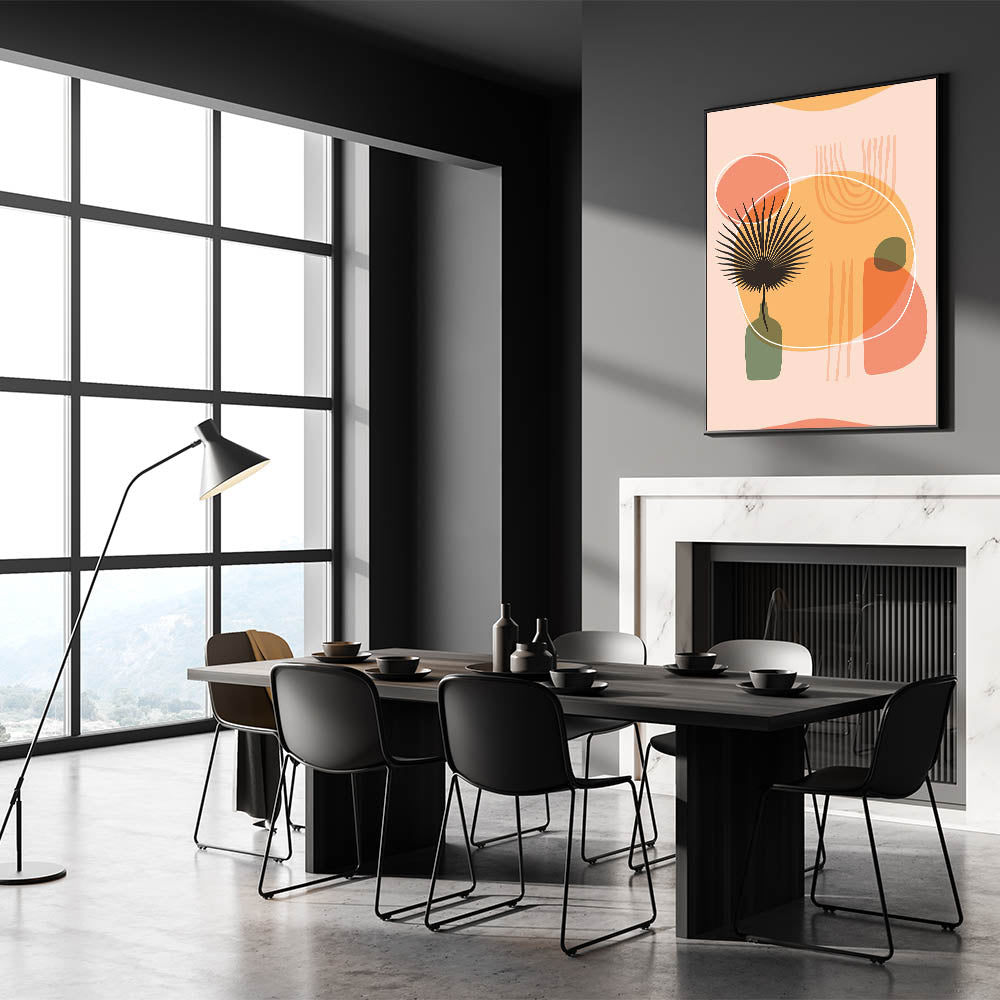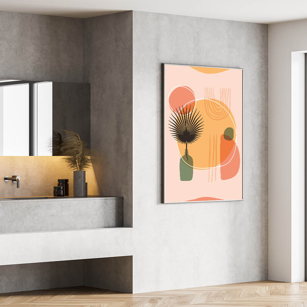 Add a warm and serene vibe to your space with this abstract bohemian wall art, featuring earthy tones and nature-inspired elements. The design showcases an artistic blend of orange, peach, and olive green, reminiscent of a sunset and organic shapes. The striking silhouette of a palm leaf adds a touch of nature, making this artwork perfect for modern boho and eclectic interiors.