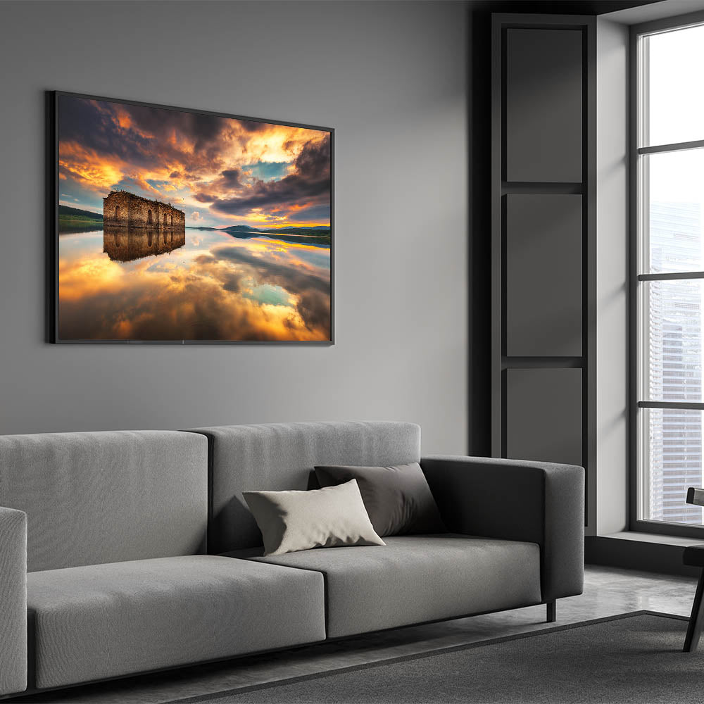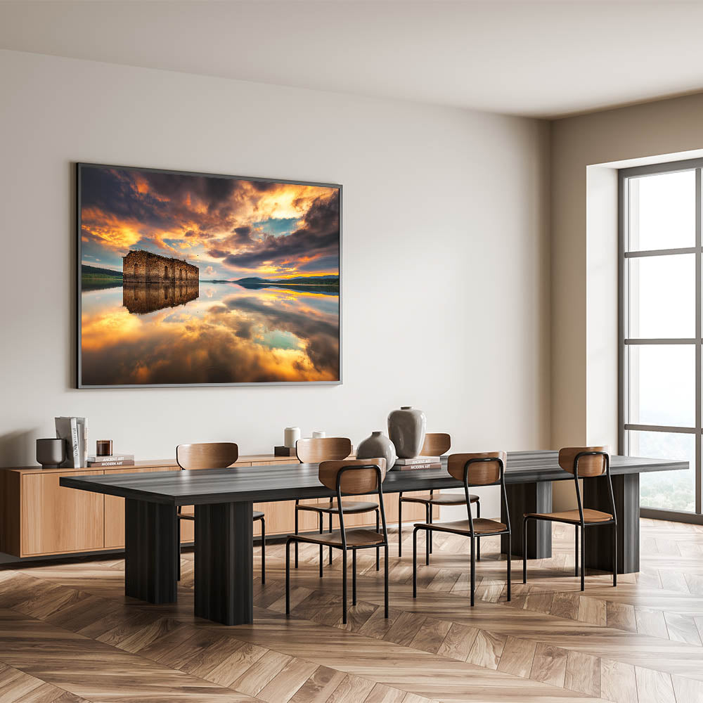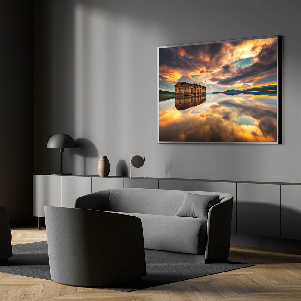 Experience the haunting beauty of Bulgaria’s submerged church with this captivating Bulgaria photography print. This stunning image captures the abandoned stone church partially submerged in the calm waters of a reservoir, illuminated by the fiery hues of a sunset sky. The reflection on the water creates a mesmerizing mirror effect, making this a perfect piece for anyone seeking Bulgaria wall art that tells a story of history and nature intertwined. Ideal for lovers of Bulgarian heritage art and scenic Bulgaria prints, this artwork will bring a unique touch of European charm into any space.