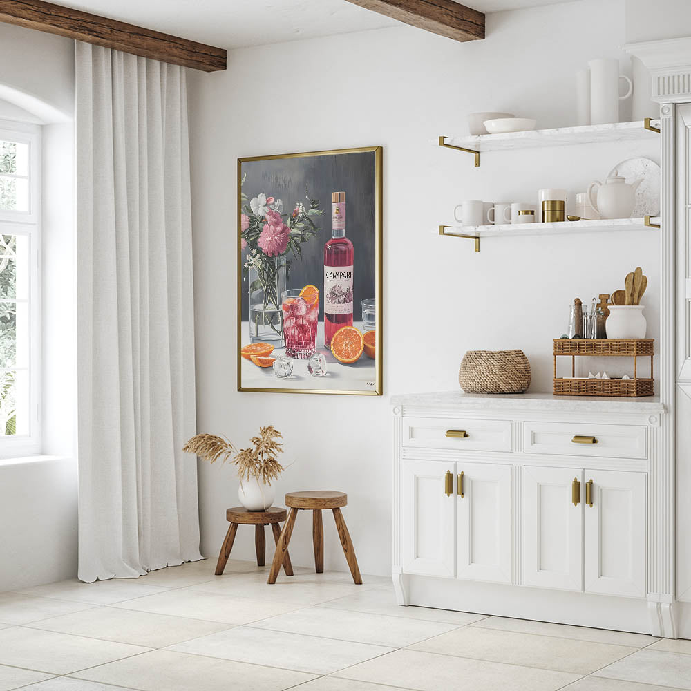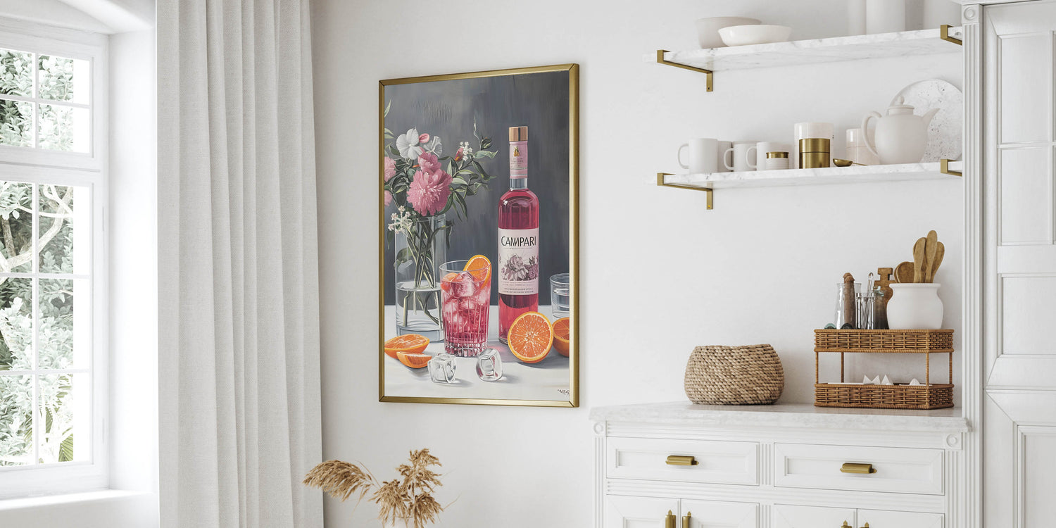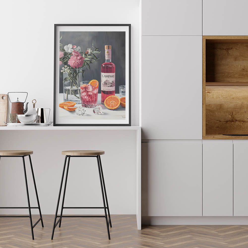 - Drink-themed art print featuring a Campari cocktail and floral arrangement