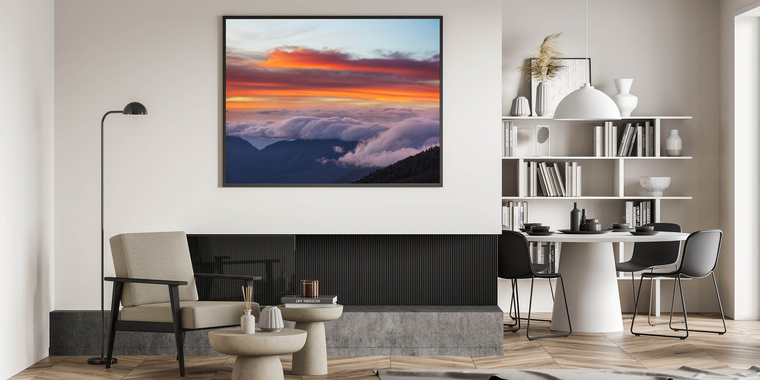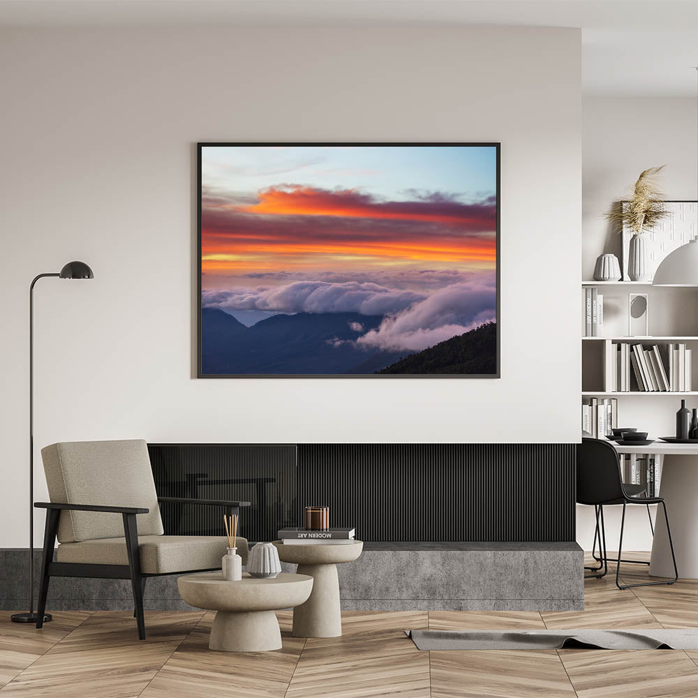 Experience the majestic sunset over El Salvador's mountainous landscape with our "Central America Scenery - El Salvador Sunset Art". This stunning piece captures the moment when the sky bursts into vibrant shades of orange and red, blanketing the cloud-wrapped mountains in a breathtaking display.