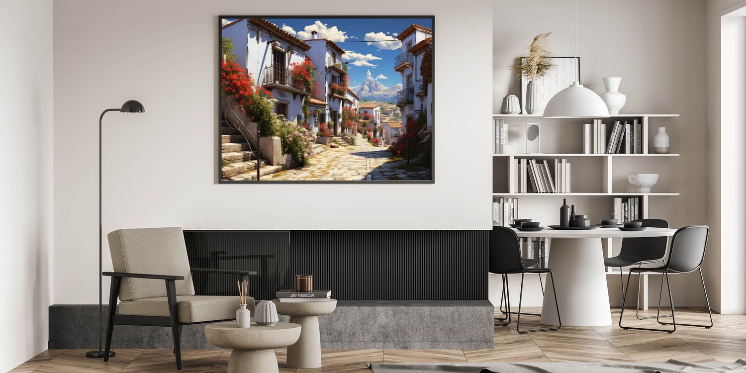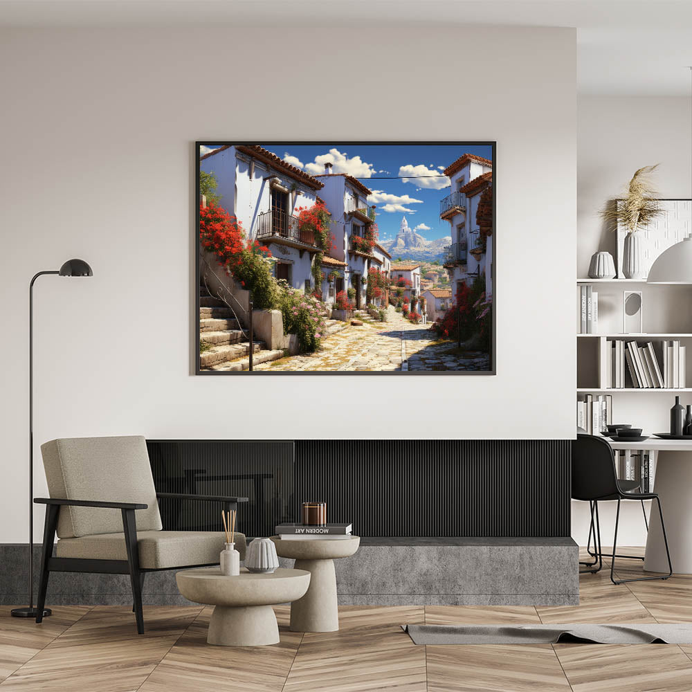Transform your space with the charm and warmth of the Mediterranean with this vibrant street scene art. This canvas print beautifully captures a sunlit village street adorned with cascading flowers in vivid reds and greens, framed by rustic whitewashed buildings. The picturesque setting, with its winding cobblestone path leading to a distant mountain chapel, evokes a sense of tranquility and timeless beauty. Perfect for adding a touch of Mediterranean elegance to any room, this artwork is a stunning addition to your home or office decor.