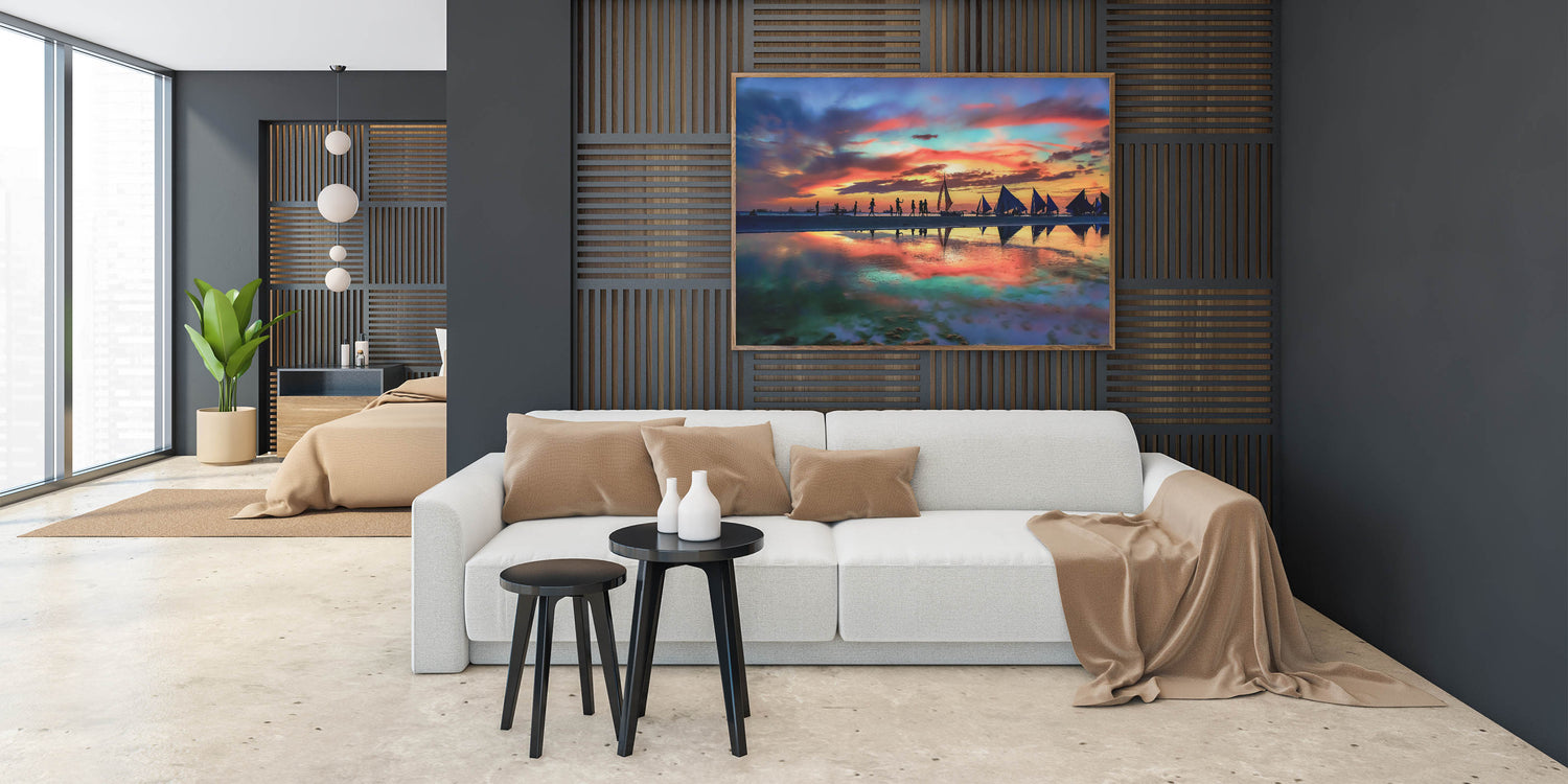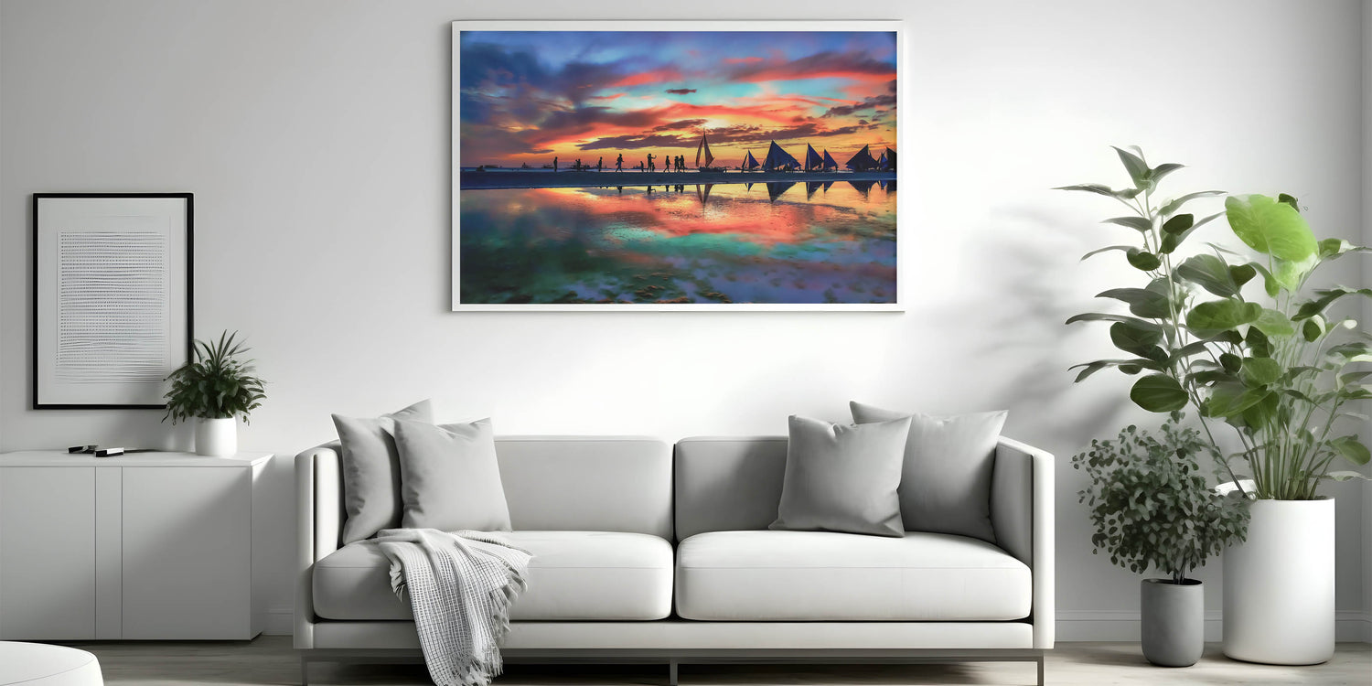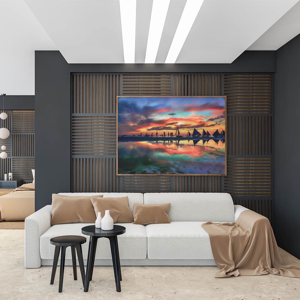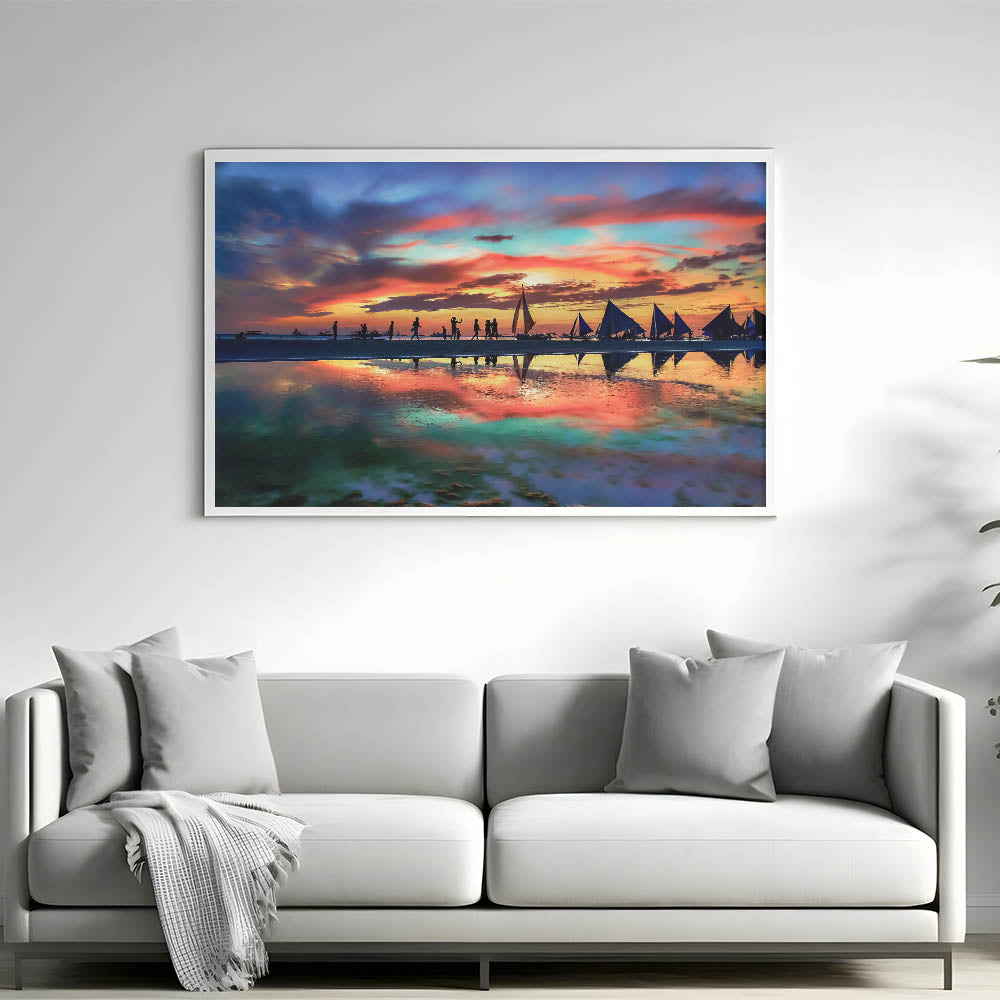 Capture the beauty of a breathtaking sunset with this abstract landscape art, showcasing a serene beach with sailboats silhouetted against a colorful sky. The radiant hues of orange, pink, blue, and purple reflect on the water, creating a mesmerizing blend of colors that bring warmth and tranquility to any room. Perfect for adding an exotic touch to your decor, this piece is ideal for those who love the peaceful allure of coastal landscapes.