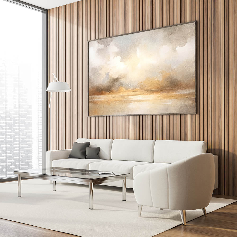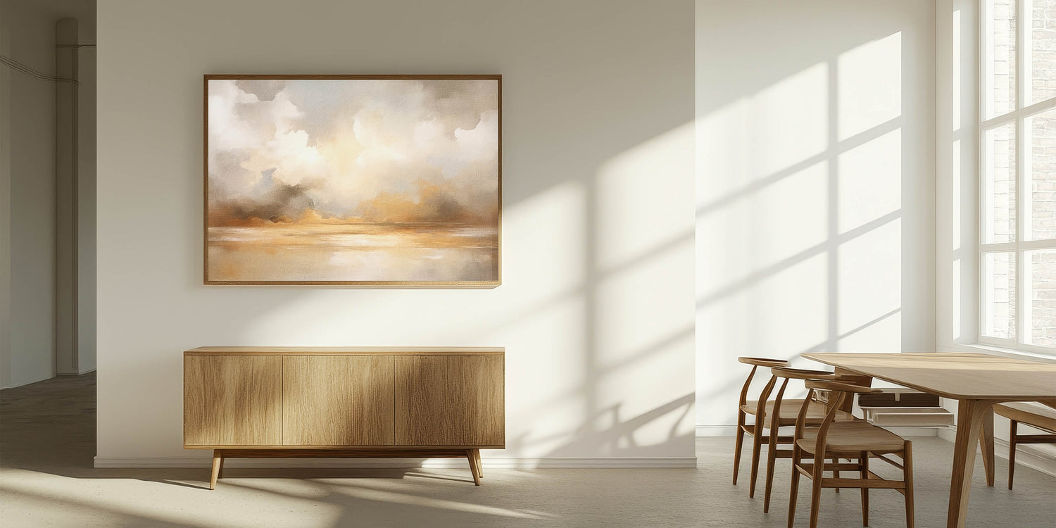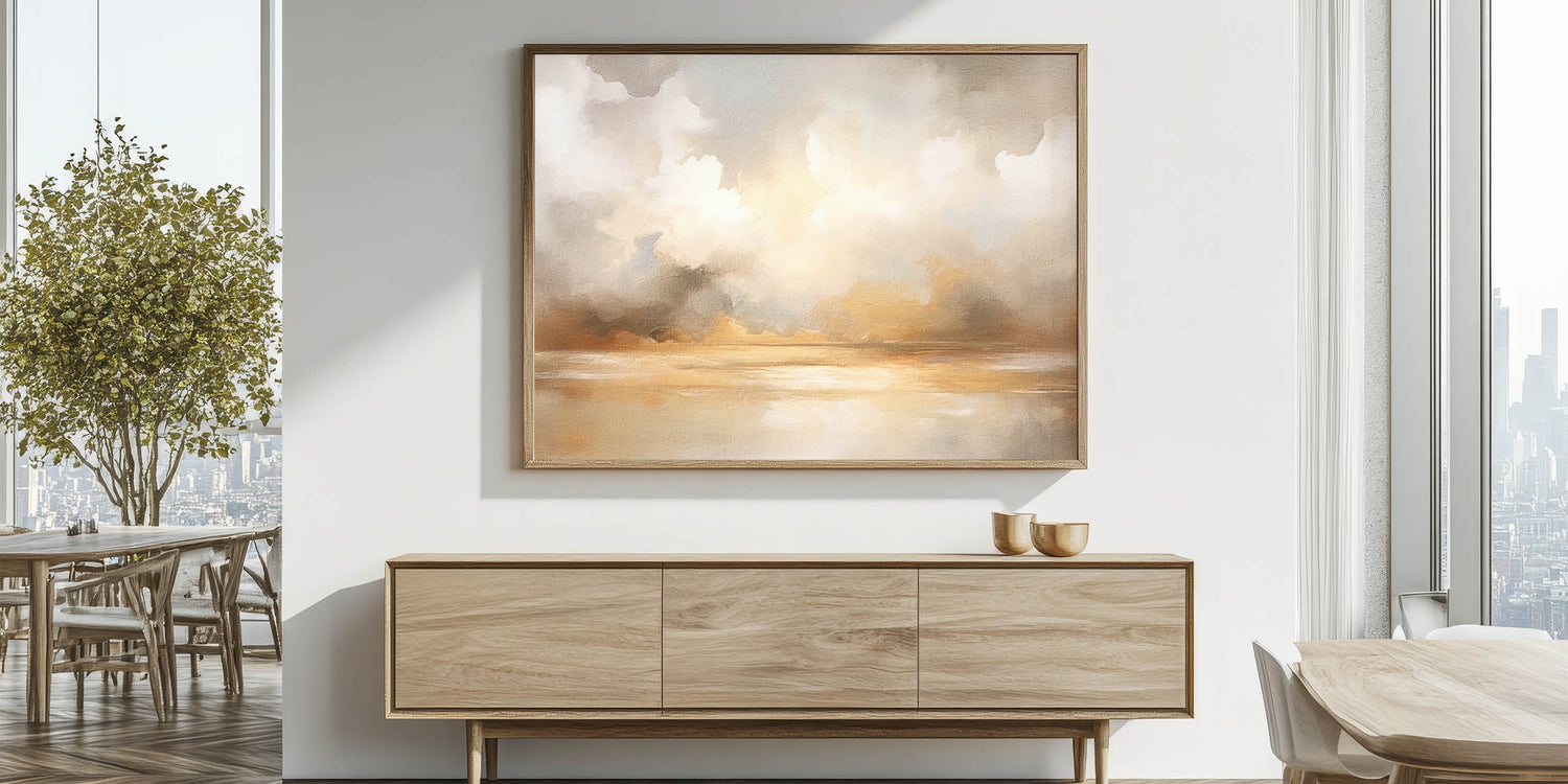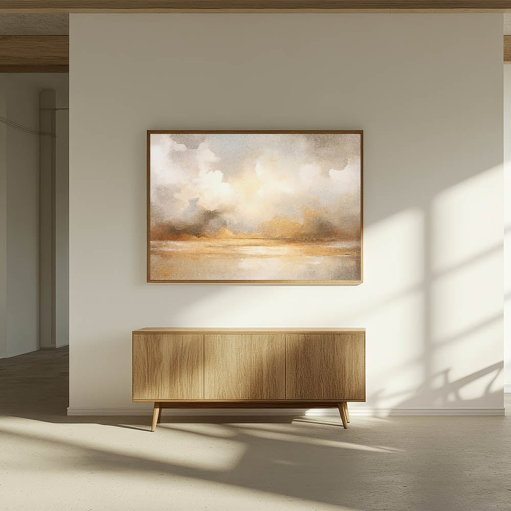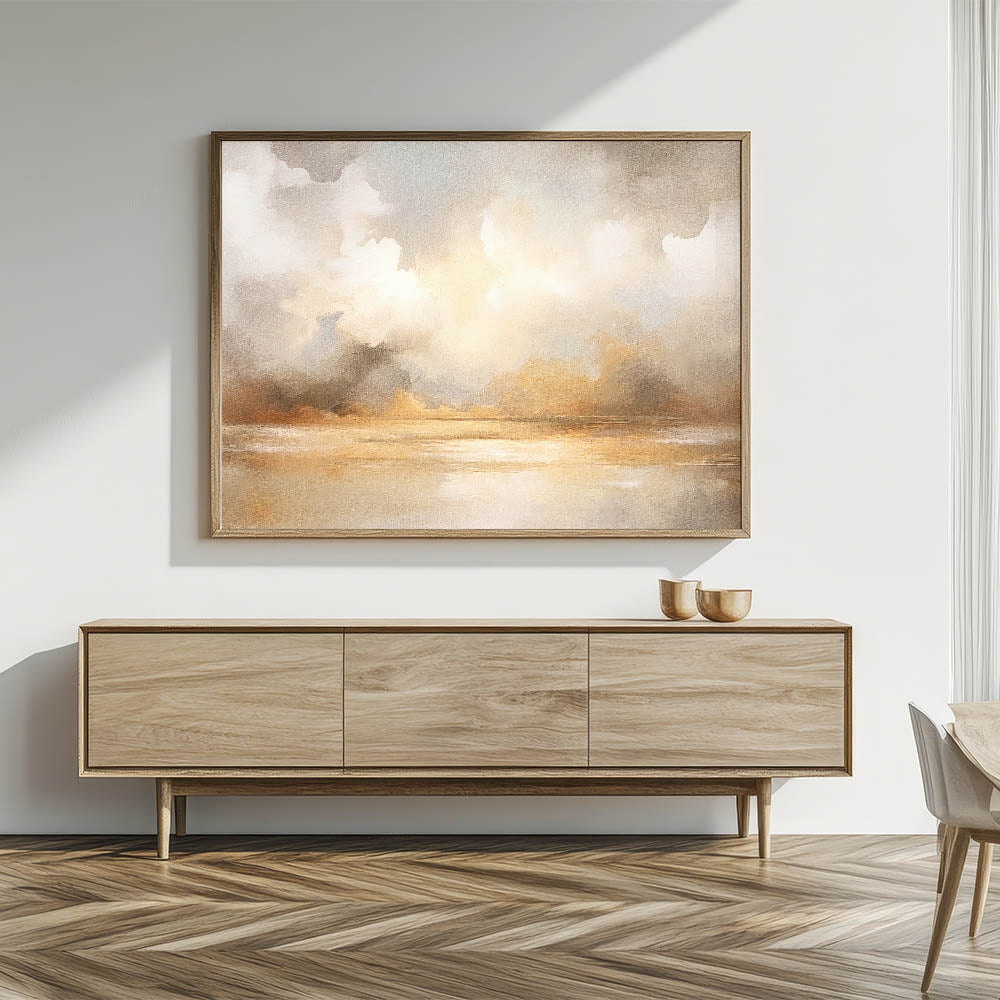 Immerse your space in the warm, serene beauty of a golden horizon with this abstract landscape artwork. Featuring gentle blends of beige, gold, and light gray, this piece captures the peaceful transition of dawn or dusk, with soft clouds reflecting the warmth of the sun. Ideal for adding an elegant touch to any room, this artwork complements a variety of decor styles, from modern to rustic.