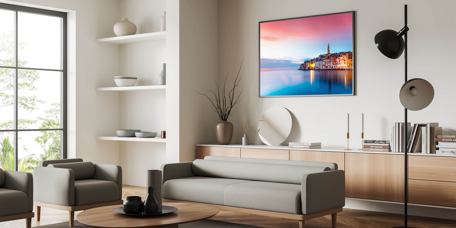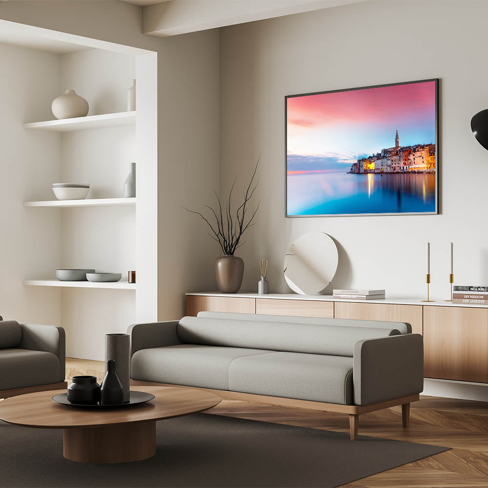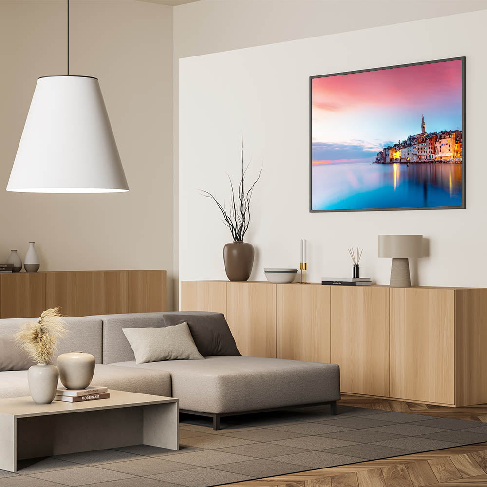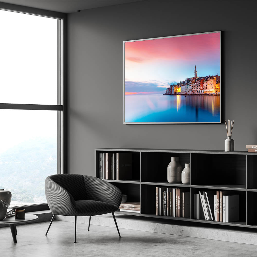 • Vibrant Color Palette: Immerse yourself in the deep navy blues of the Adriatic Sea contrasted with the warm peach tones of the sunset sky.