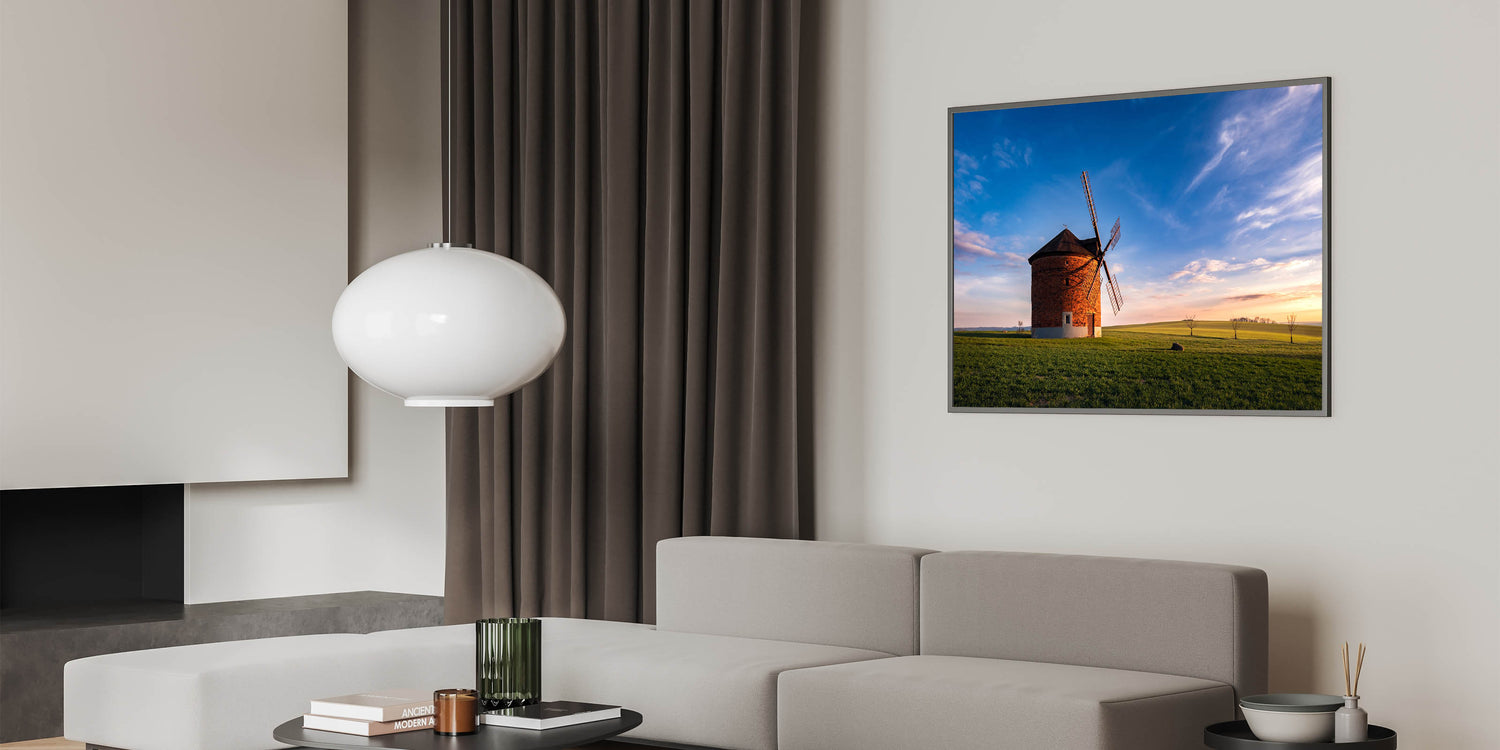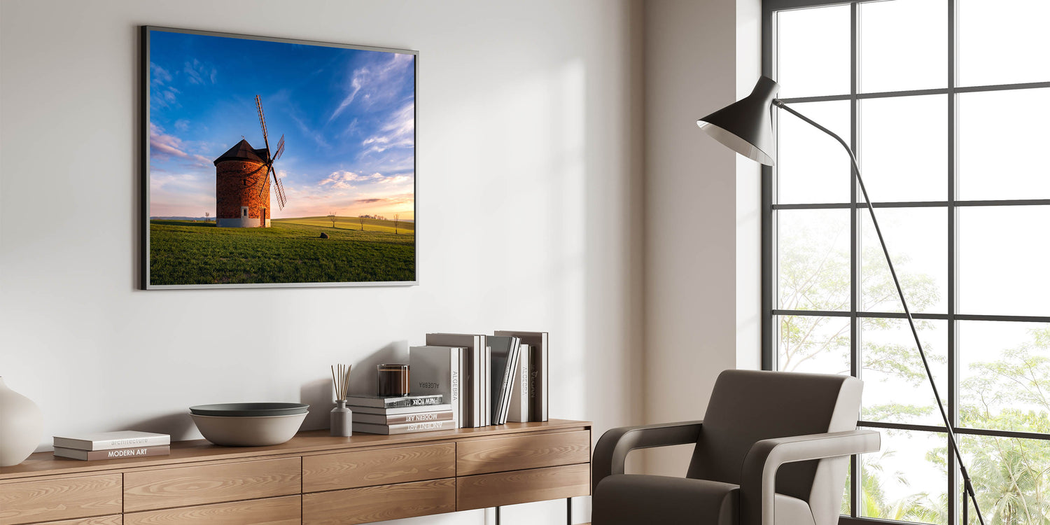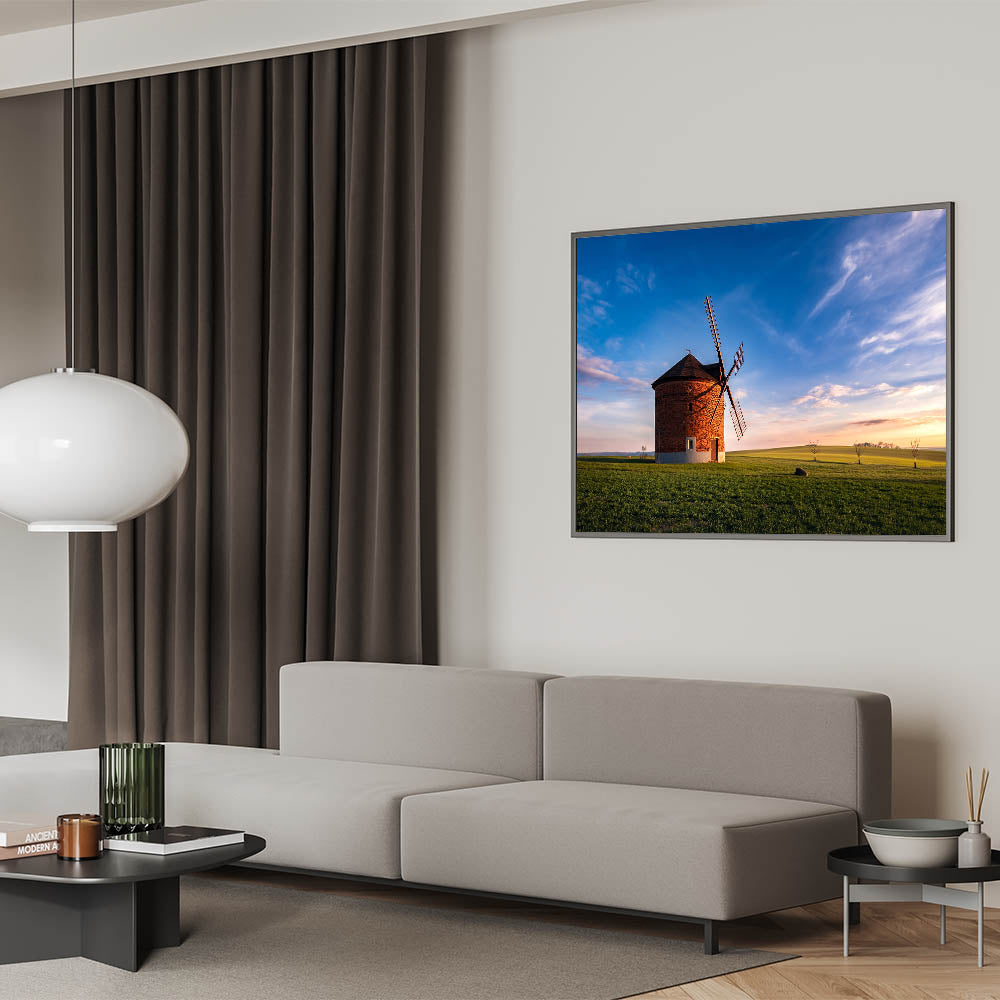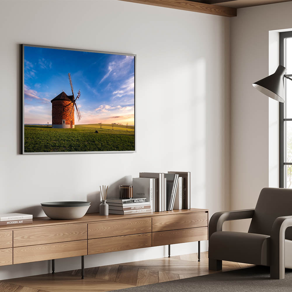 This beautiful piece of wall art captures a historic windmill bathed in the golden light of sunset, standing proudly in the tranquil fields of the Czech Republic. The vibrant sky, with its soft hues of pink and orange, contrasts perfectly with the lush green fields, creating a peaceful yet captivating composition. This Czech Republic scenic print is perfect for those who appreciate the beauty of rural European landscapes and timeless architecture.