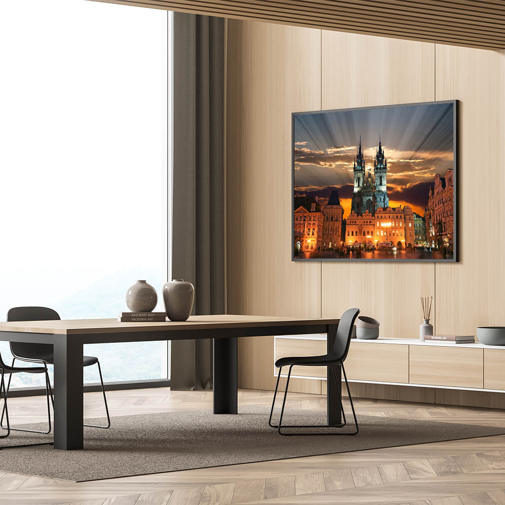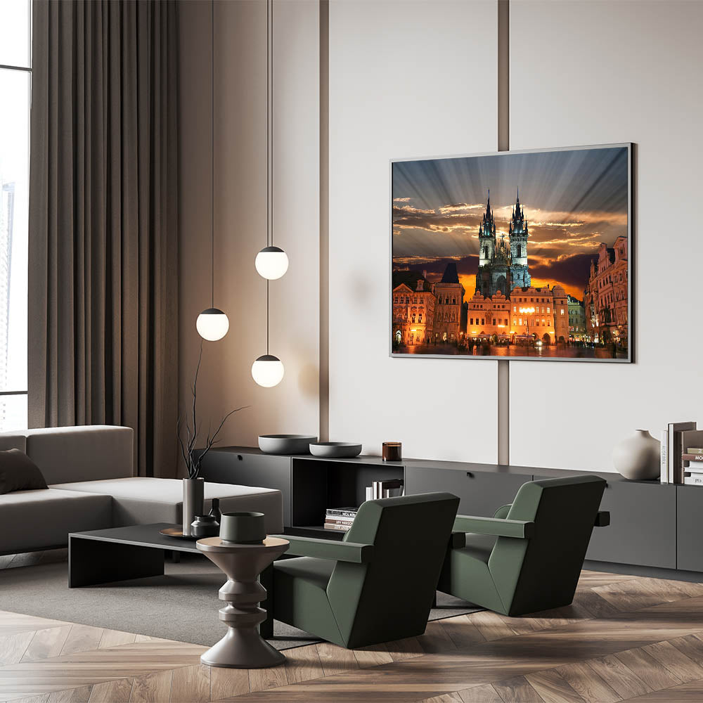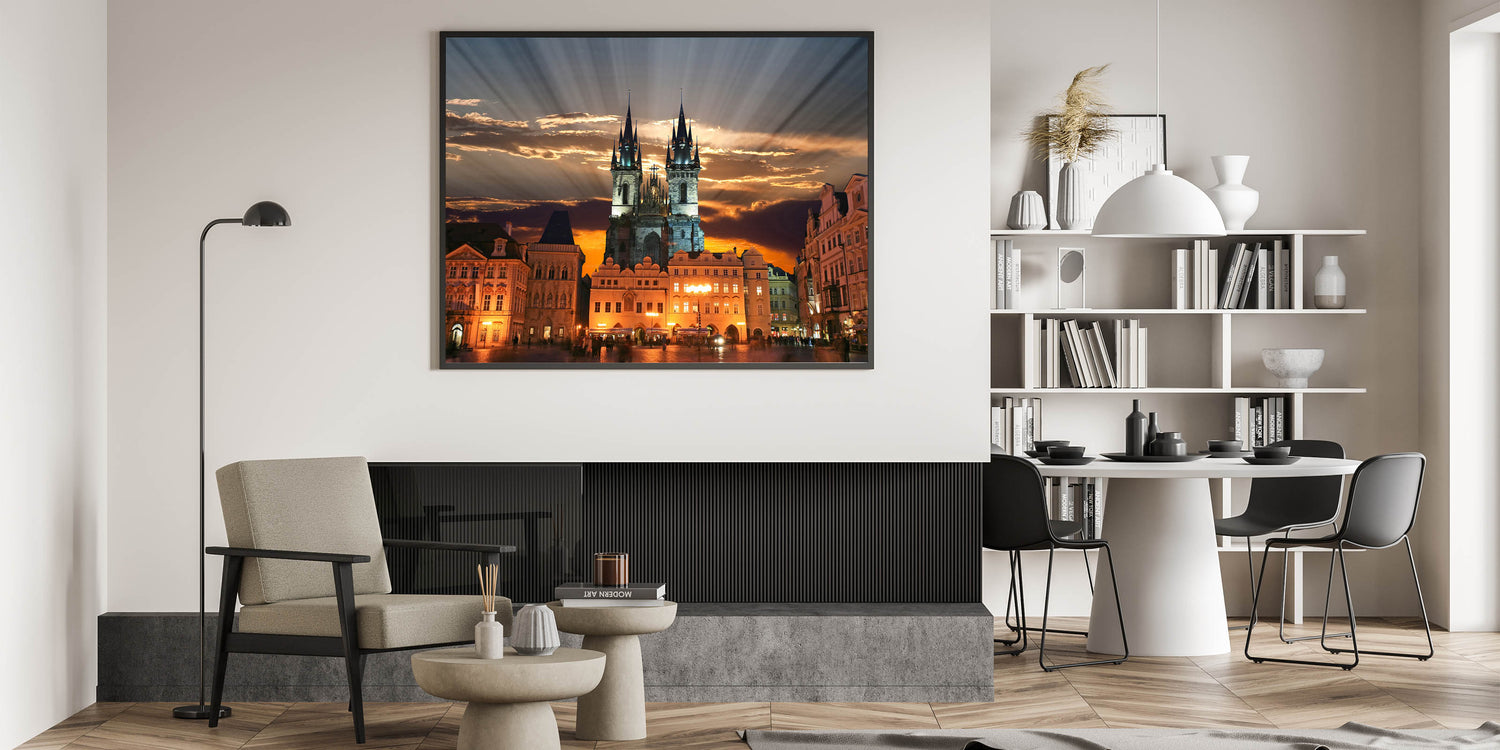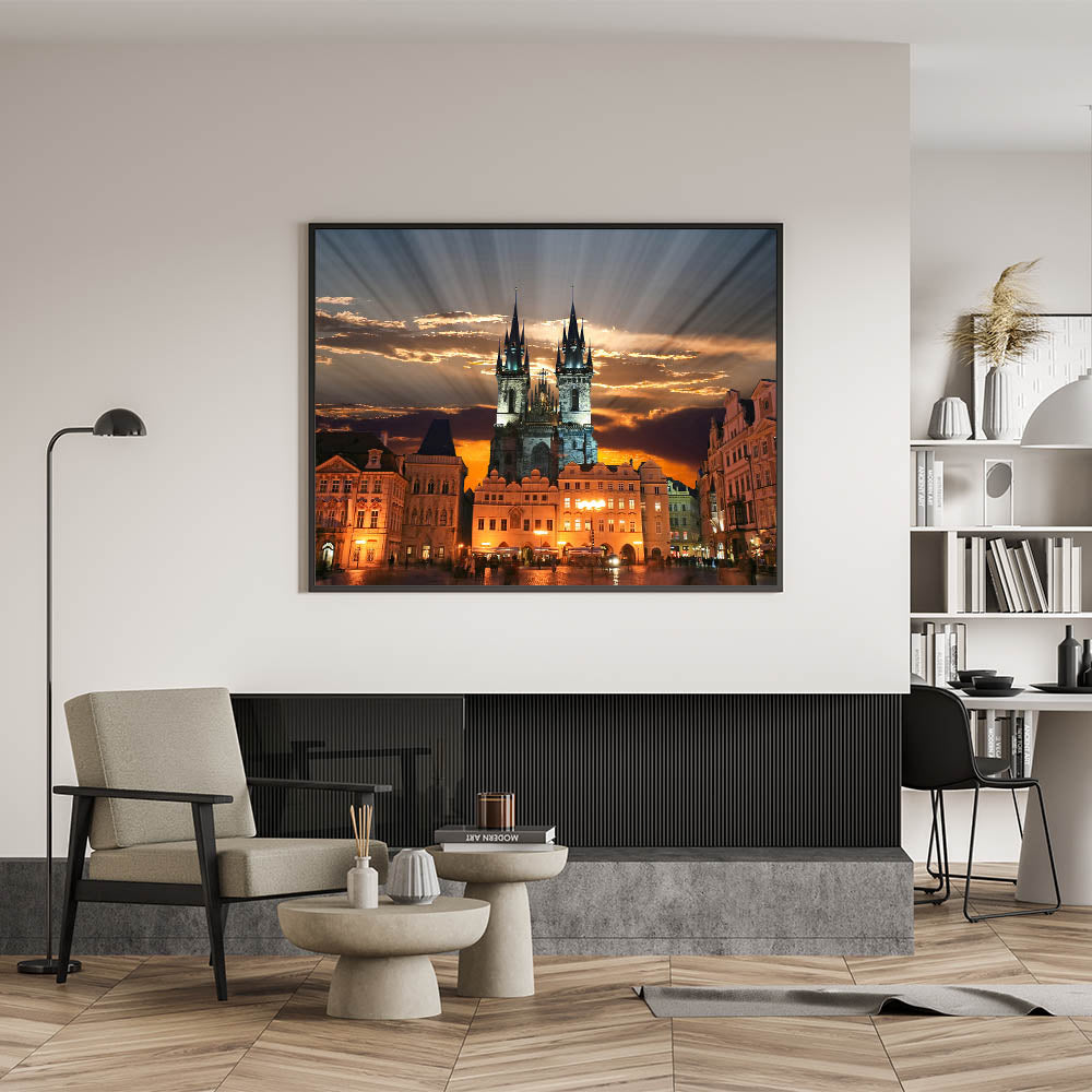 Capture the breathtaking beauty of the Czech Republic with this stunning wall art showcasing the iconic Old Town Square in Prague. This masterpiece features the towering spires of the Church of Our Lady before Týn, illuminated by a warm, golden sunset that fills the sky with dramatic rays of light. Whether you're an admirer of European architecture or simply a lover of vibrant cityscapes, this artwork offers a timeless glimpse into Prague’s rich historical and cultural heritage.
