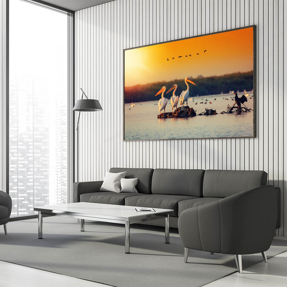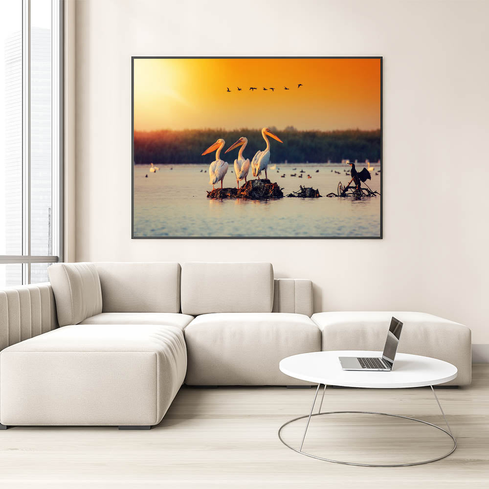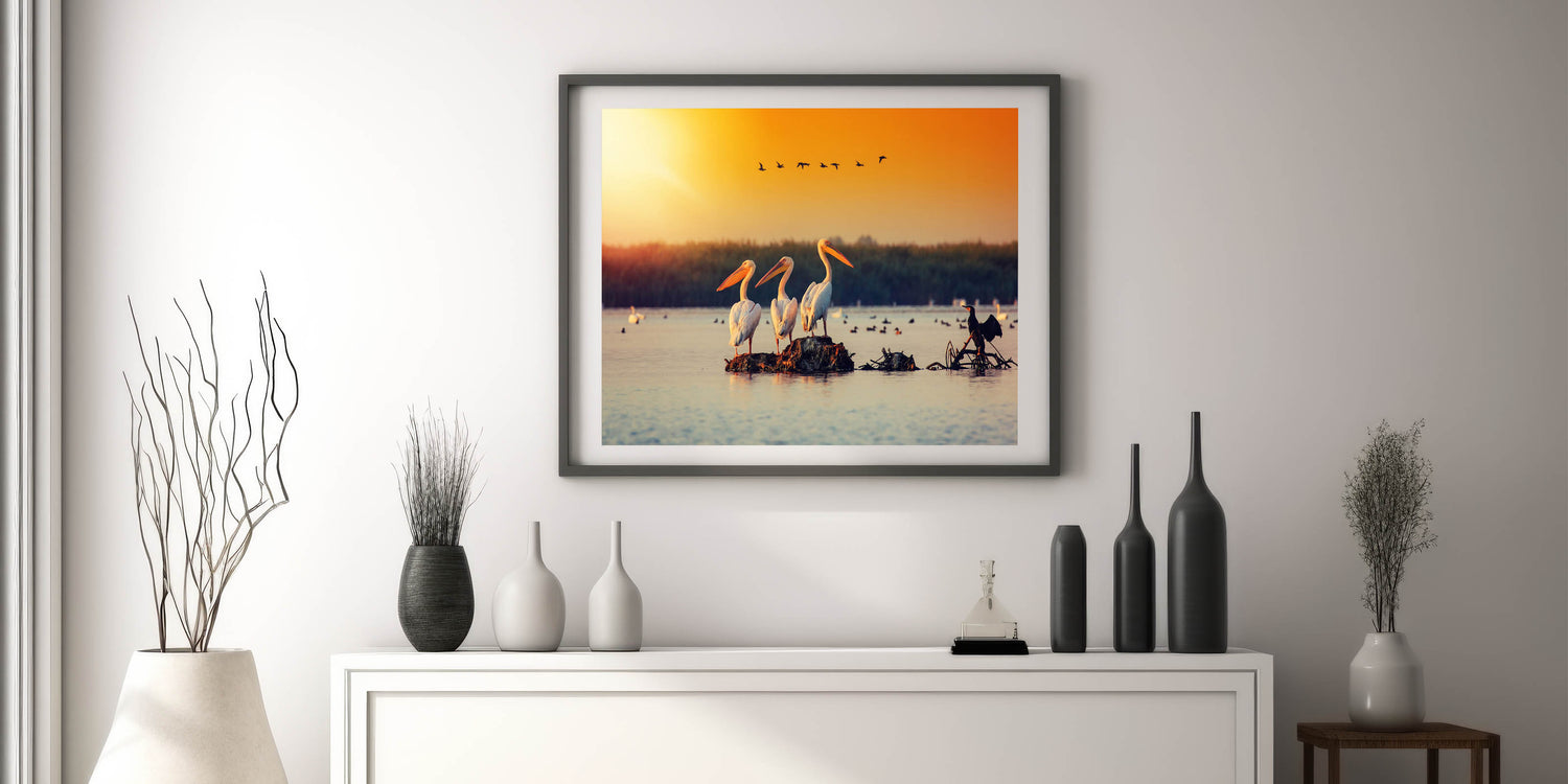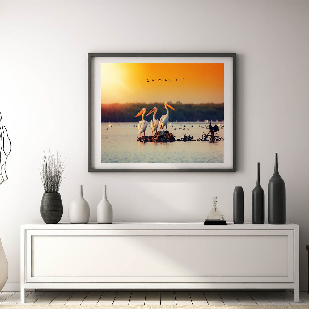 Experience the tranquil beauty of Romania's Danube Delta with this breathtaking nature print. The image captures a serene scene of pelicans resting at sunset, surrounded by calm waters and vibrant hues of orange and yellow. This piece embodies the peacefulness of Romania's most iconic natural reserve, making it the perfect artwork for any nature lover.