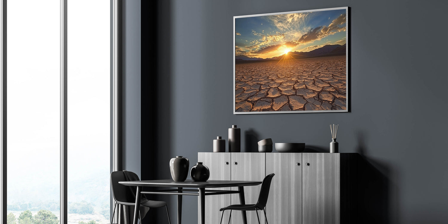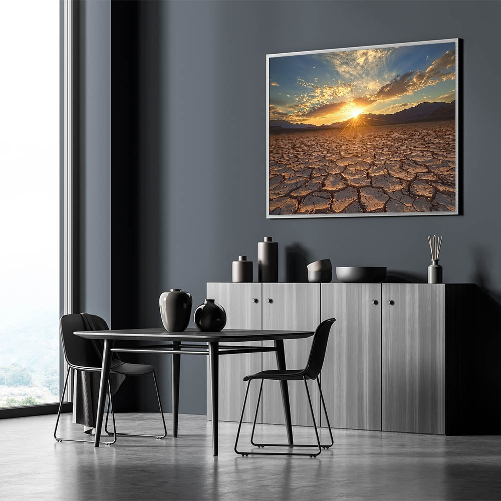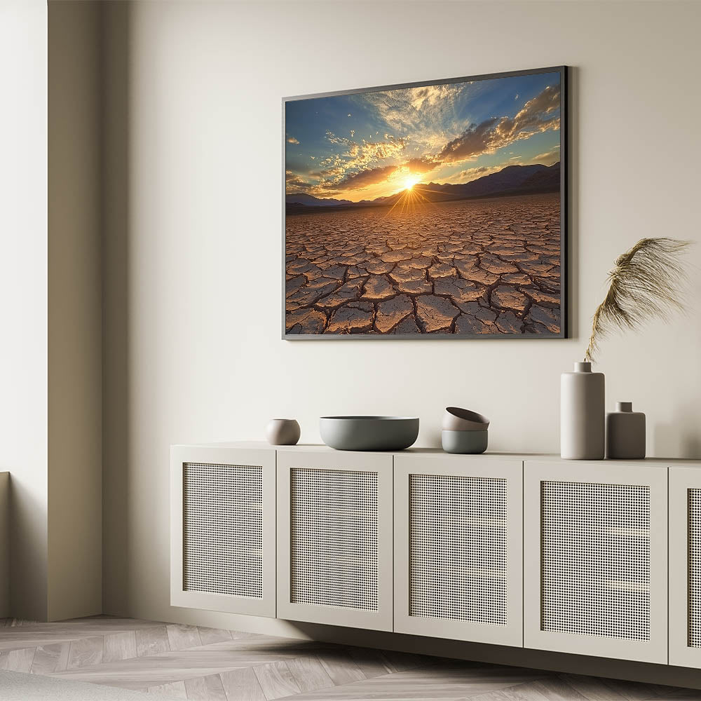 Awaken your space with the radiant beauty of this desert canvas print, capturing a golden sunrise over a vast expanse of cracked earth. The interplay of sunlight and shadows across the textured landscape creates a mesmerizing and vibrant scene, perfect for enhancing any room's decor.