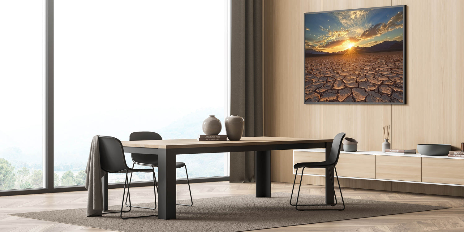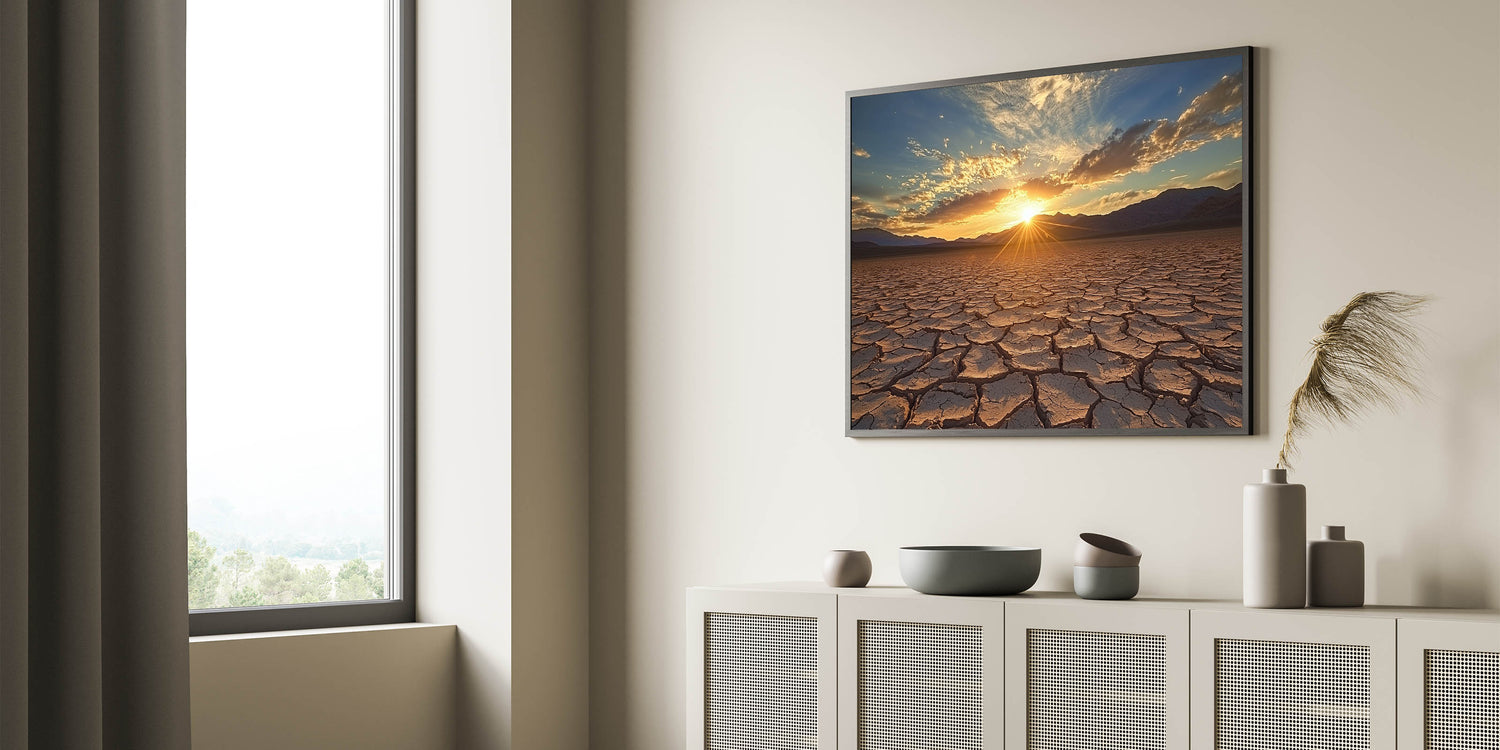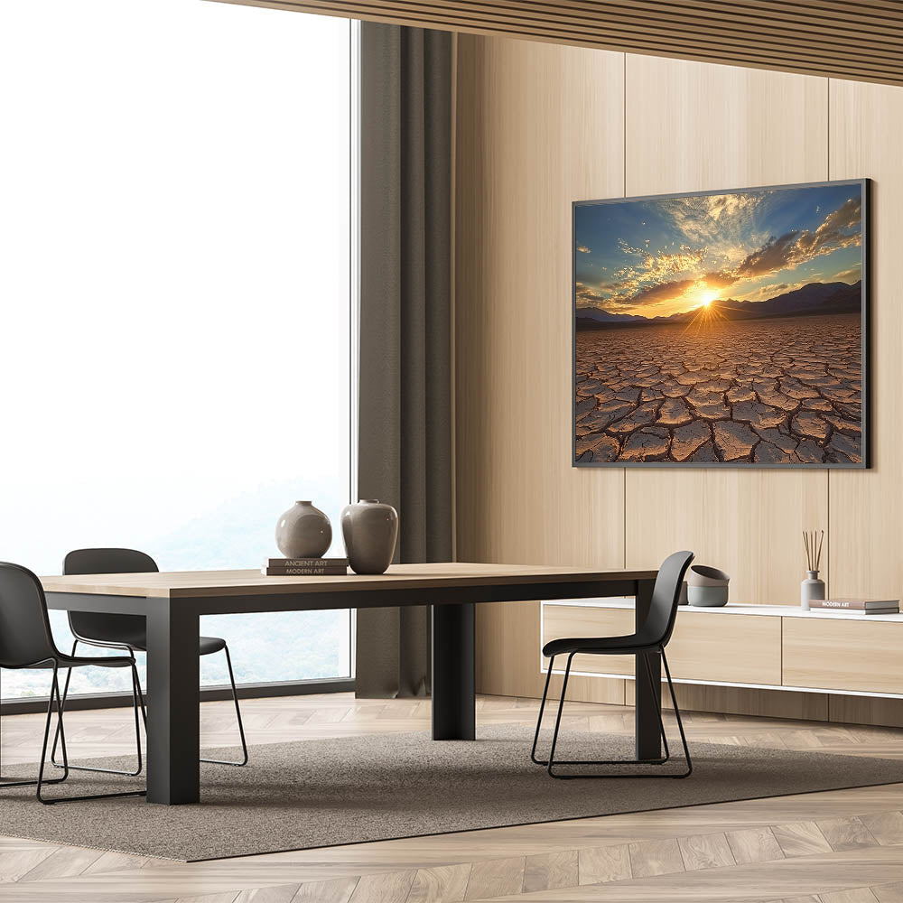 Awaken your space with the radiant beauty of this desert canvas print, capturing a golden sunrise over a vast expanse of cracked earth. The interplay of sunlight and shadows across the textured landscape creates a mesmerizing and vibrant scene, perfect for enhancing any room's decor.