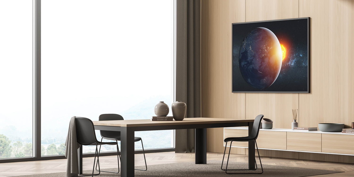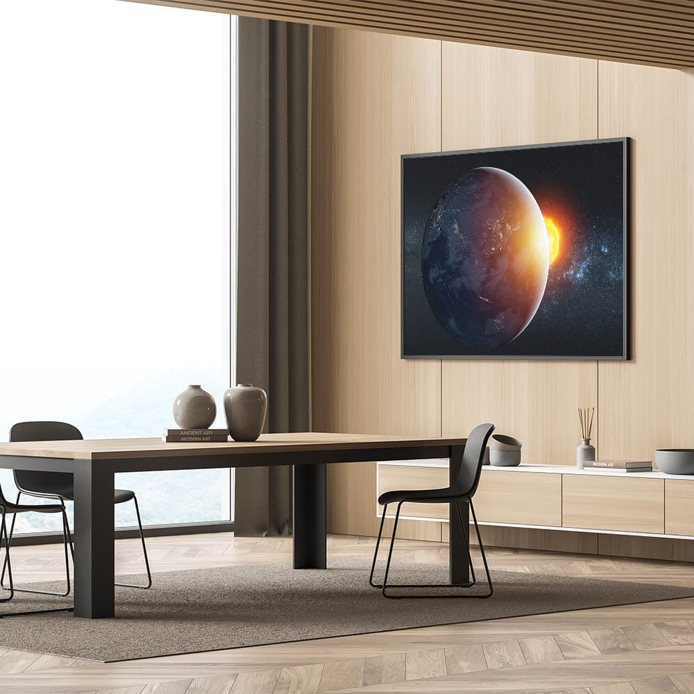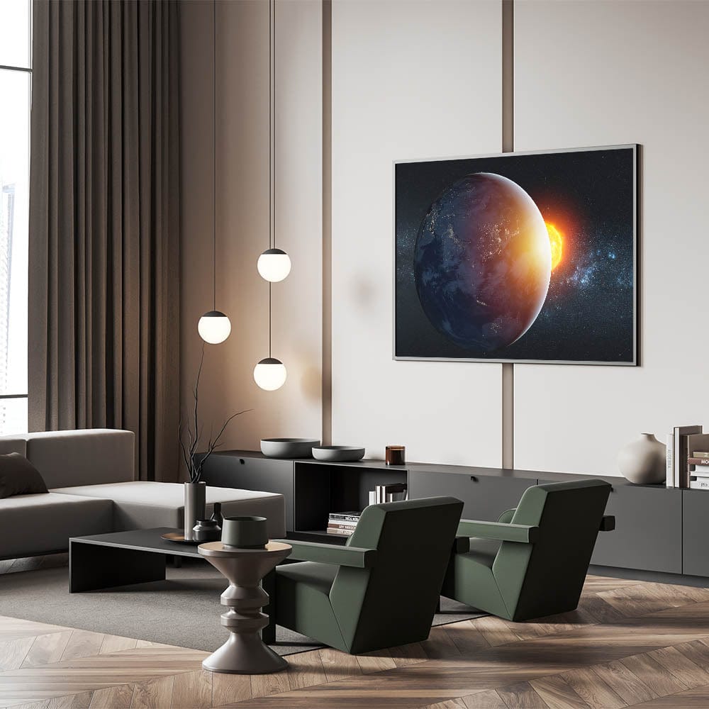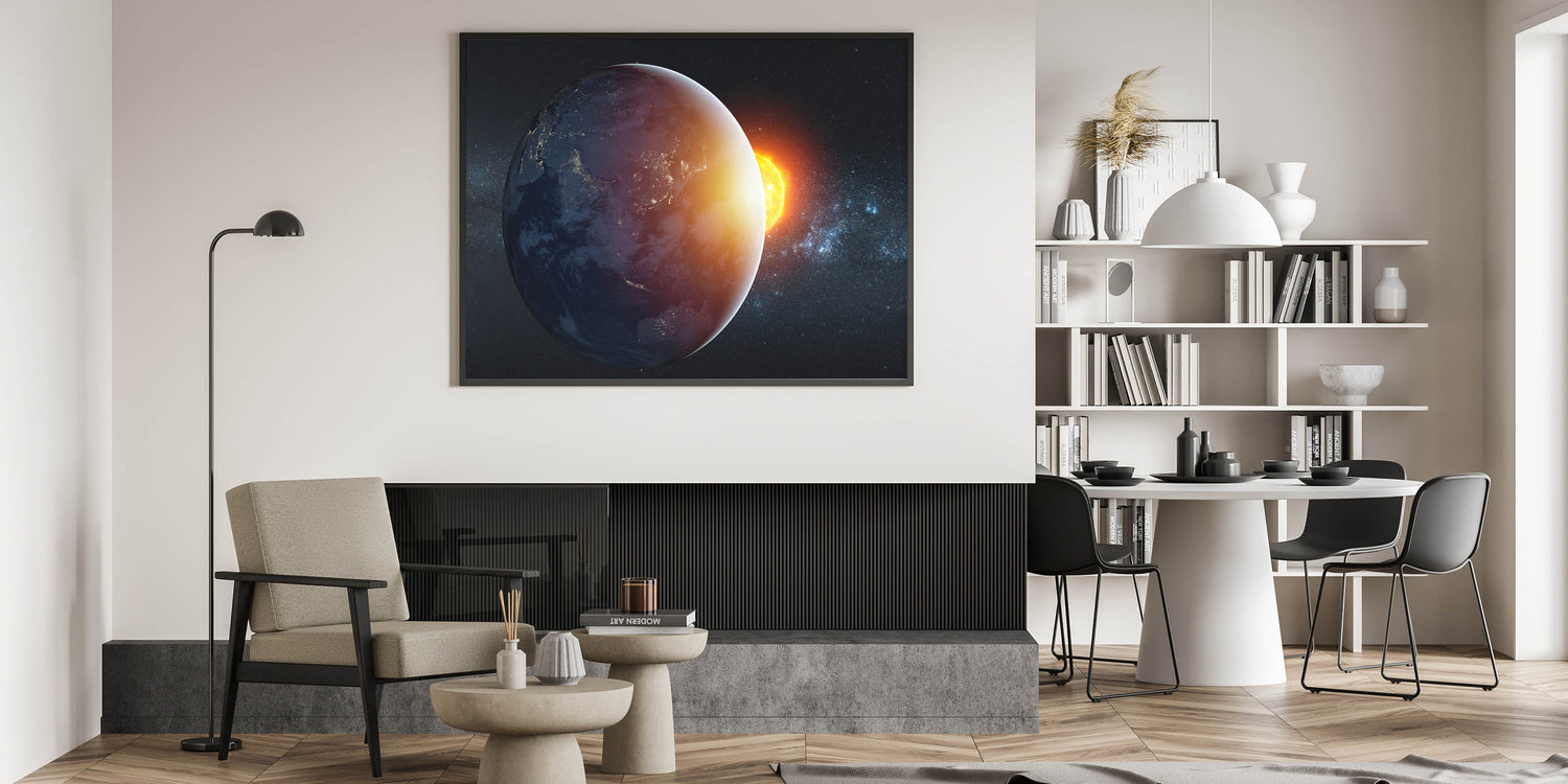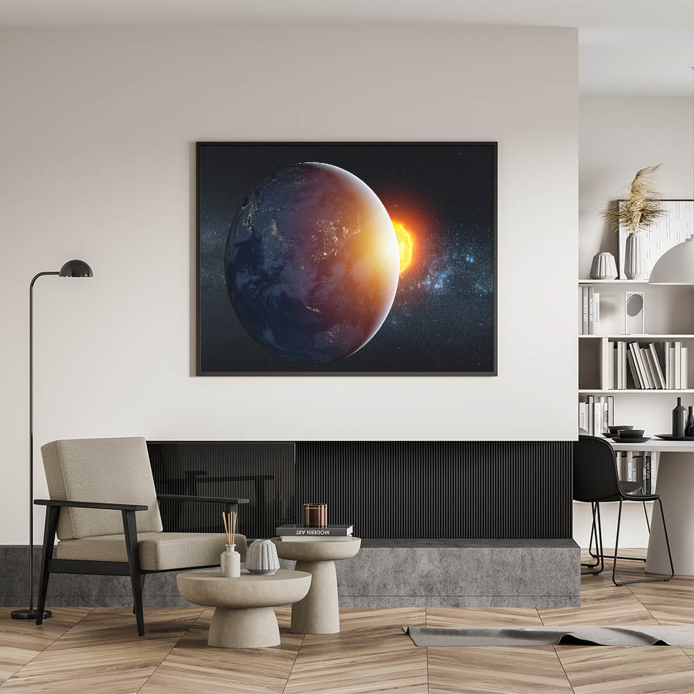 This beautiful view of Earth and the sun offers a dramatic and inspiring vision of our planet, bringing a sense of wonder and exploration to any room. Transform your space with this breathtaking cosmic perspective.