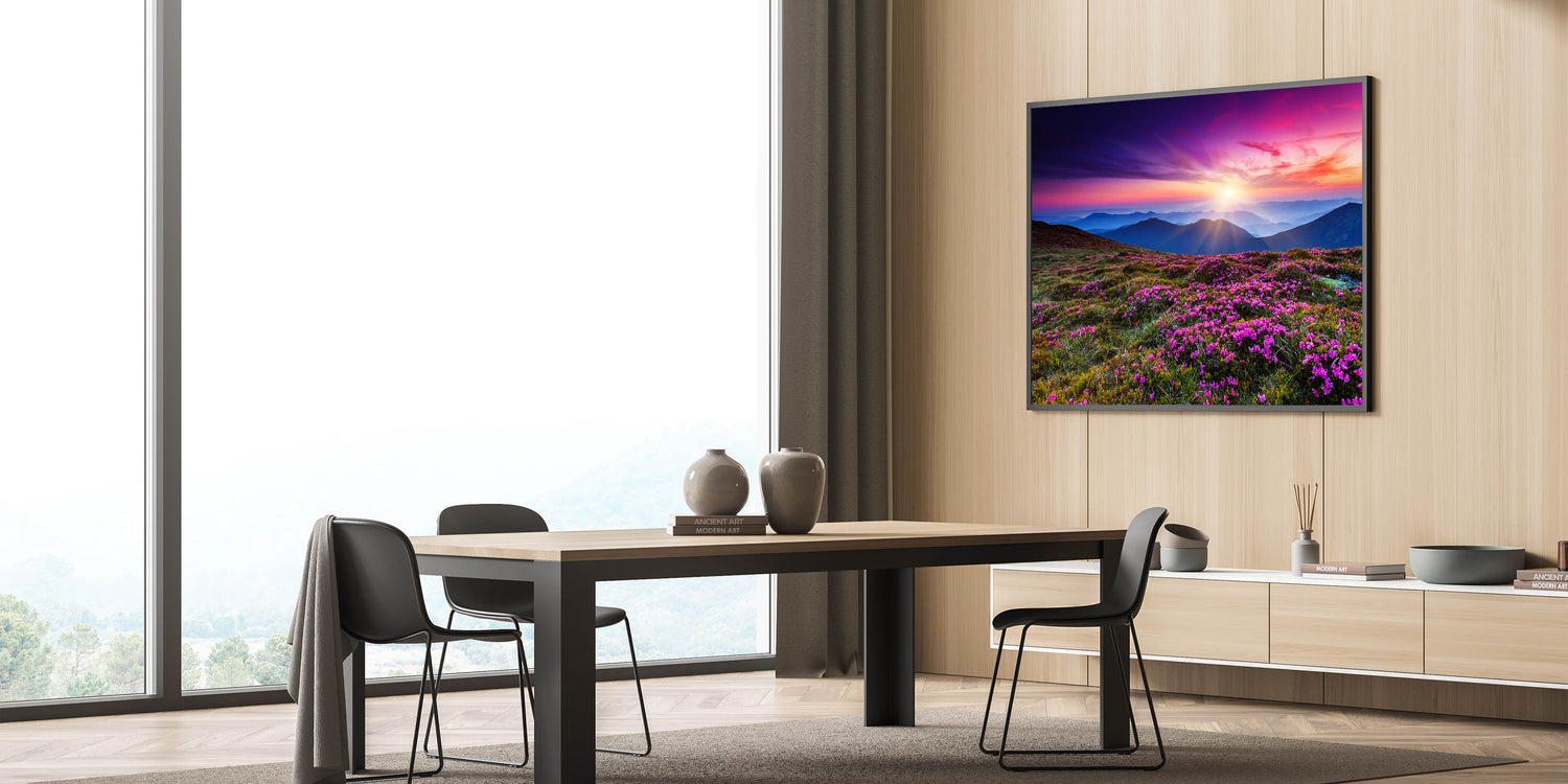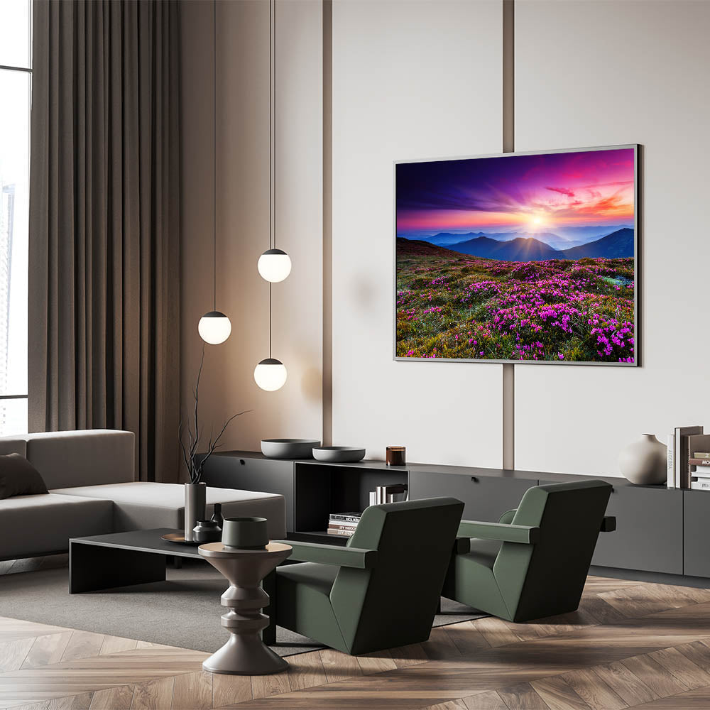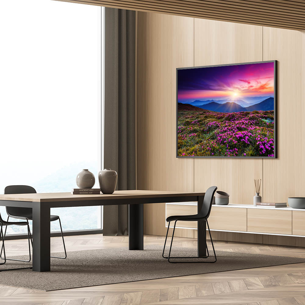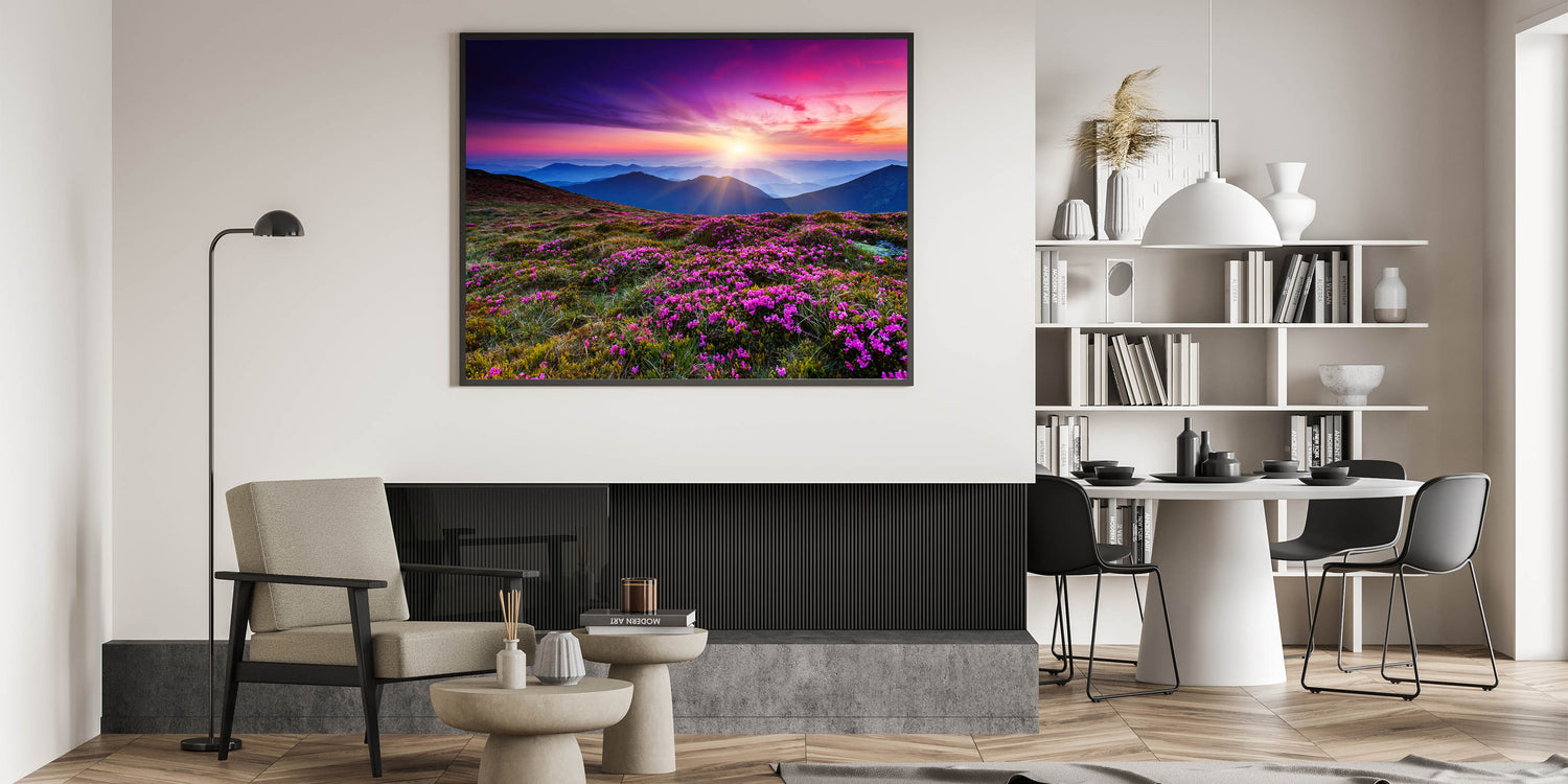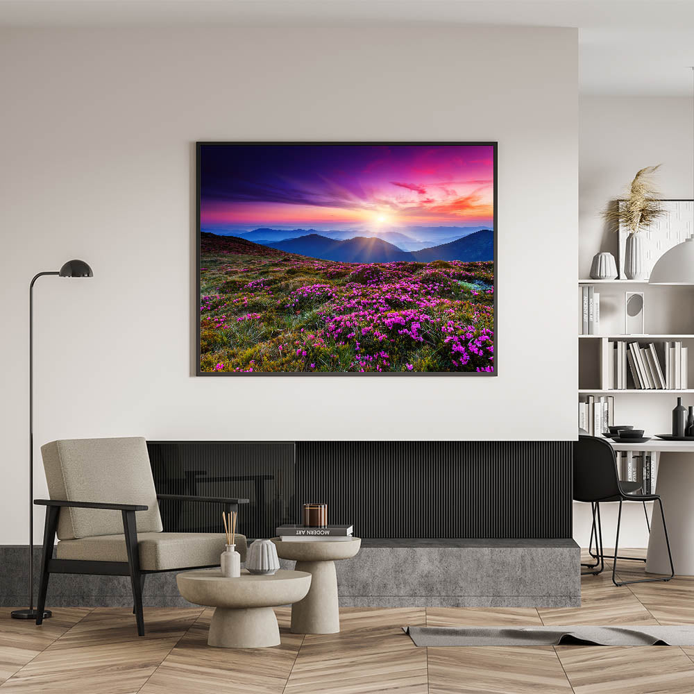 • Vivid, High-Resolution Print: Showcases the intense colors and intricate details of a sunset over mountain blooms.
