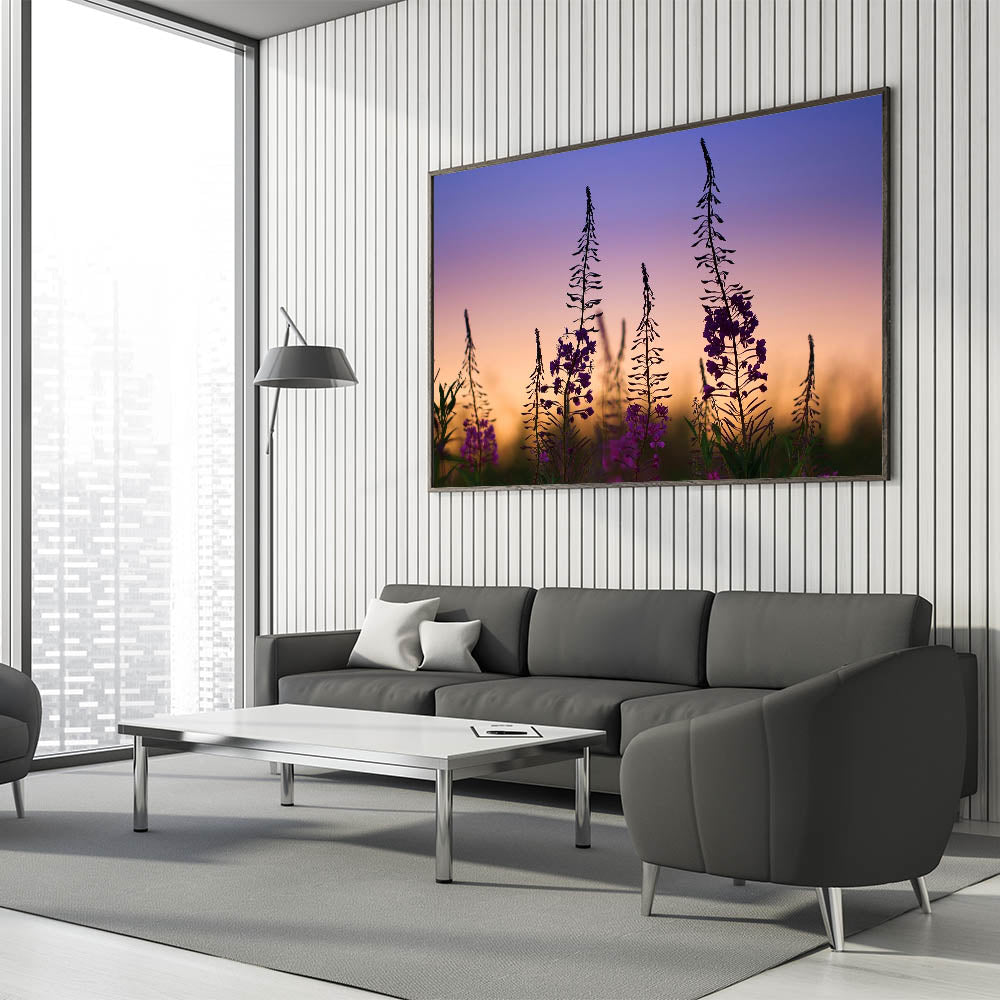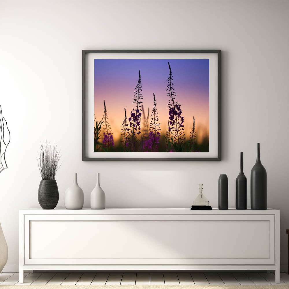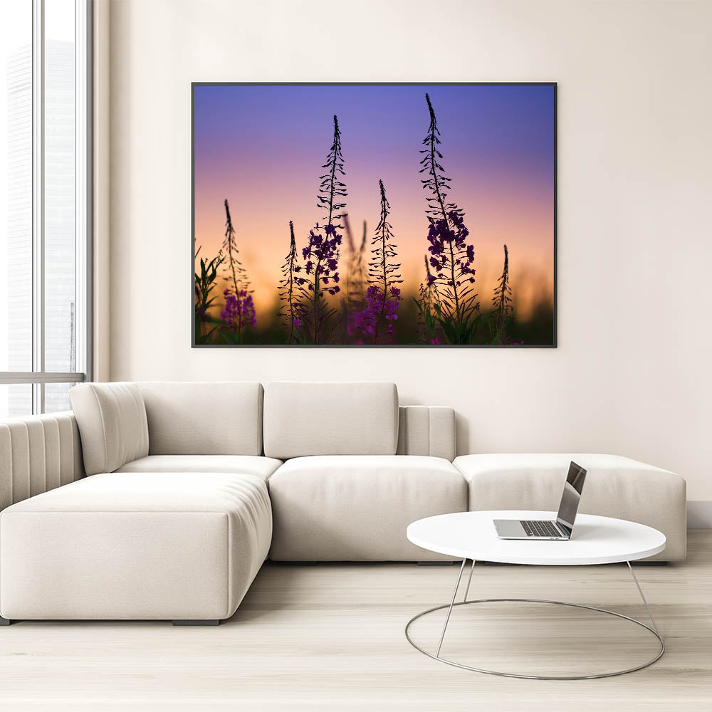 Bring a touch of nature to your home with this stunning Fireweed wall art. Capturing the beauty of delicate fireweed flowers against a calming sunset background, this botanical art piece is perfect for nature lovers and art enthusiasts alike. The vibrant purple blooms contrast elegantly with the soft, glowing sky, making it an eye-catching addition to any room.