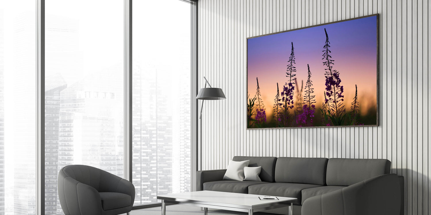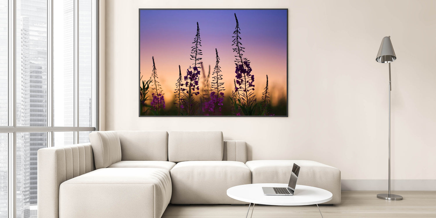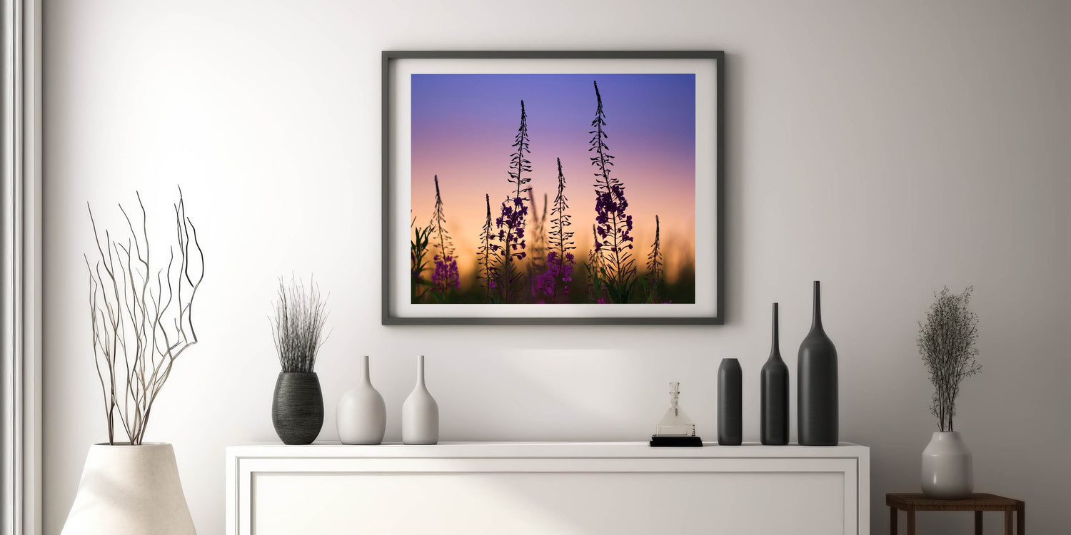 Bring a touch of nature to your home with this stunning Fireweed wall art. Capturing the beauty of delicate fireweed flowers against a calming sunset background, this botanical art piece is perfect for nature lovers and art enthusiasts alike. The vibrant purple blooms contrast elegantly with the soft, glowing sky, making it an eye-catching addition to any room.