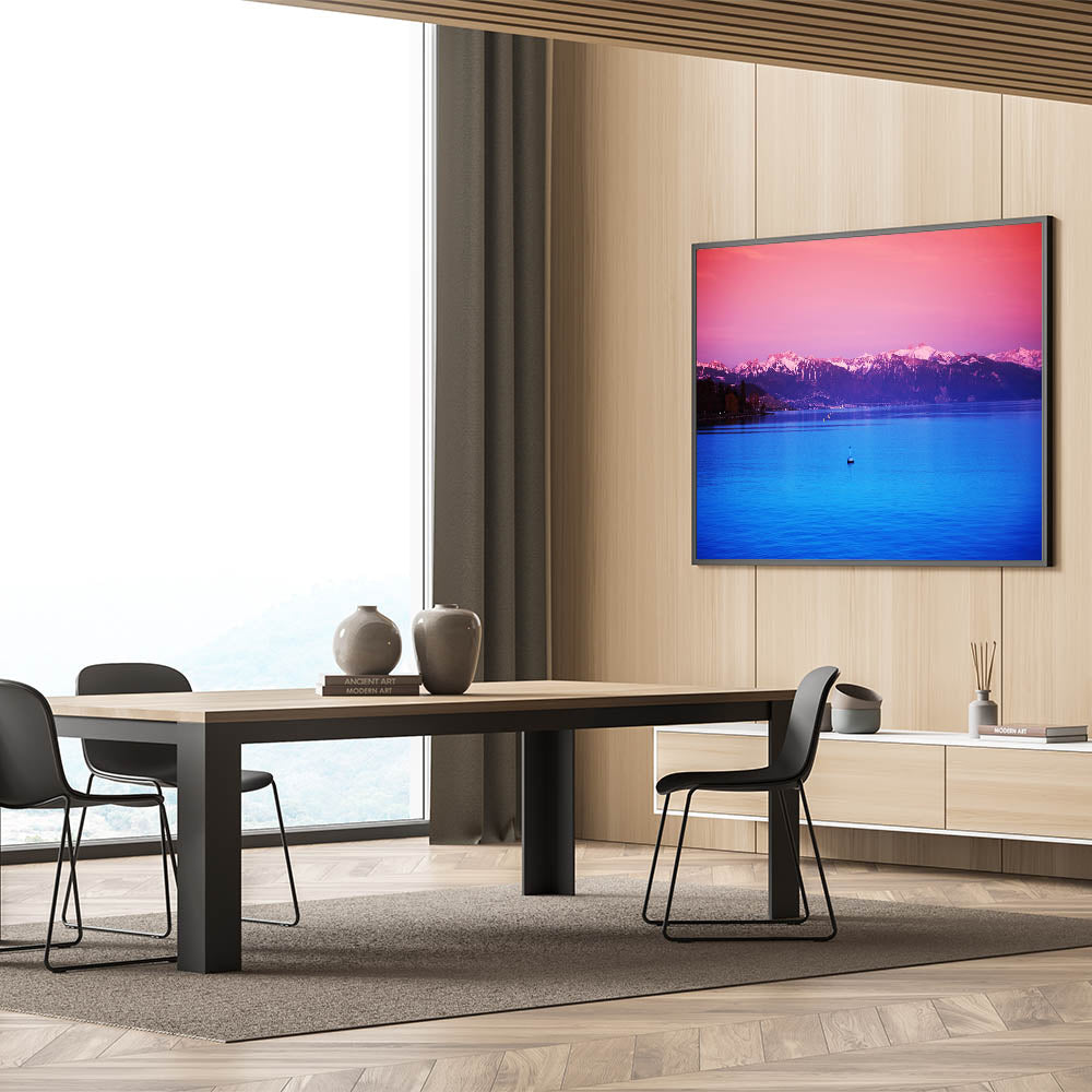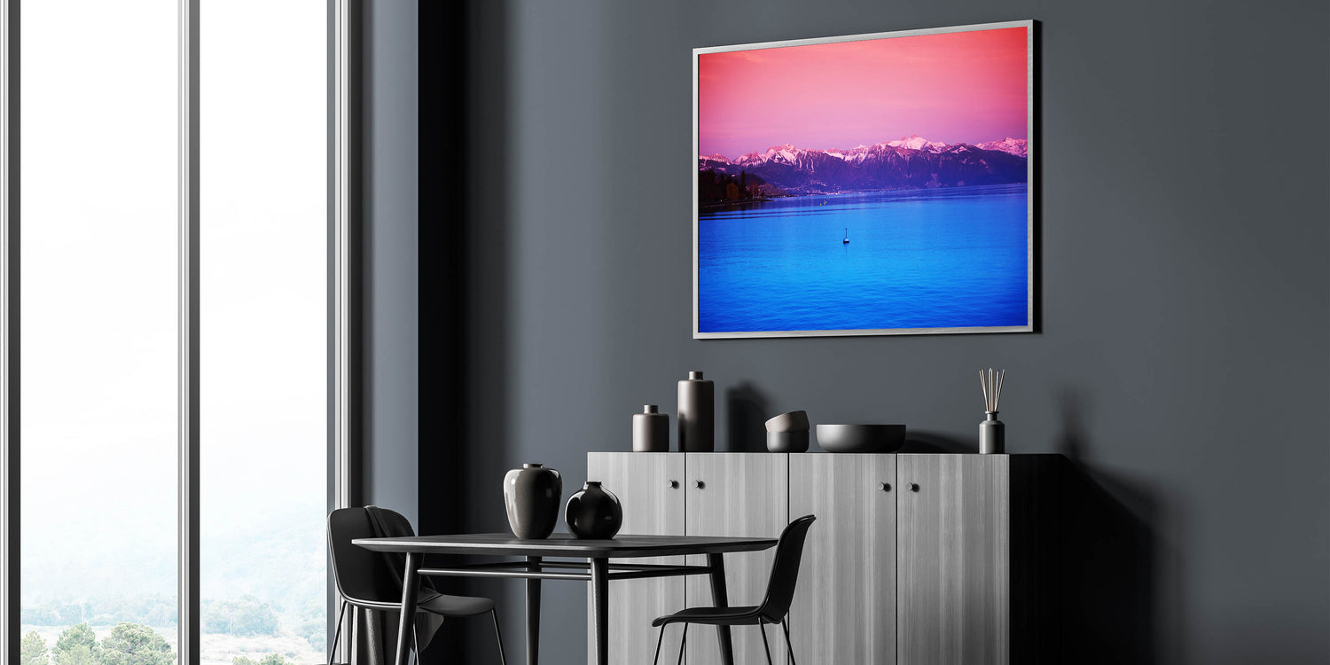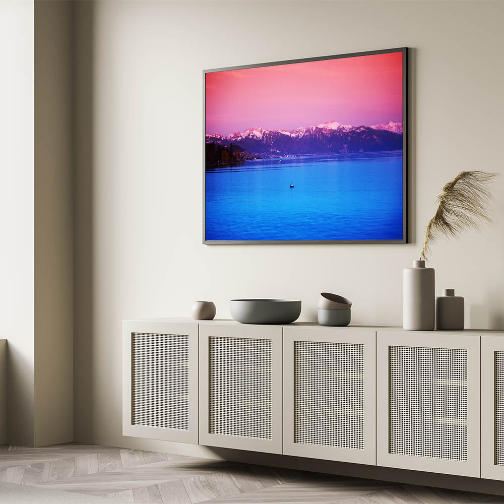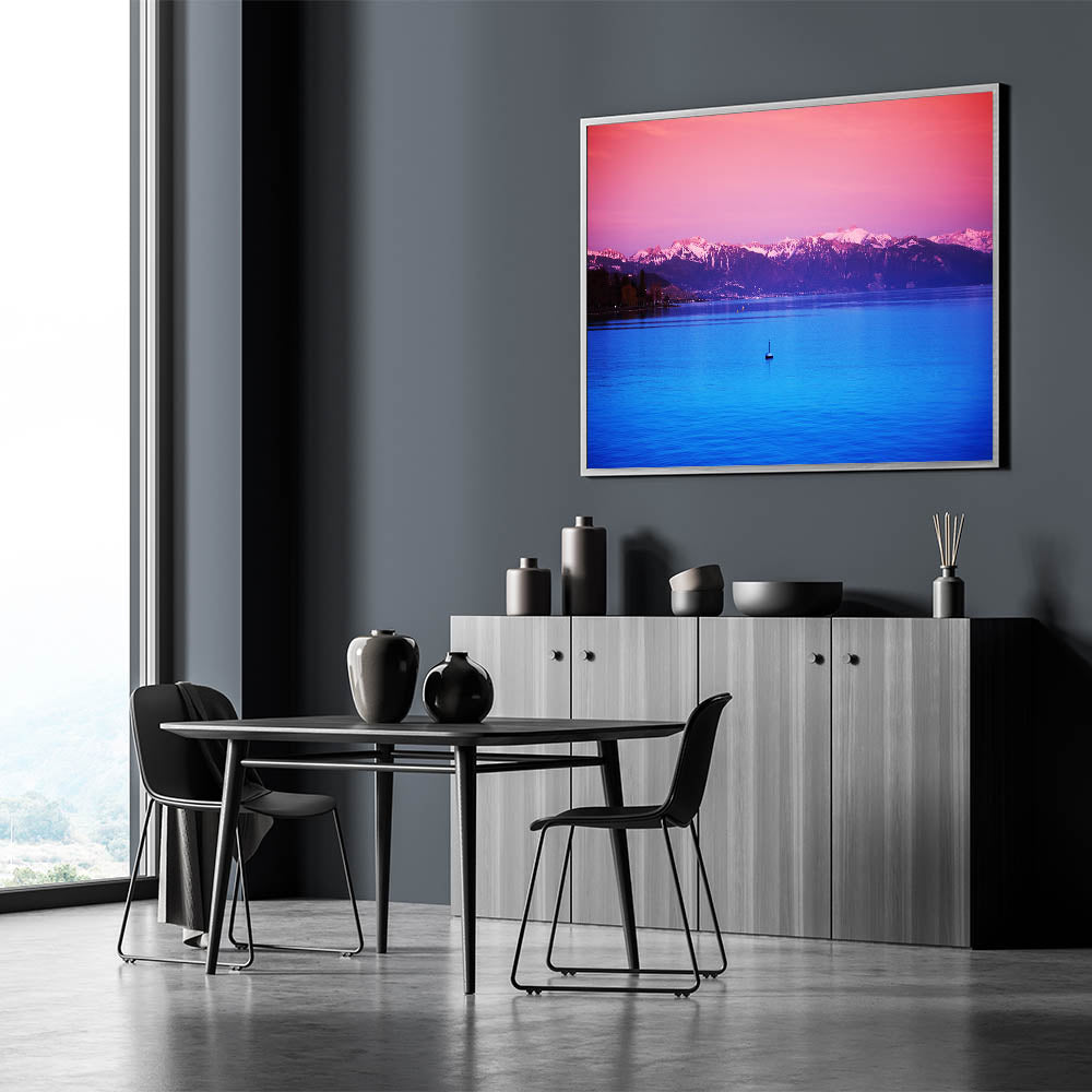 Capture the breathtaking beauty of Geneva’s serene lakeside with this vibrant sunset wall art. Featuring a stunning view of the distant snow-capped Alps against a backdrop of vivid pink and blue skies, this artwork embodies the essence of Geneva’s natural beauty. Perfect for creating a calming atmosphere in your living space, this Geneva wall art will instantly elevate your decor.