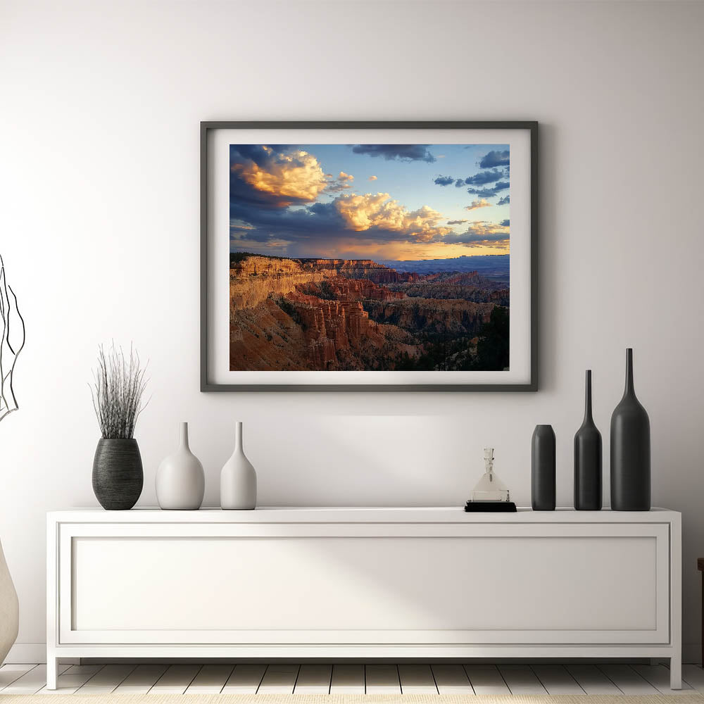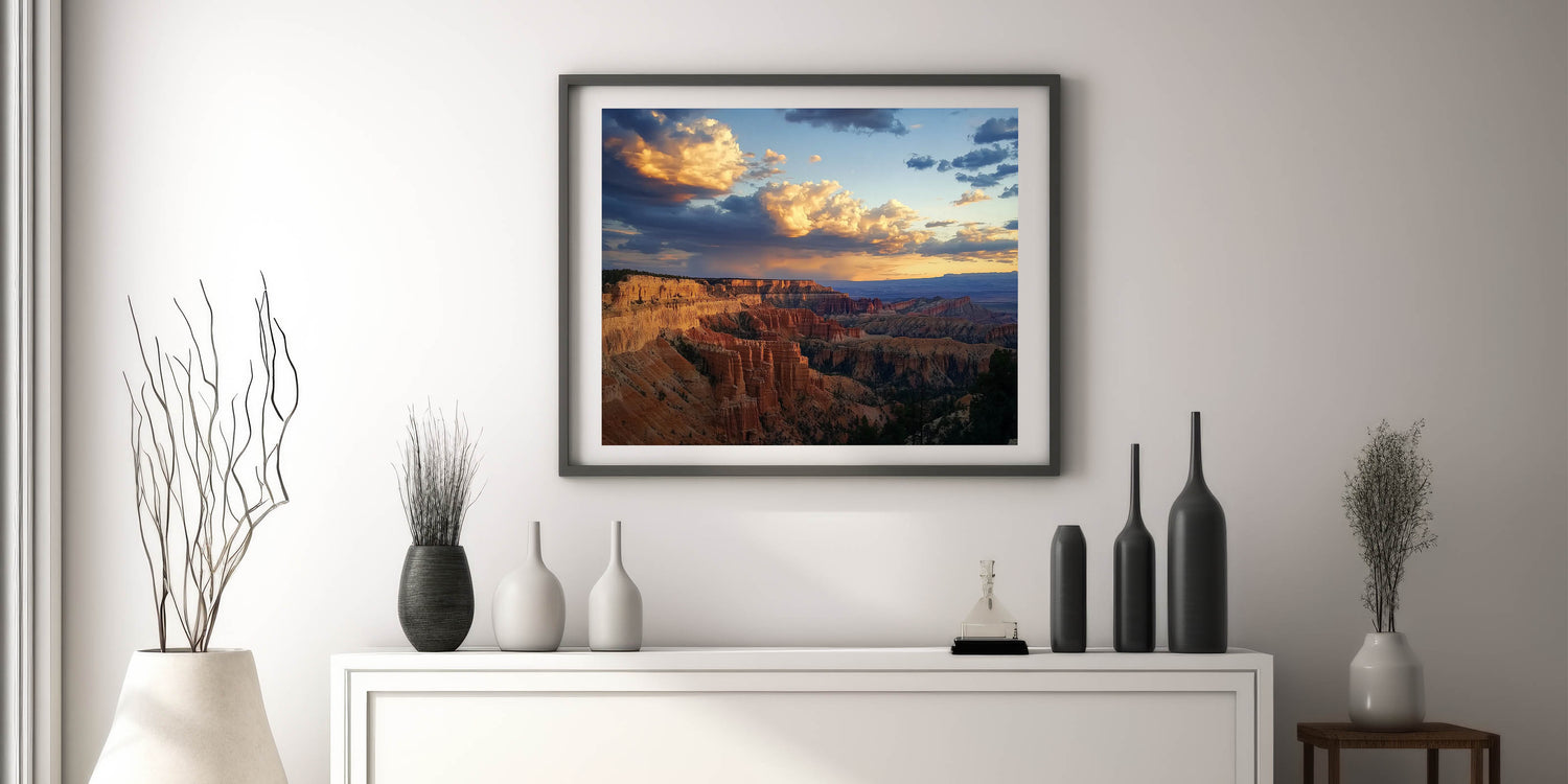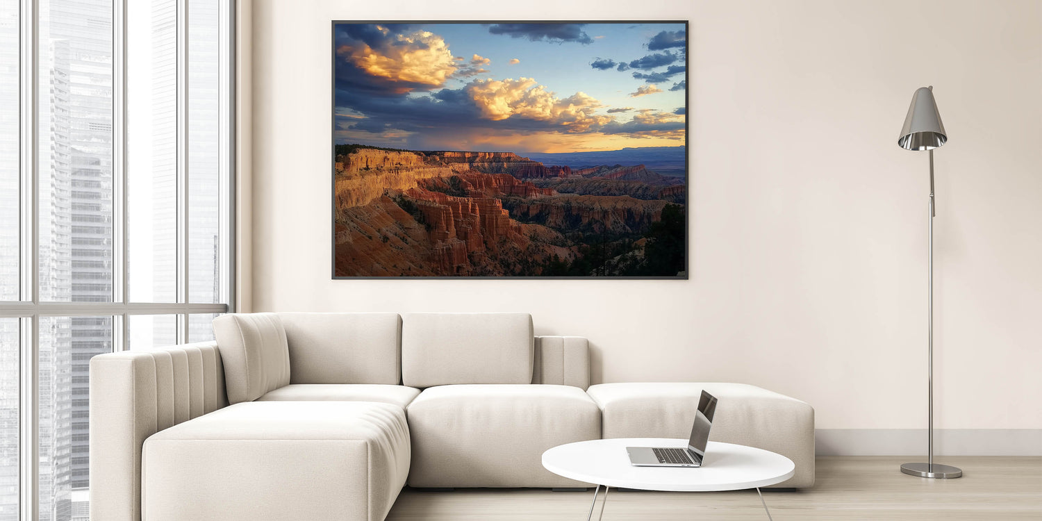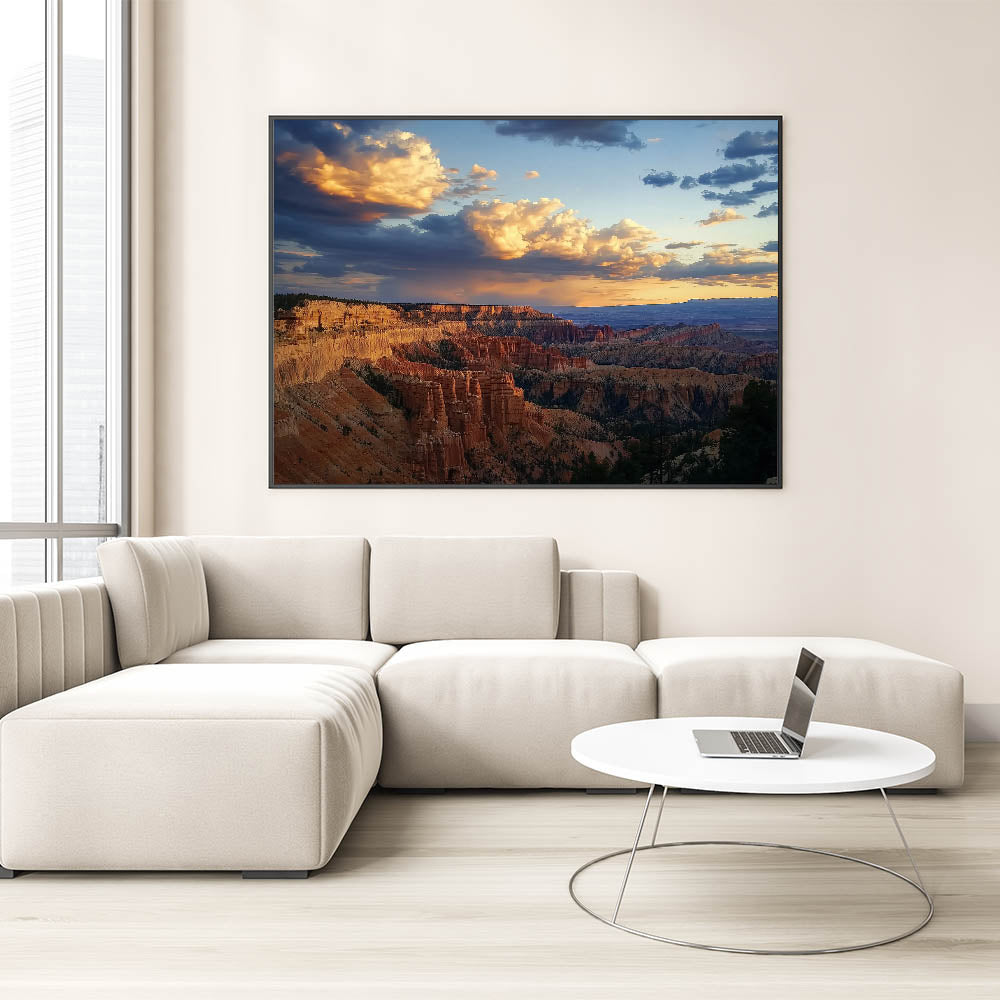 Transform your living space with the radiant charm of this Golden Canyon Wall Art. Showcasing the vibrant hues of a canyon bathed in golden sunlight, this piece captures the grandeur of nature at its finest. Perfect for adding a warm and inviting ambiance to any room, this artwork combines dramatic skies and breathtaking canyon formations in a stunning composition.