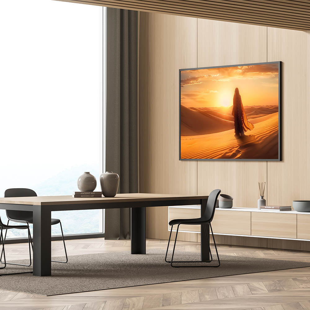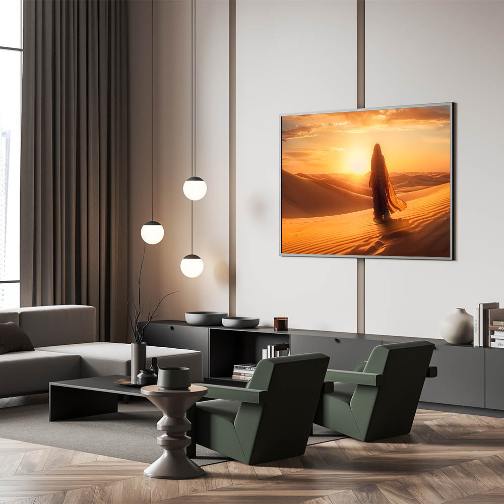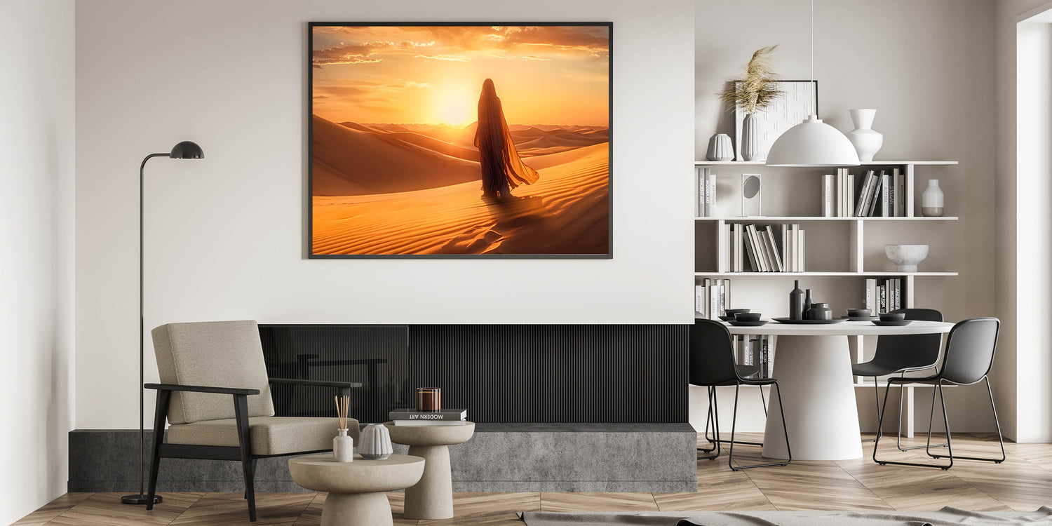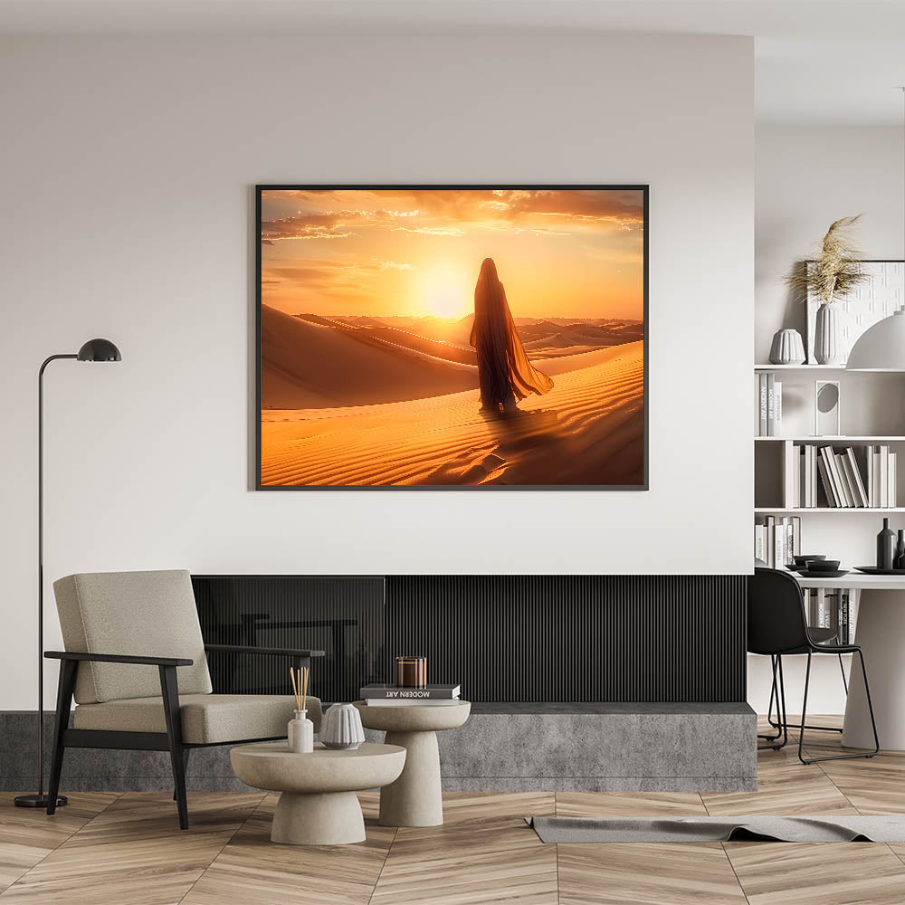Embrace the serene beauty of the desert with this captivating wall art, featuring a golden sunrise over undulating sand dunes. The silhouette of a solitary figure, draped in flowing garments, stands in quiet contemplation, perfectly framing the peaceful and introspective mood of the scene. The soft golden light bathes the landscape, creating a warm and inviting atmosphere that evokes a sense of tranquility and reflection.