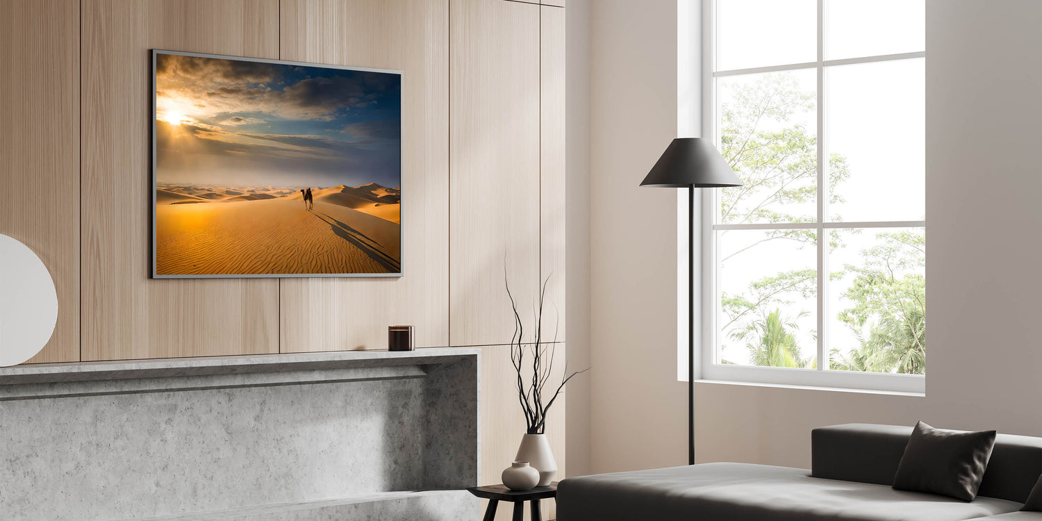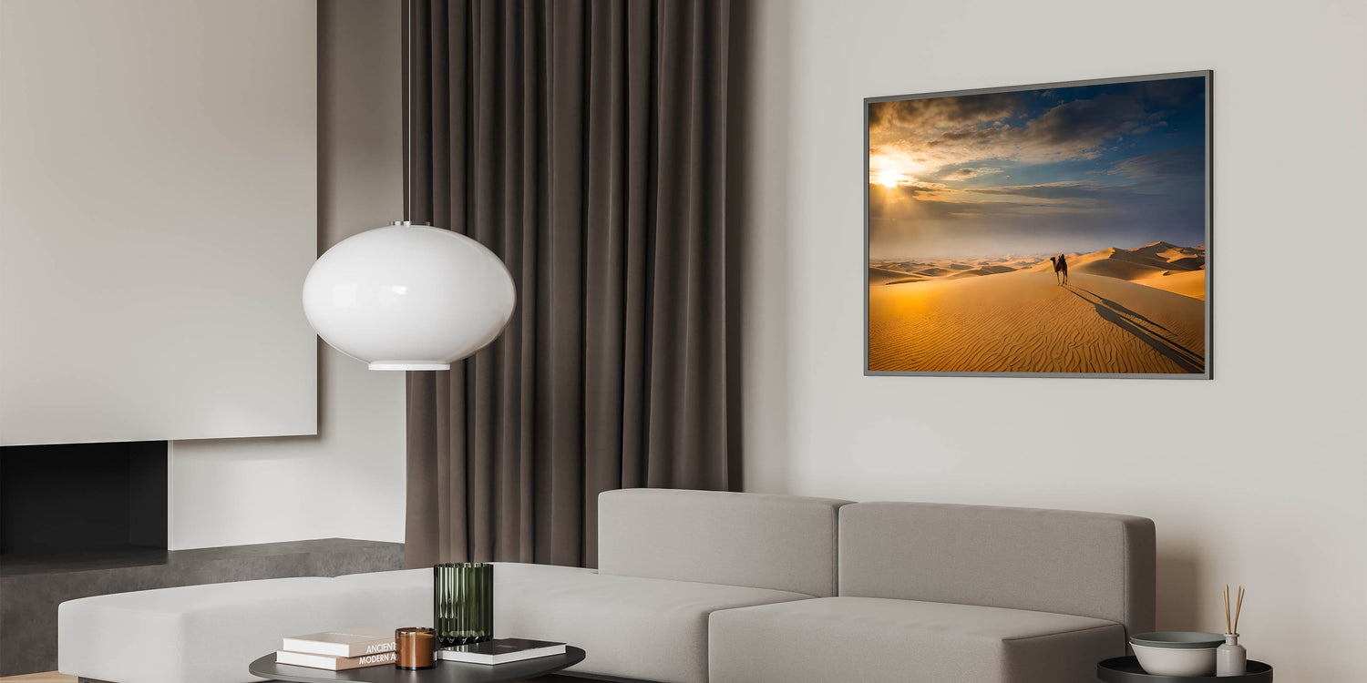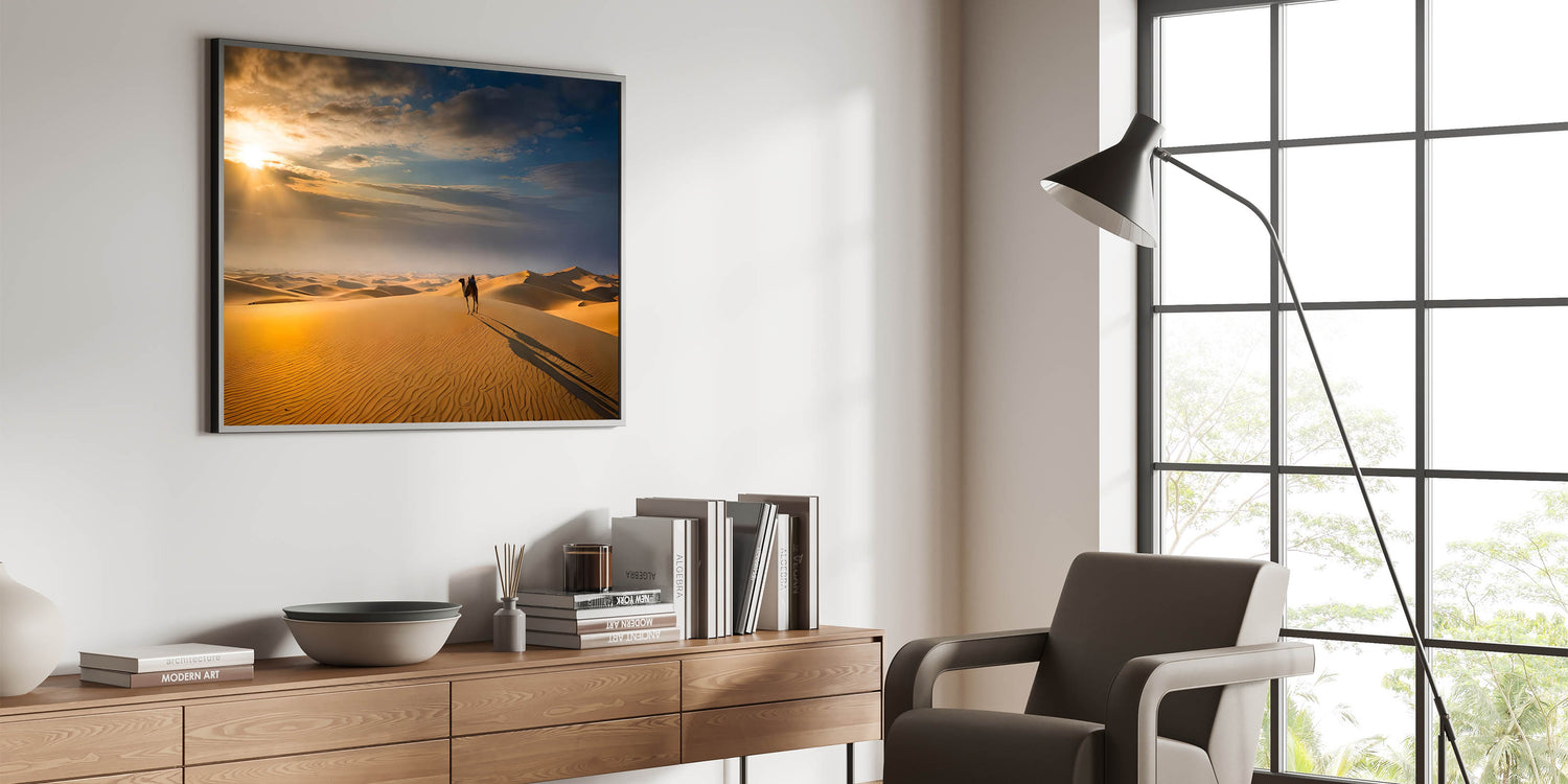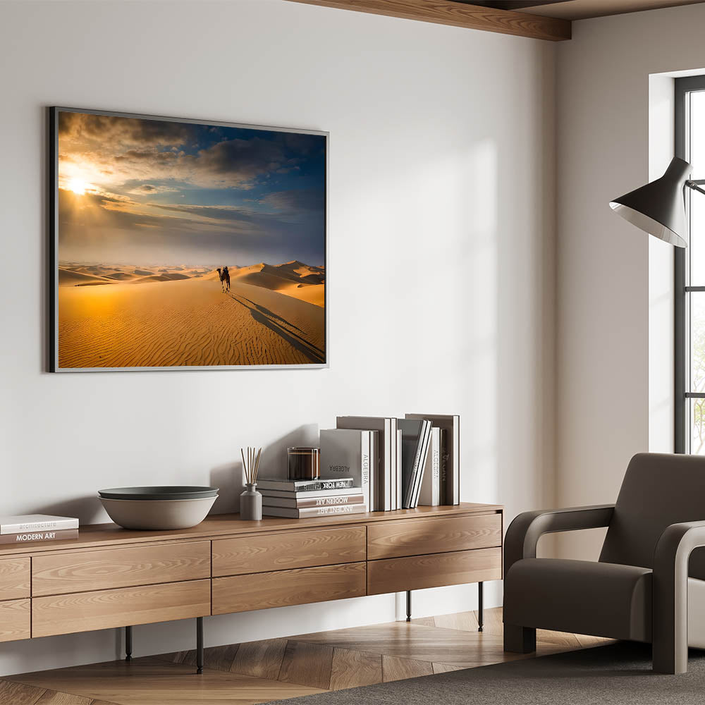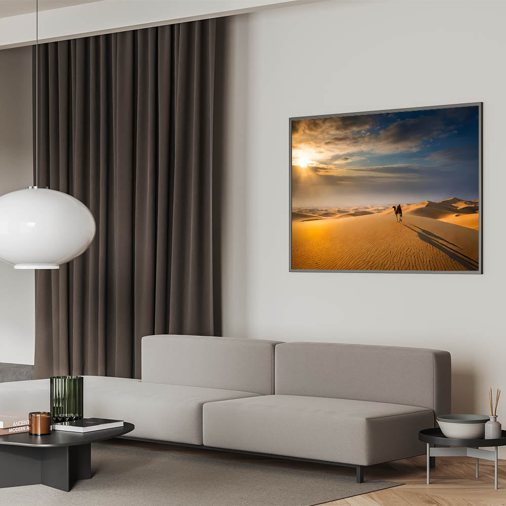 - High-quality dune wall art featuring a picturesque desert landscape with a camel at sunrise.