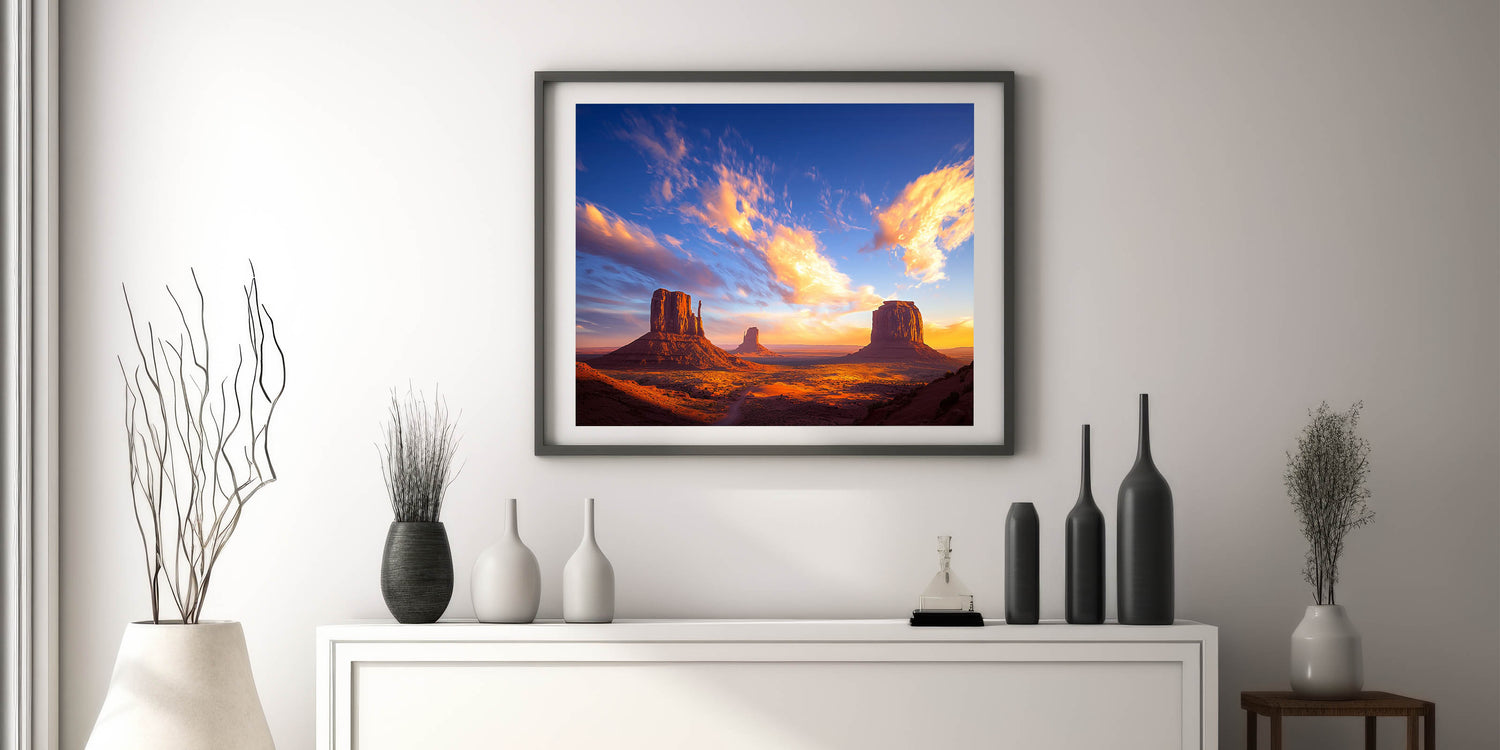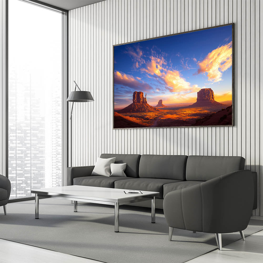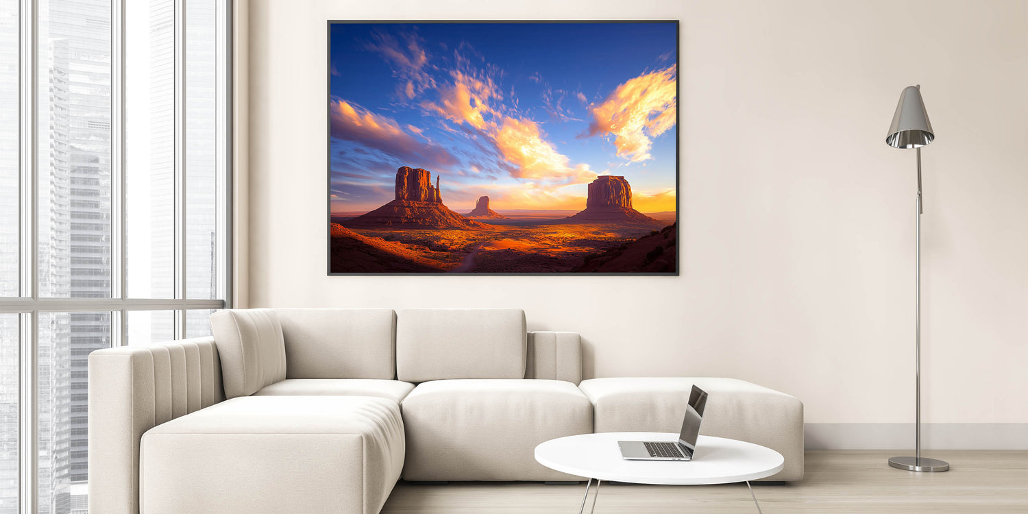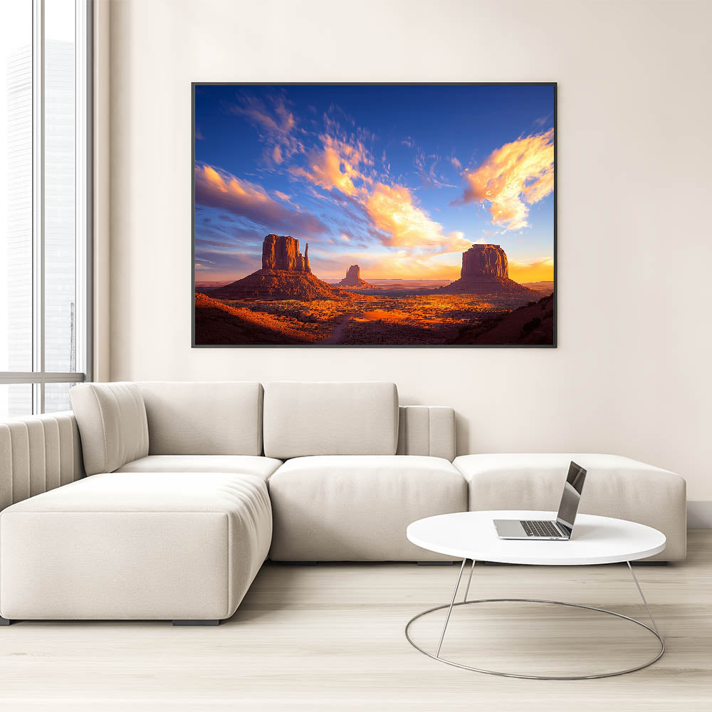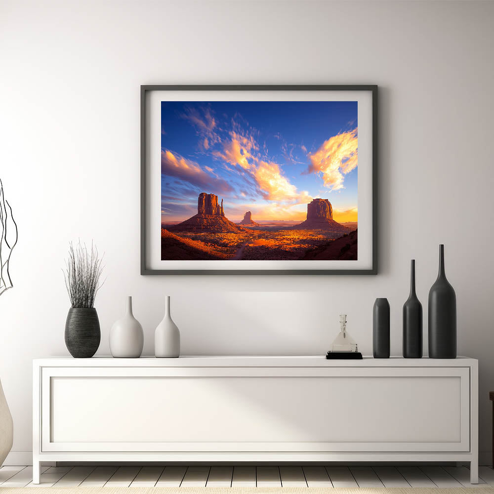 Enhance your decor with the breathtaking Golden Glow Monument Valley Wall Art. This stunning piece captures the iconic Monument Valley buttes illuminated by the warm light of sunrise, framed by a brilliant sky filled with dynamic clouds. A striking example of desert scenery prints, it brings a sense of tranquility and natural elegance to any space.
