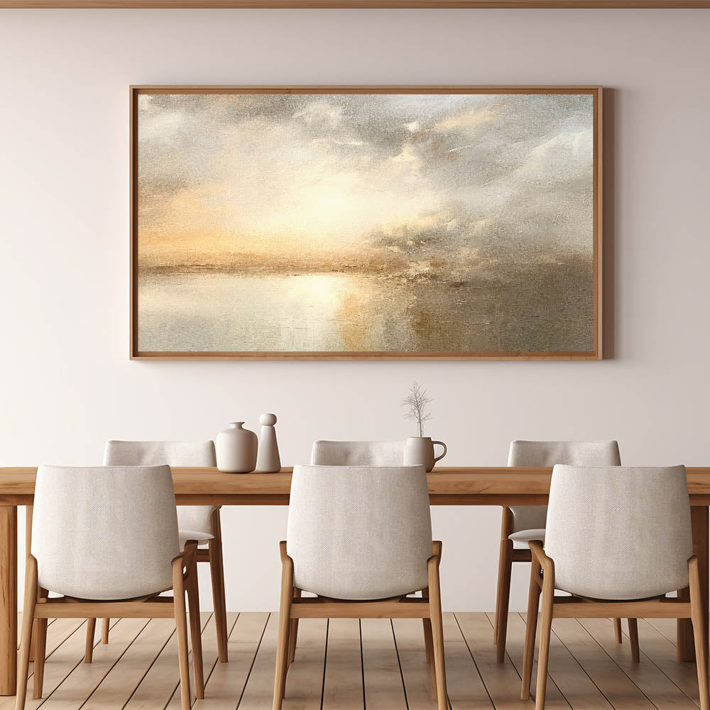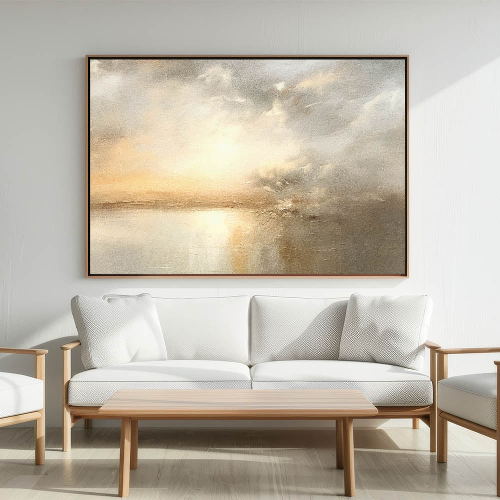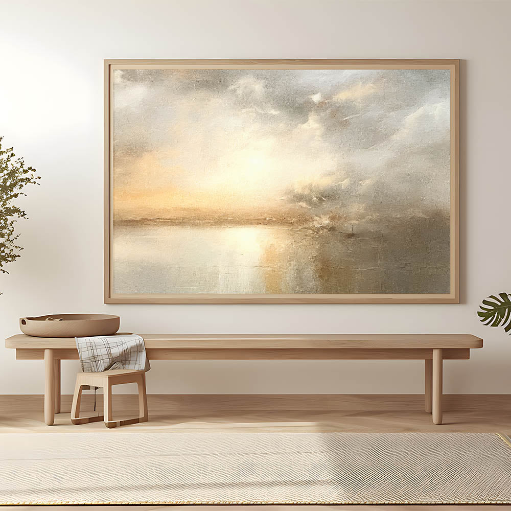 This tranquil abstract landscape captures the serene beauty of a sunset over a calm horizon, with warm golden hues and soft gray clouds. The gentle blending of light and shadow creates a peaceful ambiance, ideal for adding warmth and sophistication to any space. Perfect for contemporary and minimalist decor styles, this artwork brings a touch of elegance and calm to your home.