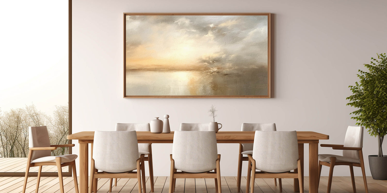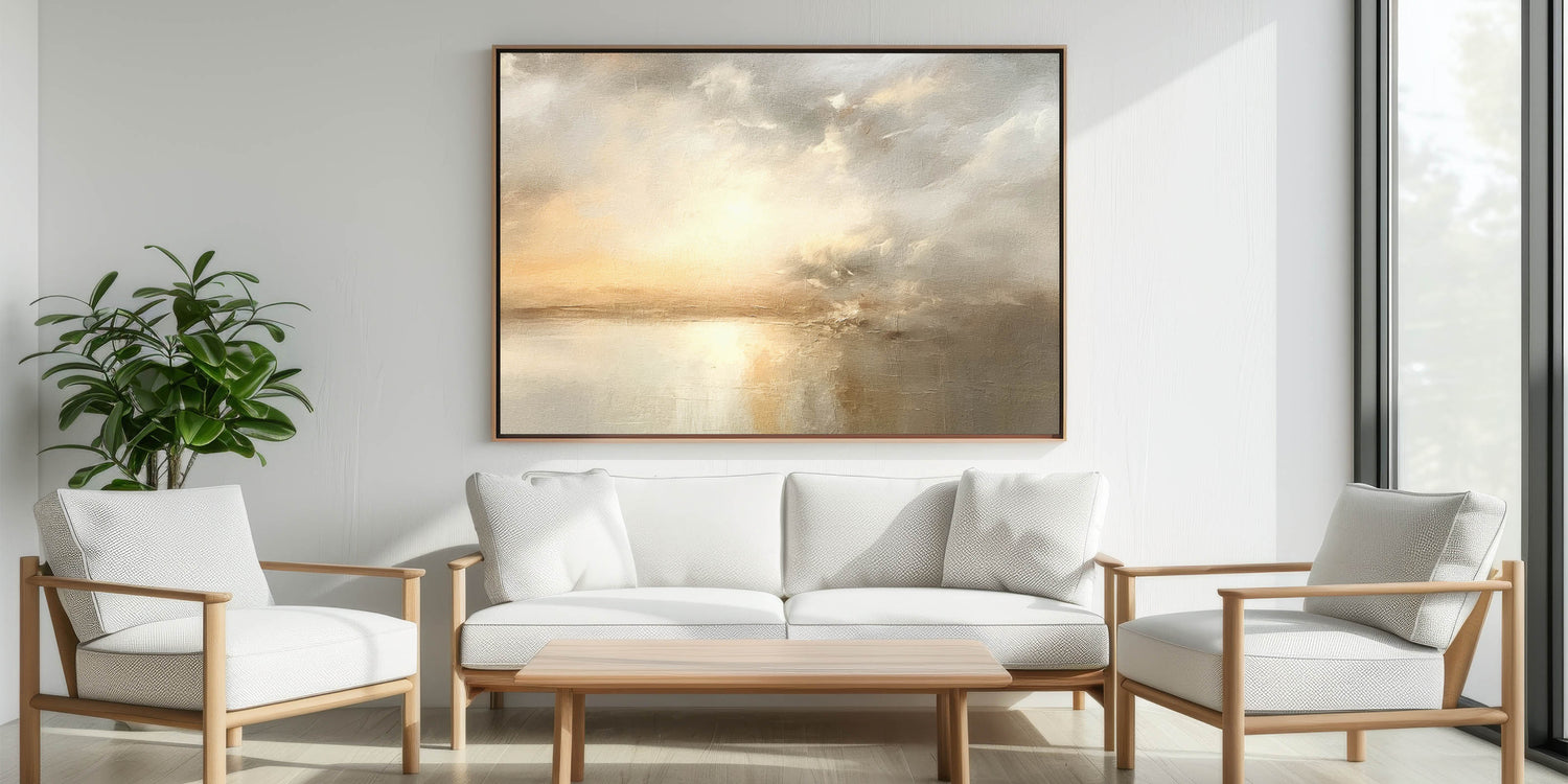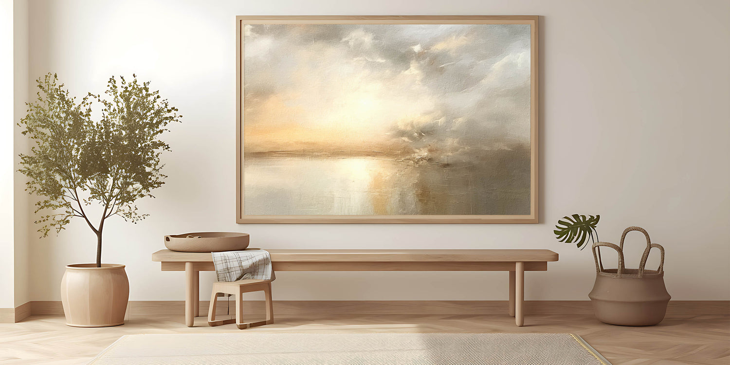 This tranquil abstract landscape captures the serene beauty of a sunset over a calm horizon, with warm golden hues and soft gray clouds. The gentle blending of light and shadow creates a peaceful ambiance, ideal for adding warmth and sophistication to any space. Perfect for contemporary and minimalist decor styles, this artwork brings a touch of elegance and calm to your home.