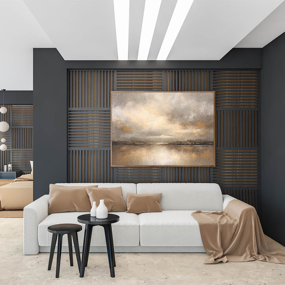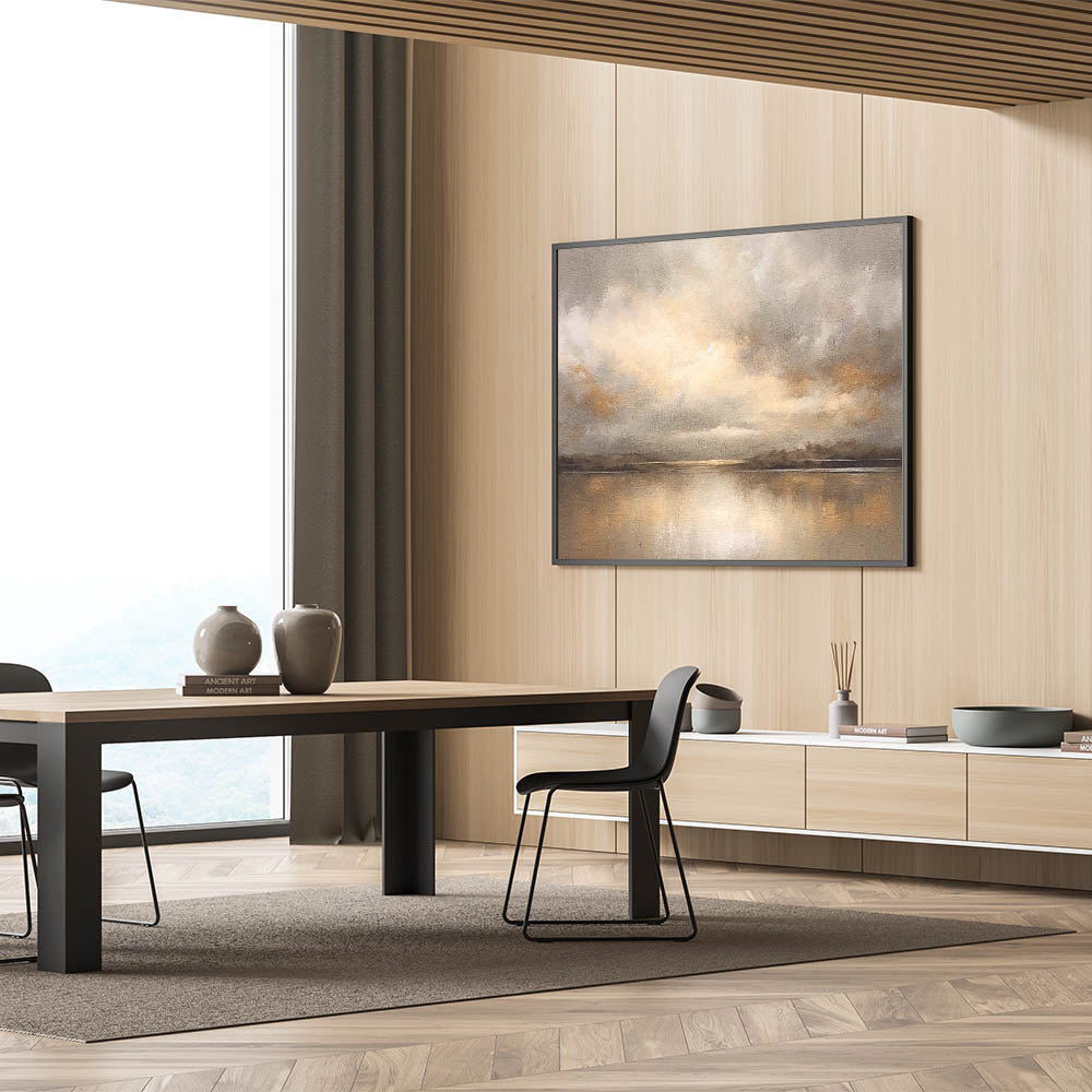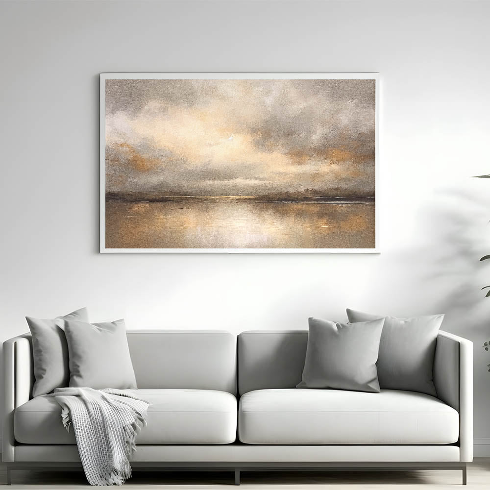 Experience the warmth of a golden sunset with this contemporary landscape abstract. This captivating piece portrays a serene scene where clouds gather over a calm horizon, infused with tones of gold, beige, and subtle grays. The artwork’s soft textures and reflective water create a peaceful ambiance, perfect for adding elegance and tranquility to your home.