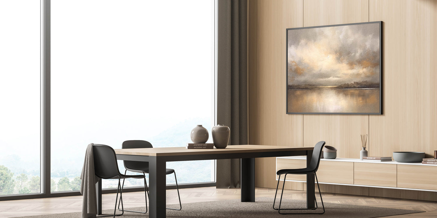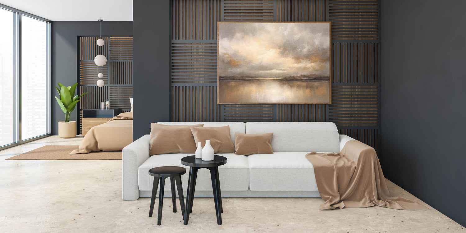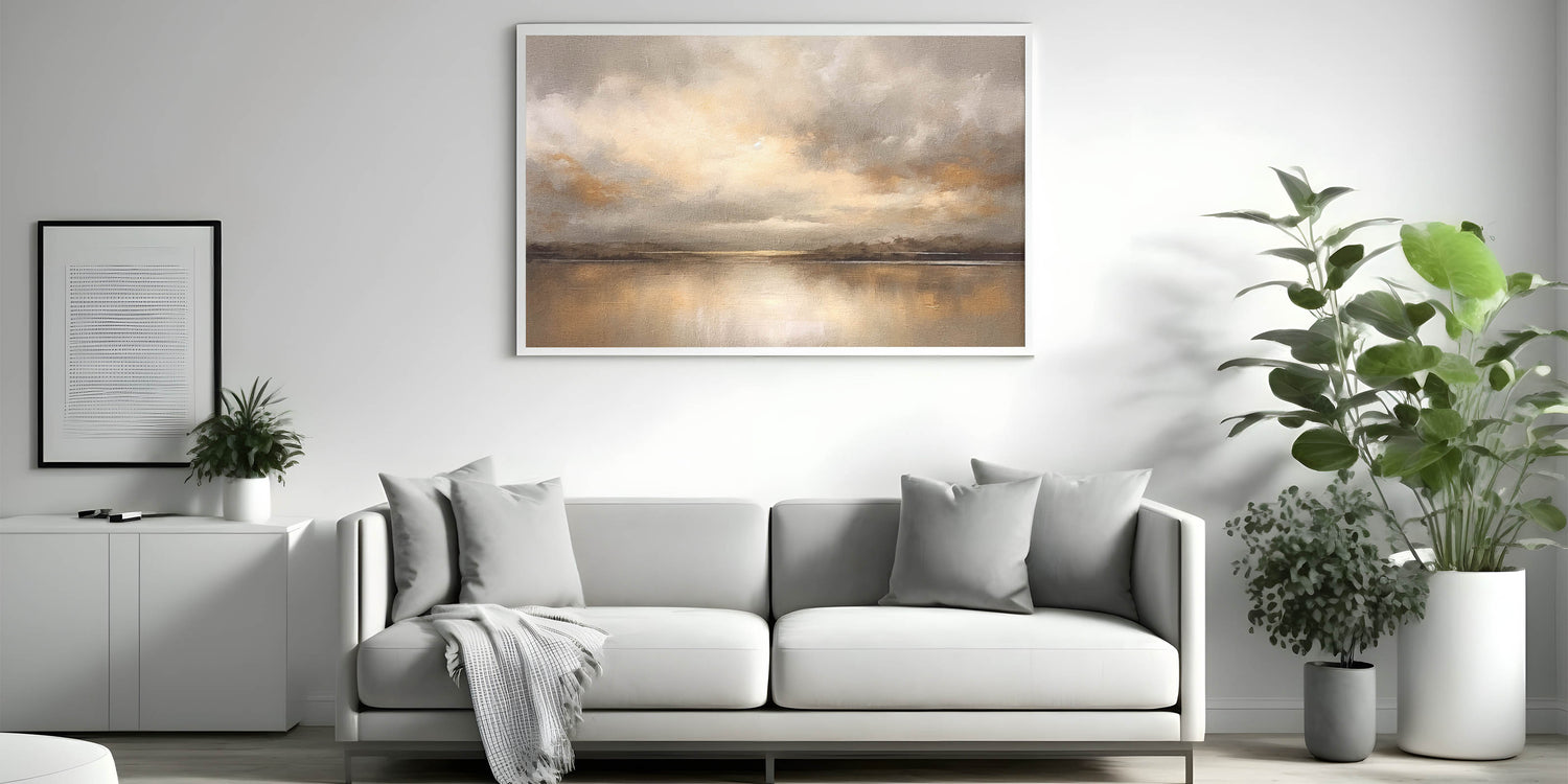 Experience the warmth of a golden sunset with this contemporary landscape abstract. This captivating piece portrays a serene scene where clouds gather over a calm horizon, infused with tones of gold, beige, and subtle grays. The artwork’s soft textures and reflective water create a peaceful ambiance, perfect for adding elegance and tranquility to your home.