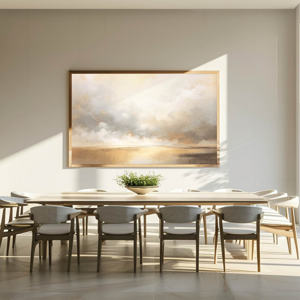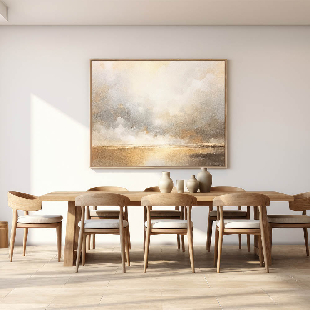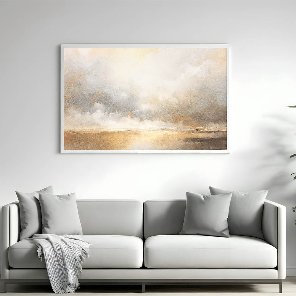This tranquil abstract landscape captures the ethereal beauty of a golden horizon with soft clouds drifting across the sky. Featuring warm shades of gold, beige, and gentle gray, this artwork creates a calming ambiance reminiscent of a serene sunset. Ideal for adding elegance and warmth to any space, this piece complements contemporary, coastal, and minimalist decor styles.