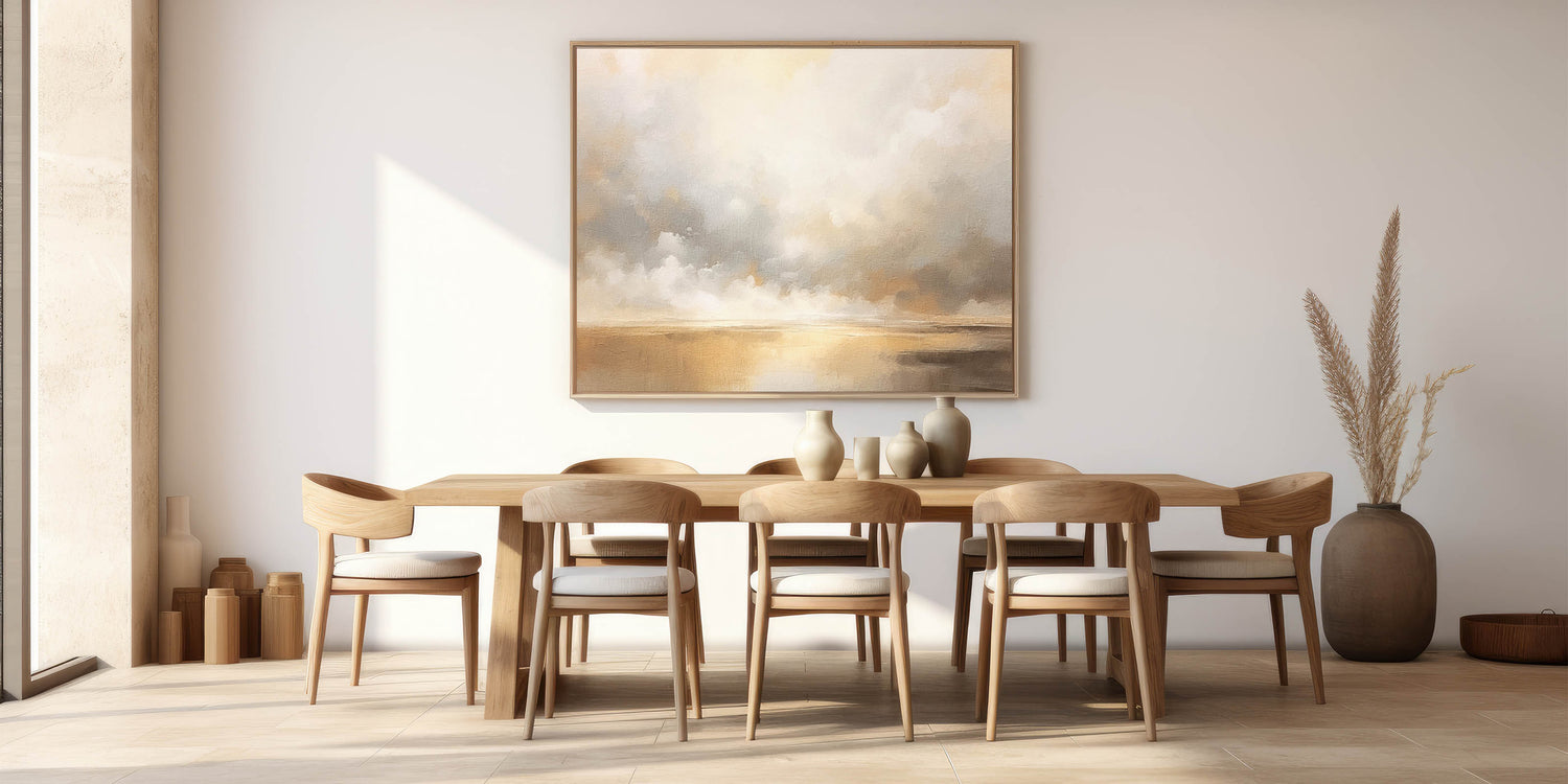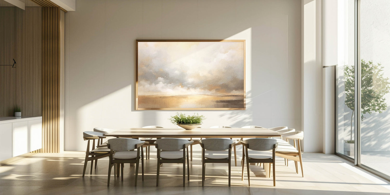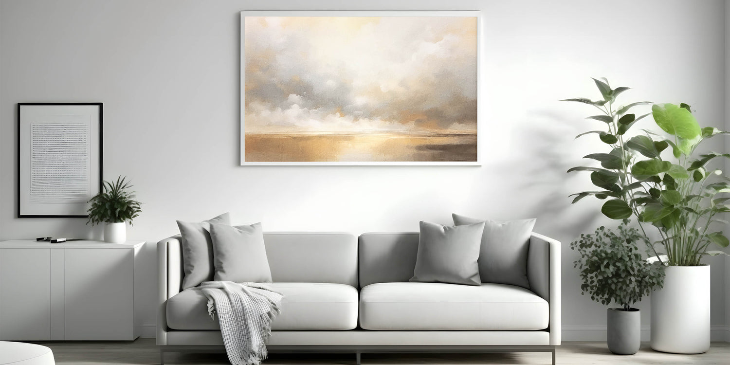 This tranquil abstract landscape captures the ethereal beauty of a golden horizon with soft clouds drifting across the sky. Featuring warm shades of gold, beige, and gentle gray, this artwork creates a calming ambiance reminiscent of a serene sunset. Ideal for adding elegance and warmth to any space, this piece complements contemporary, coastal, and minimalist decor styles.