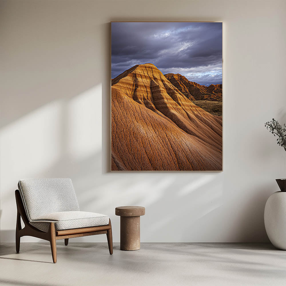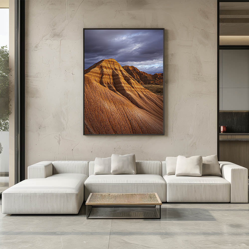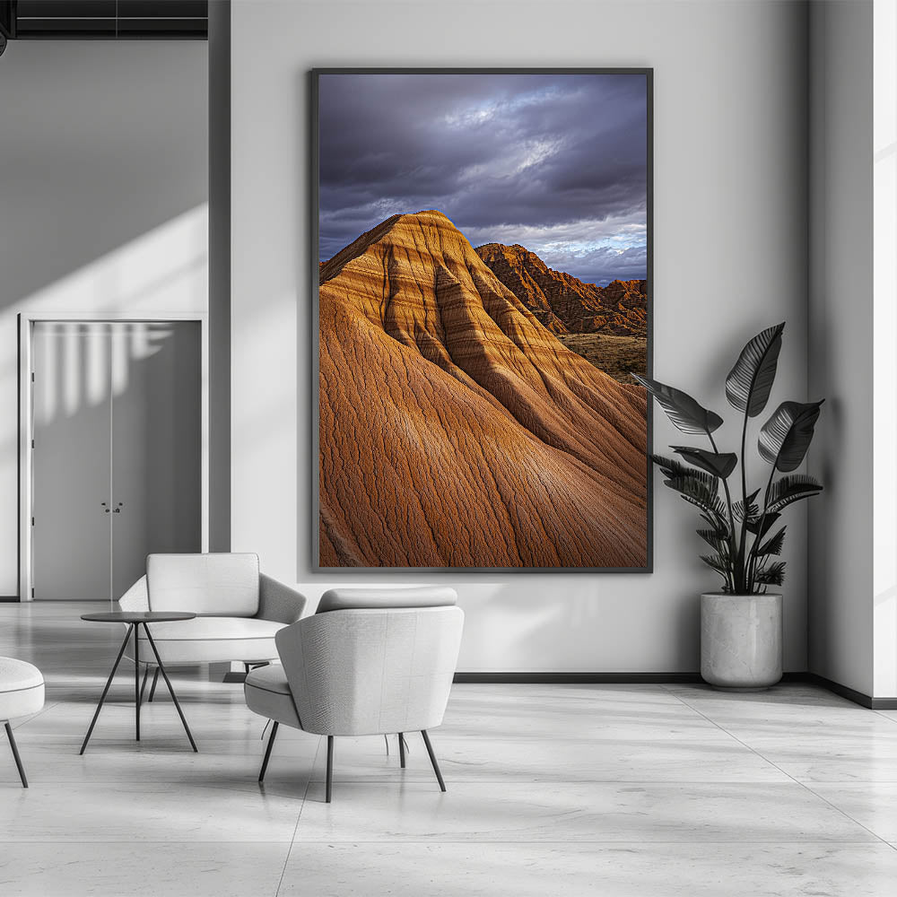 Enhance your home with this breathtaking desert wall art, showcasing the rugged beauty and golden hues of sandstone landscapes under dramatic skies. This piece captures the raw essence of desert formations, perfect for anyone seeking modern desert wall decor. Its rich textures and vibrant details bring a warm and serene ambiance to any space.