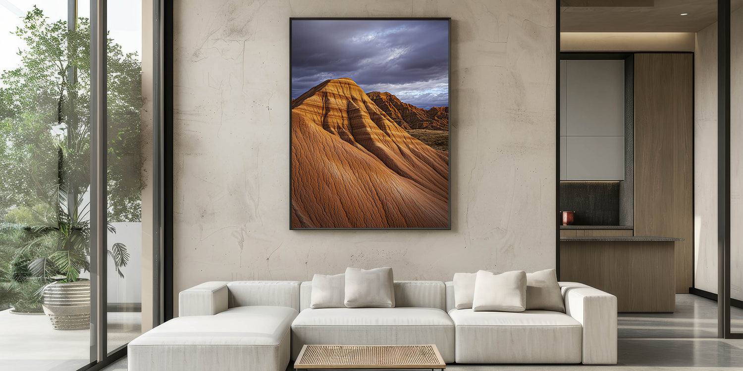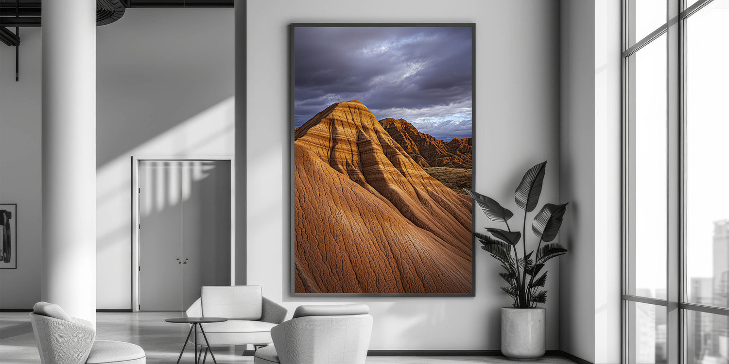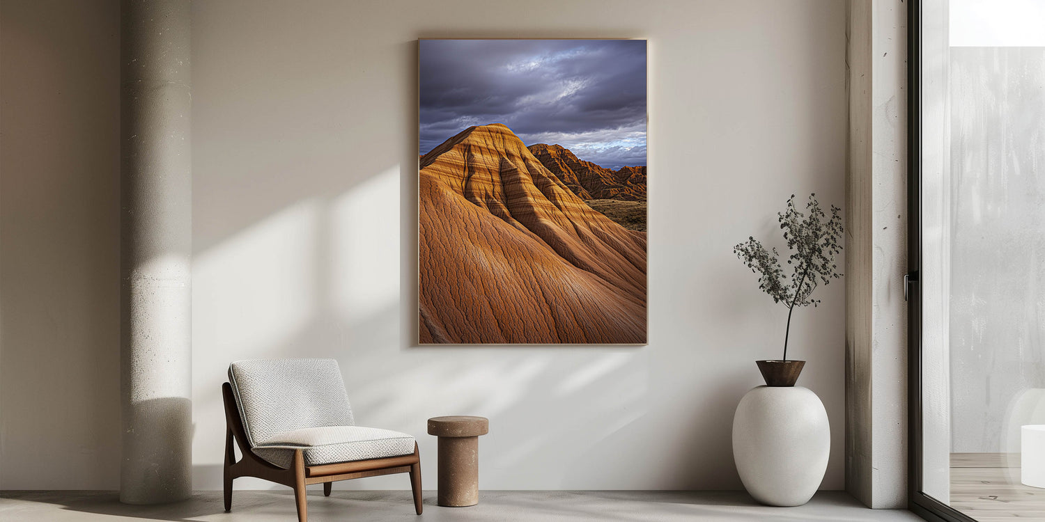 Enhance your home with this breathtaking desert wall art, showcasing the rugged beauty and golden hues of sandstone landscapes under dramatic skies. This piece captures the raw essence of desert formations, perfect for anyone seeking modern desert wall decor. Its rich textures and vibrant details bring a warm and serene ambiance to any space.