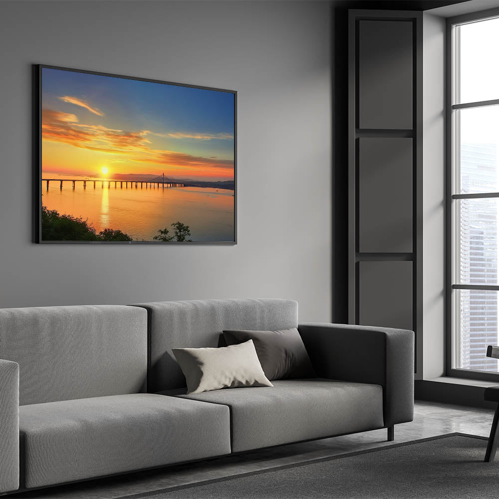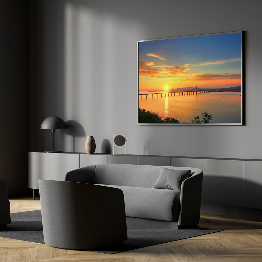 Capture the brilliance of nature with this Golden Sunset Bridge Artwork, featuring a breathtaking view of a bridge bathed in the warm glow of a setting sun. The vibrant hues of gold, orange, and blue create a mesmerizing scene that adds elegance and serenity to any space.