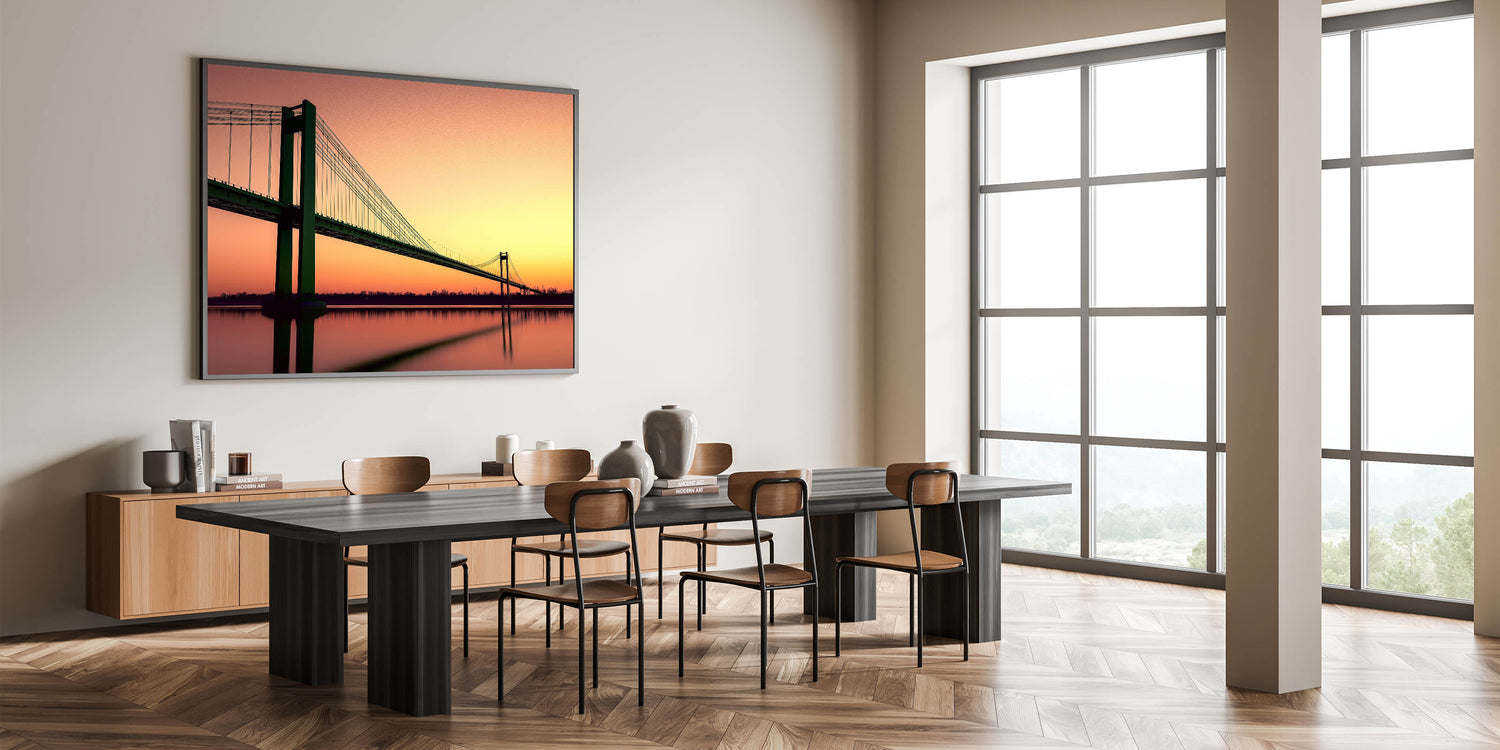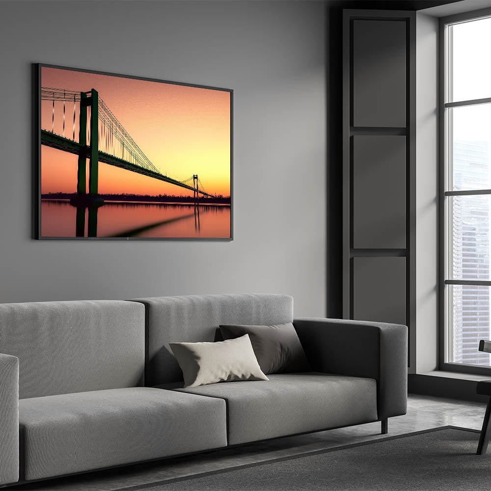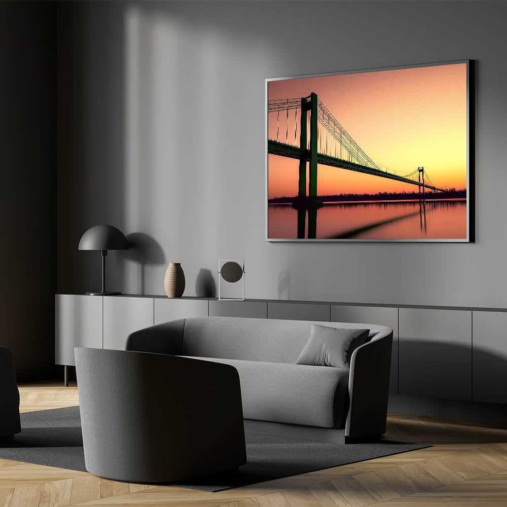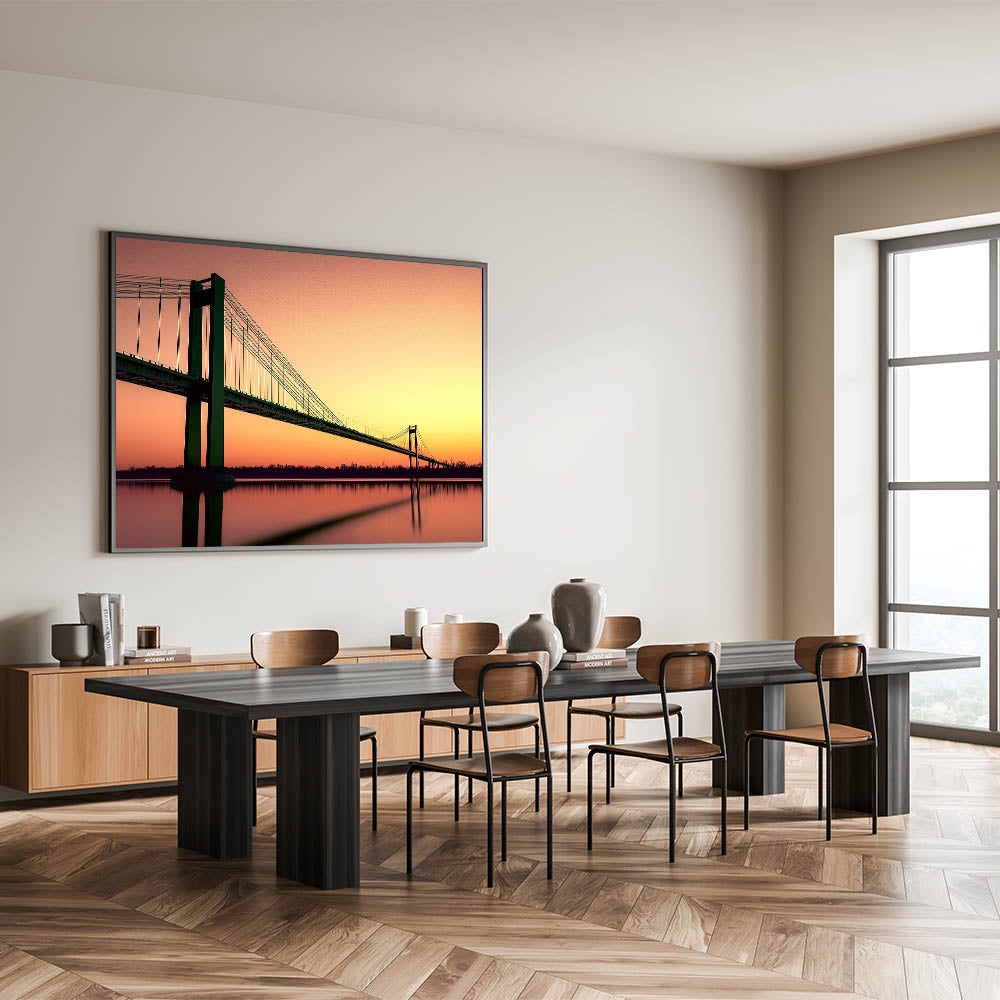 Transform your space with this Golden Suspension Bridge Artwork, featuring a breathtaking view of a suspension bridge silhouetted against a glowing sunset. The rich golden tones and serene reflections on the water create a stunning focal point for any decor.