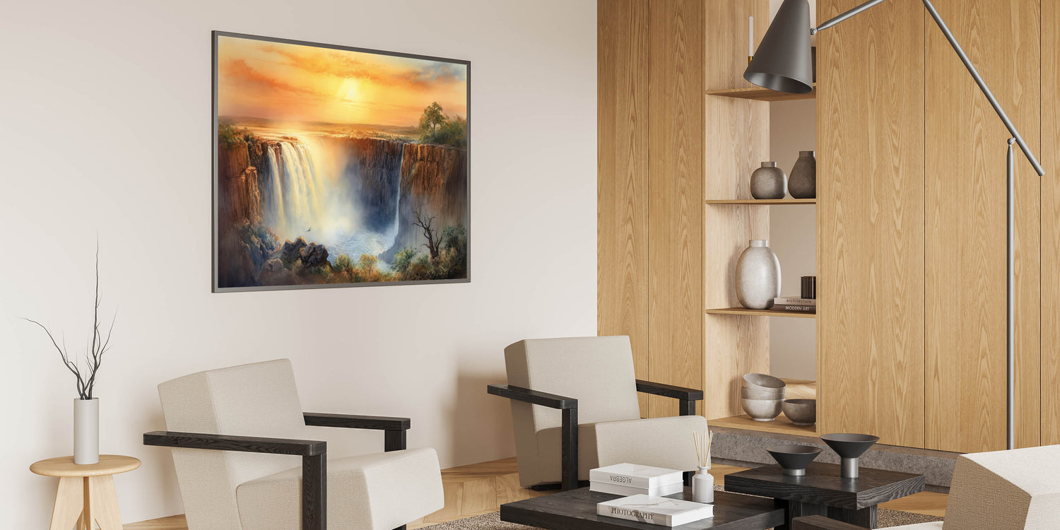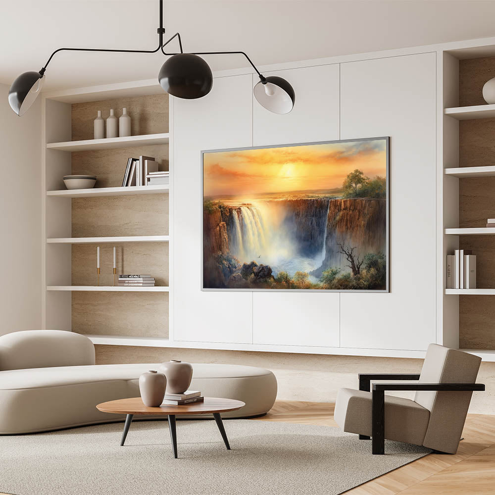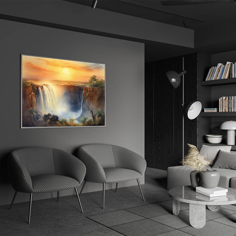 Transform your home with this stunning waterfall painting that captures the magic of a golden sunset. Whether you choose a modern acrylic glass finish or a classic framed print, this artwork is sure to elevate your decor.