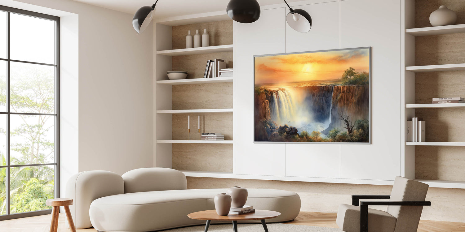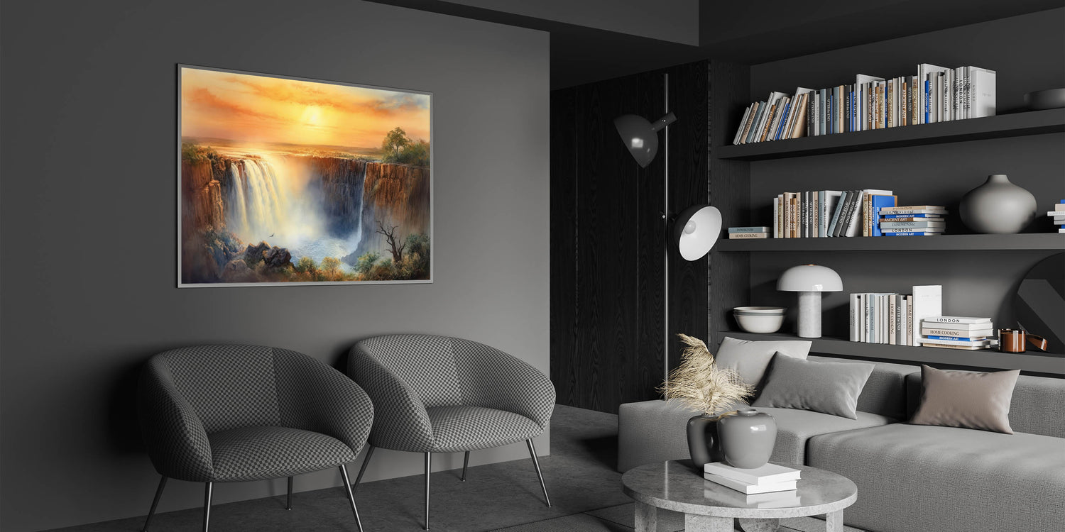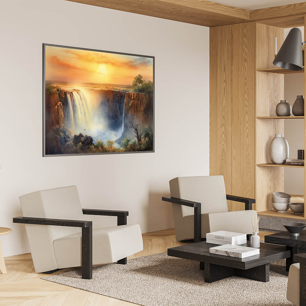 Transform your home with this stunning waterfall painting that captures the magic of a golden sunset. Whether you choose a modern acrylic glass finish or a classic framed print, this artwork is sure to elevate your decor.