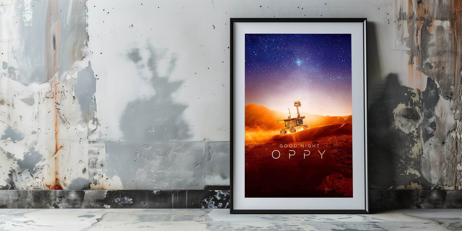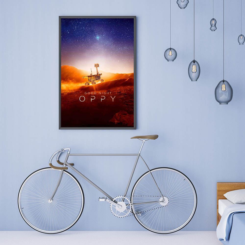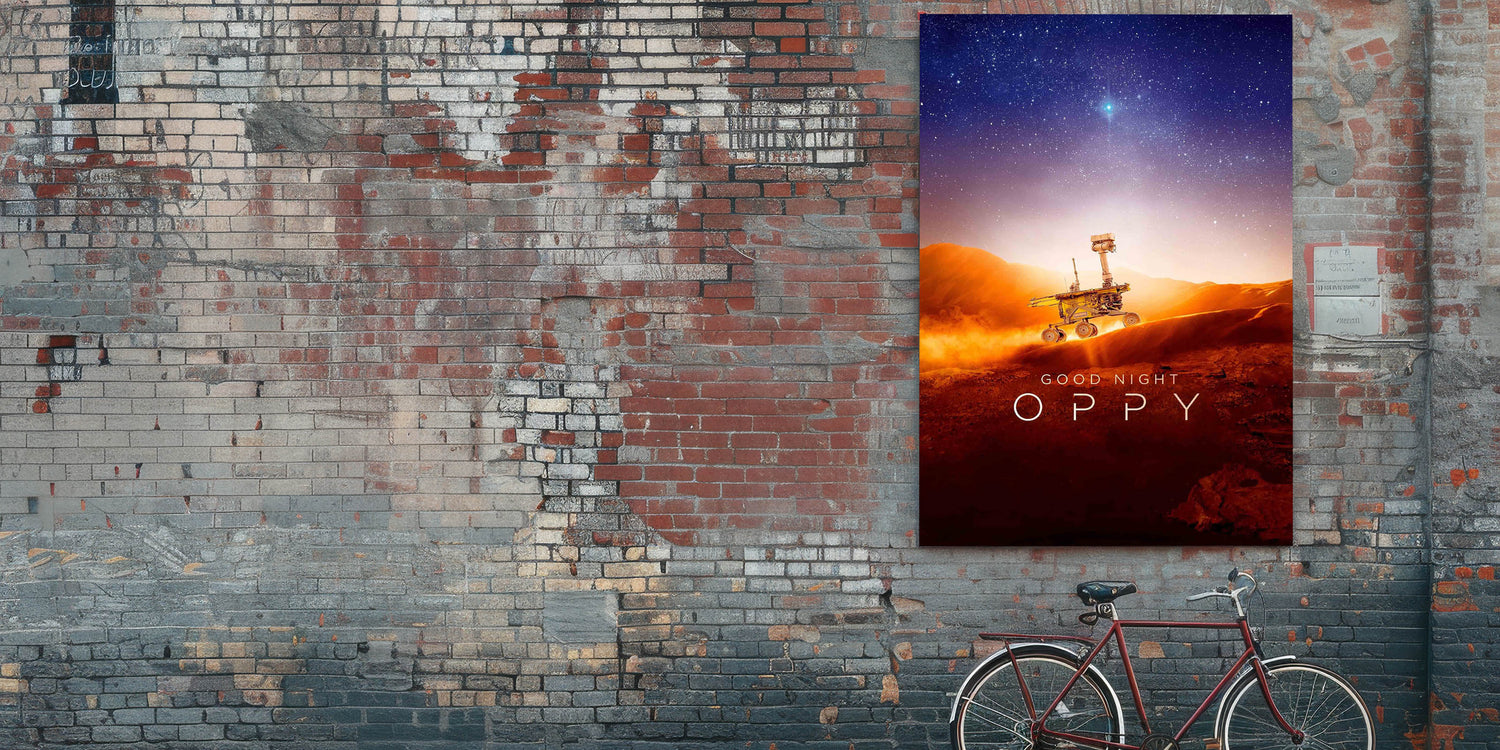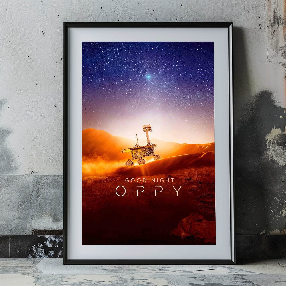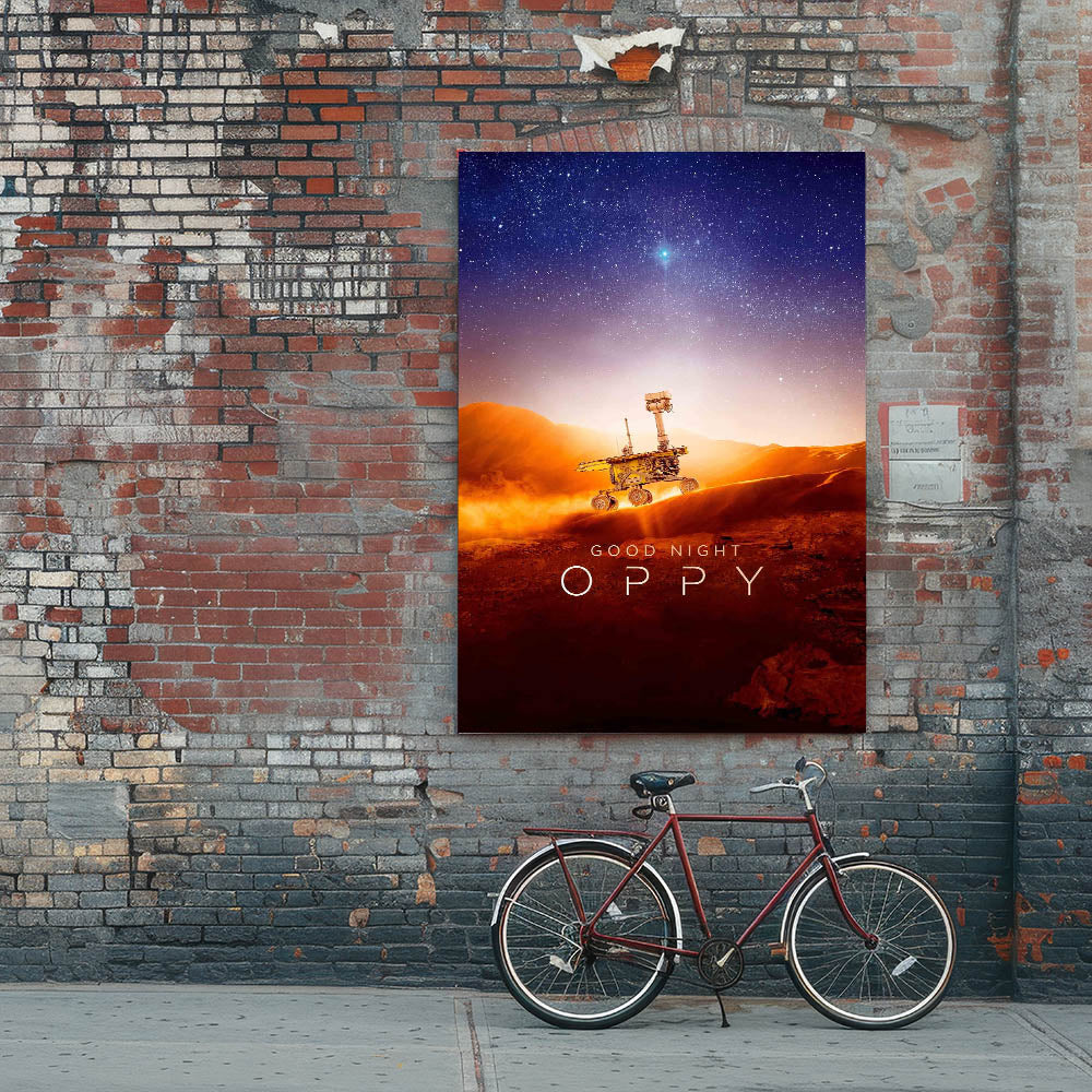 Celebrate the inspiring journey of NASA's Opportunity rover with this Good Night Oppy 2020s vintage movie poster. This retro film art print captures the wonder of space exploration, making it an essential piece for collectible movie prints enthusiasts. The stunning depiction of Mars' landscape, paired with a mesmerizing starry sky, makes this limited edition cinema art perfect for science lovers and film buffs alike.