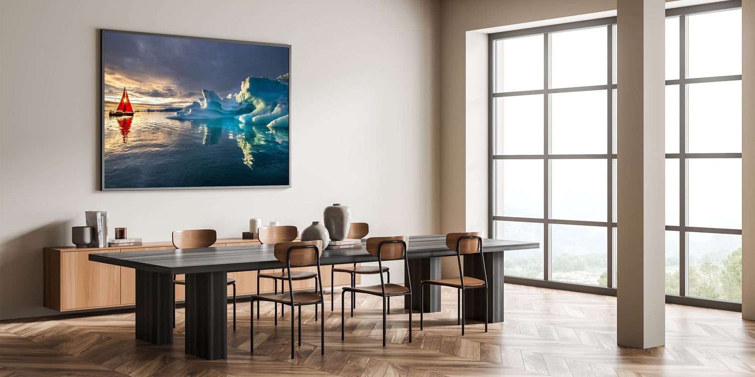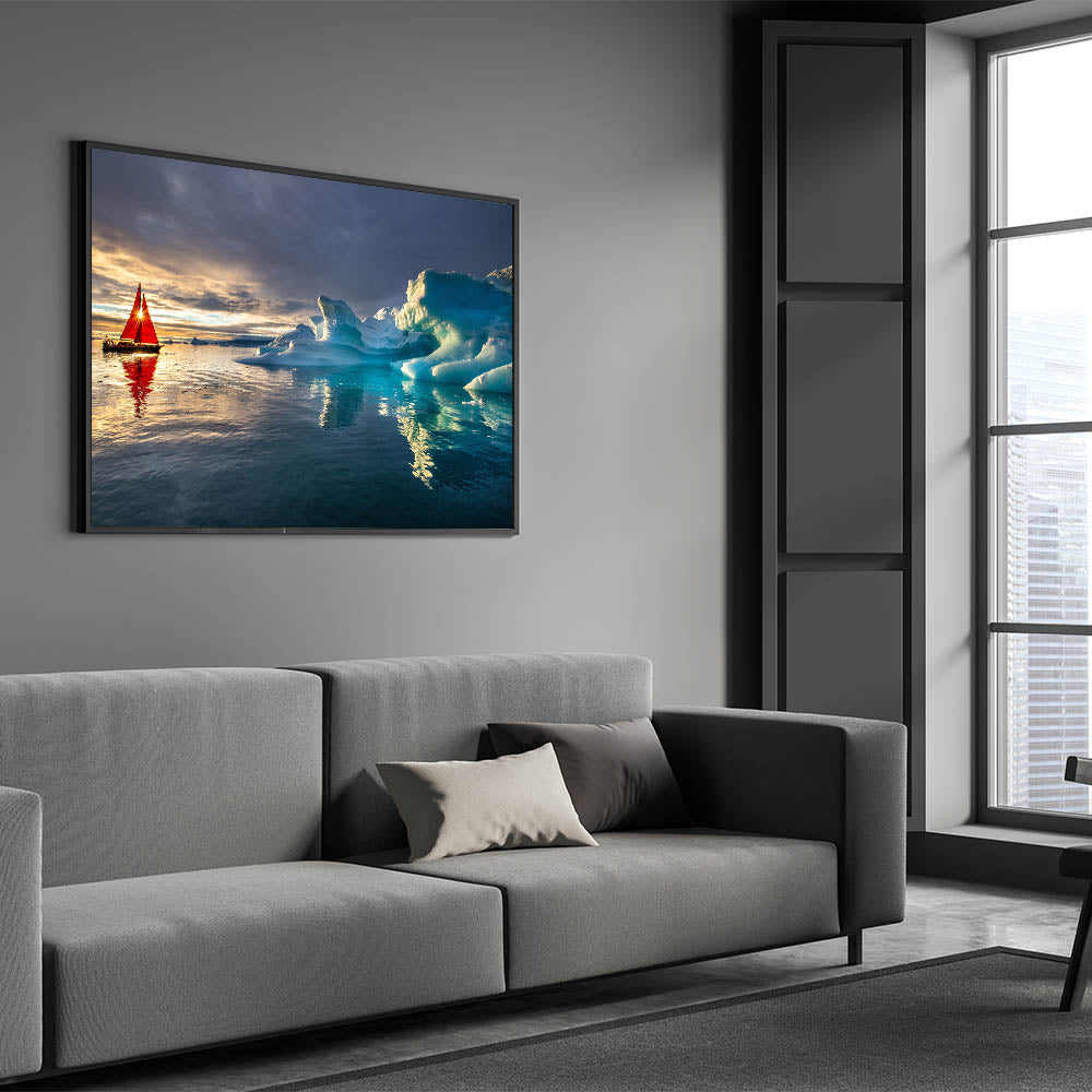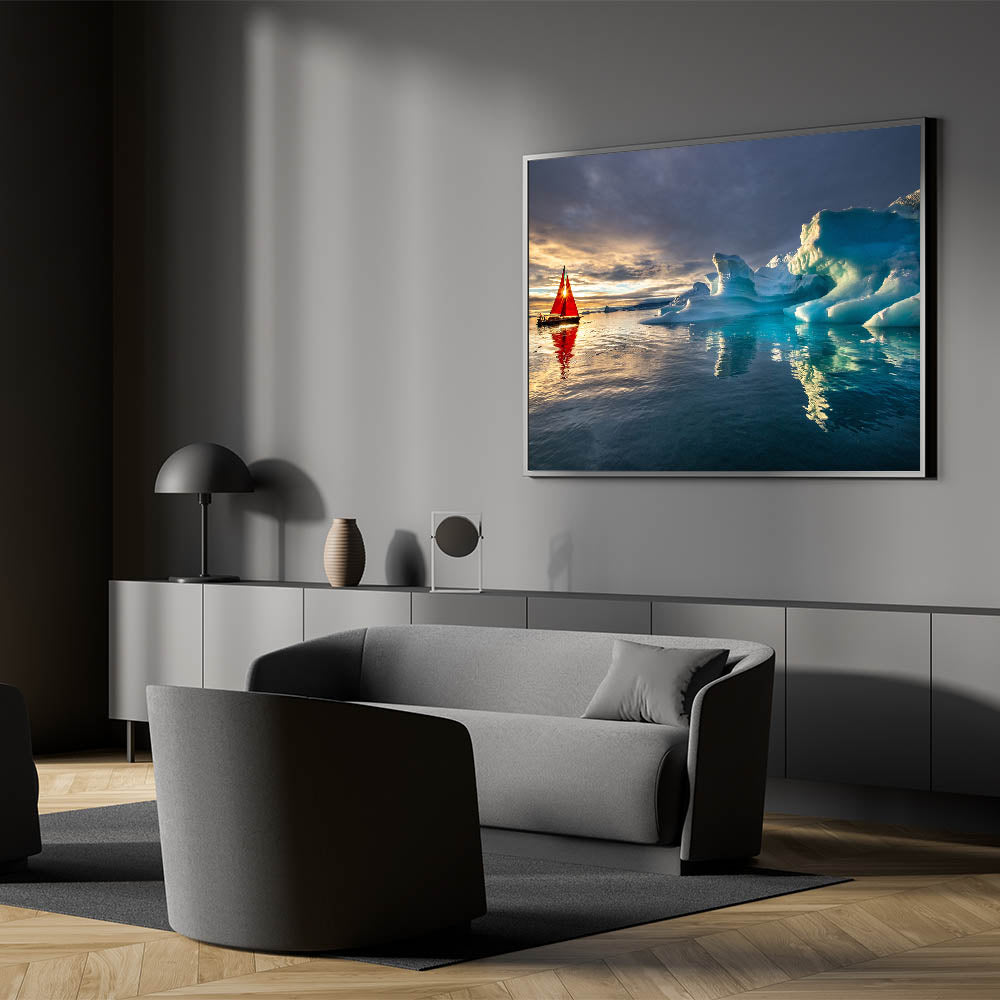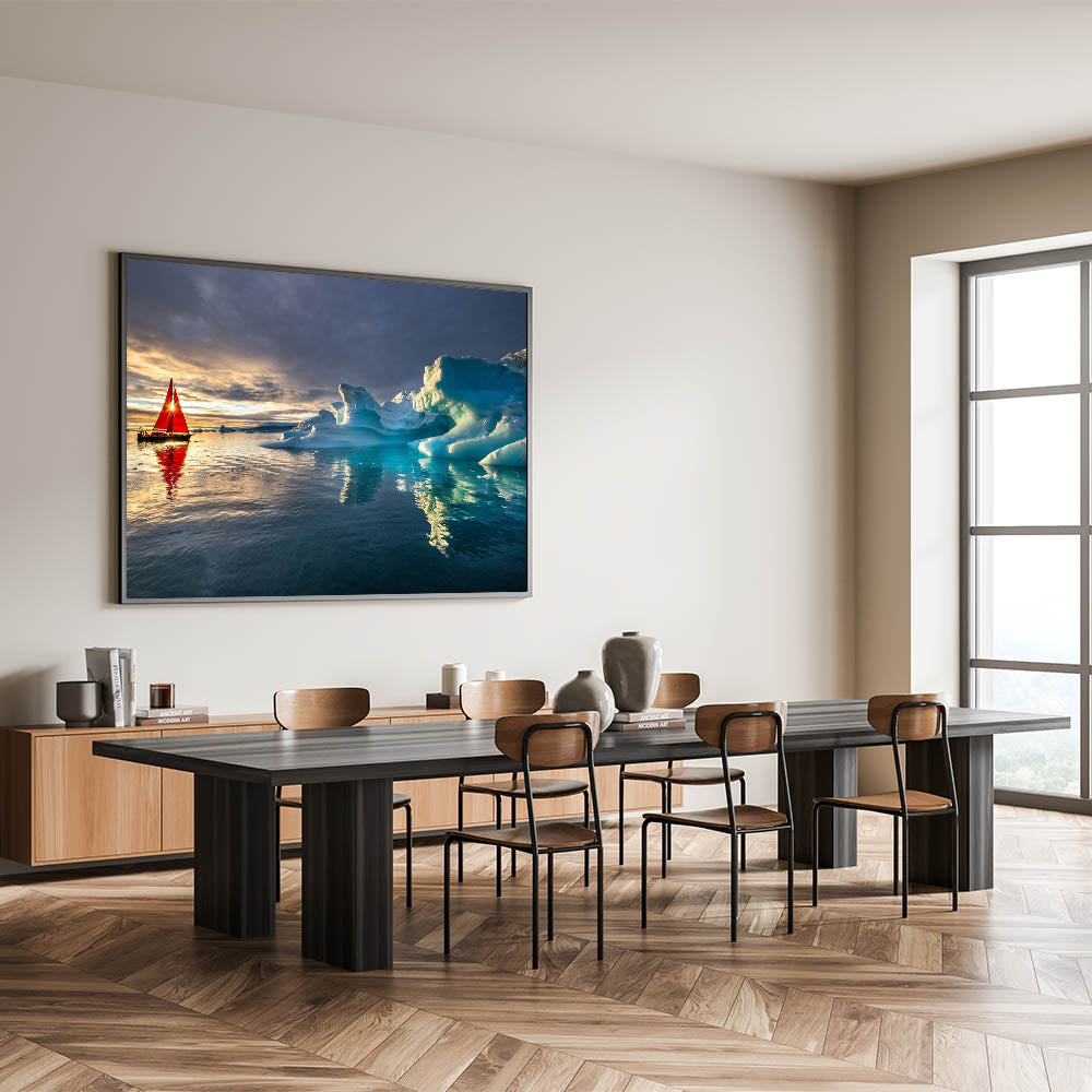 Add a bold touch to your space with this dramatic Greenland Landscape Art, featuring a vibrant red sailboat reflected in the still Arctic waters, framed by towering glaciers. The soft hues of the sunset illuminate the sky, contrasting beautifully with the cool blue tones of the ice, creating a mesmerizing composition. This unique piece of Arctic Scenery Wall Decor is perfect for those seeking to bring the wild beauty of Greenland’s Arctic region into their home or office.