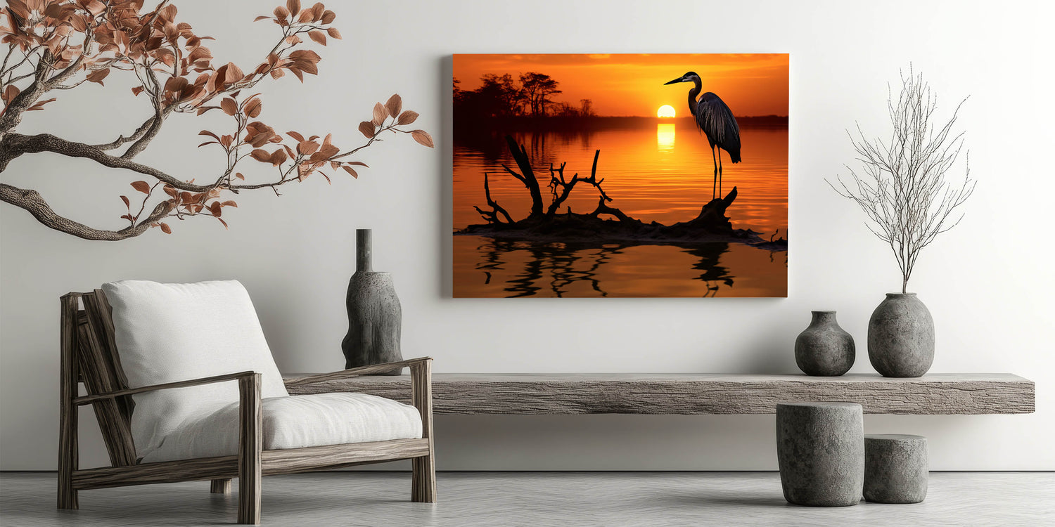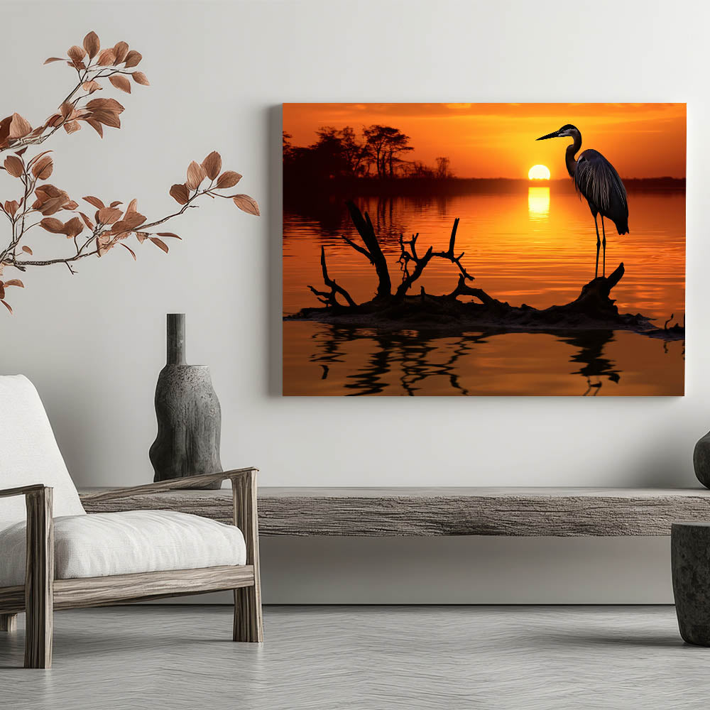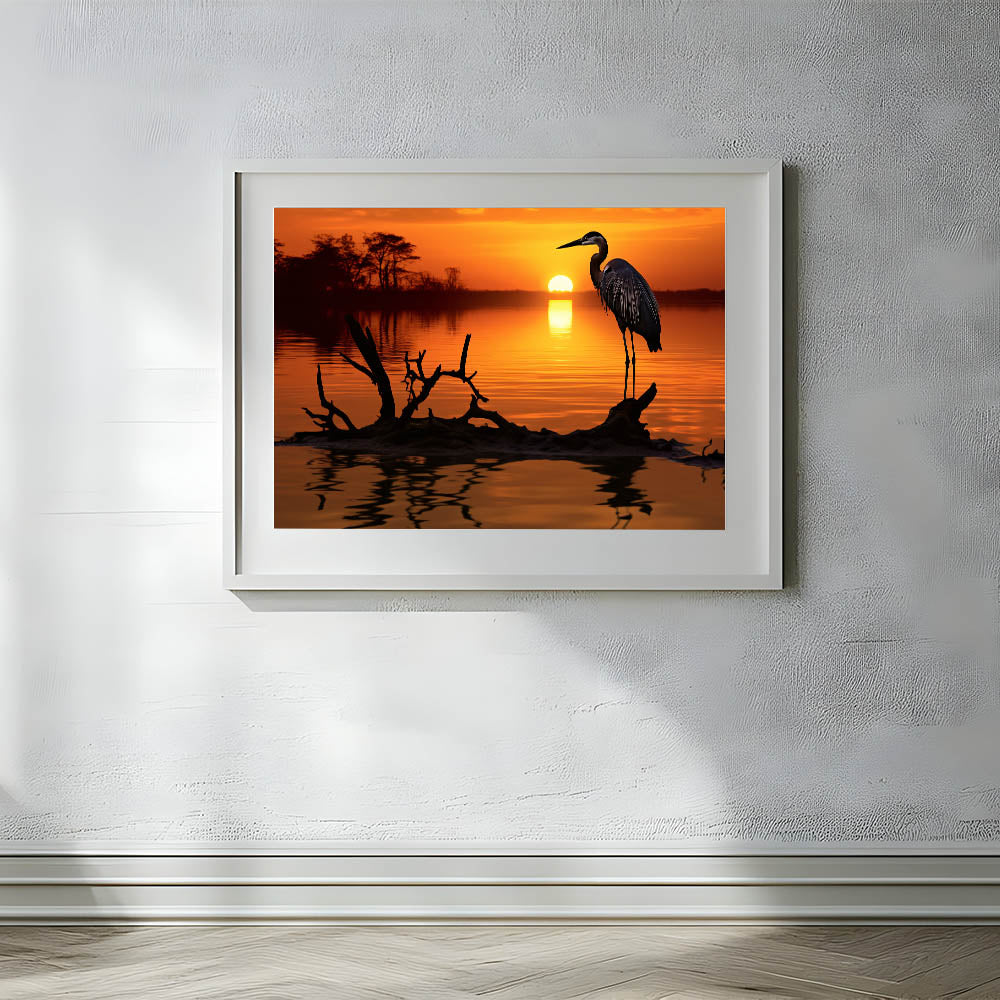 Heron Sunset Wall Art - Majestic Heron in Fiery Sunset Silhouette